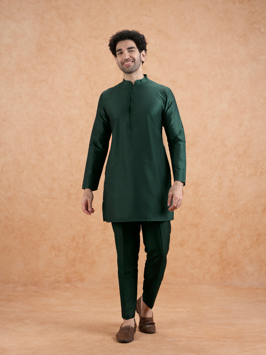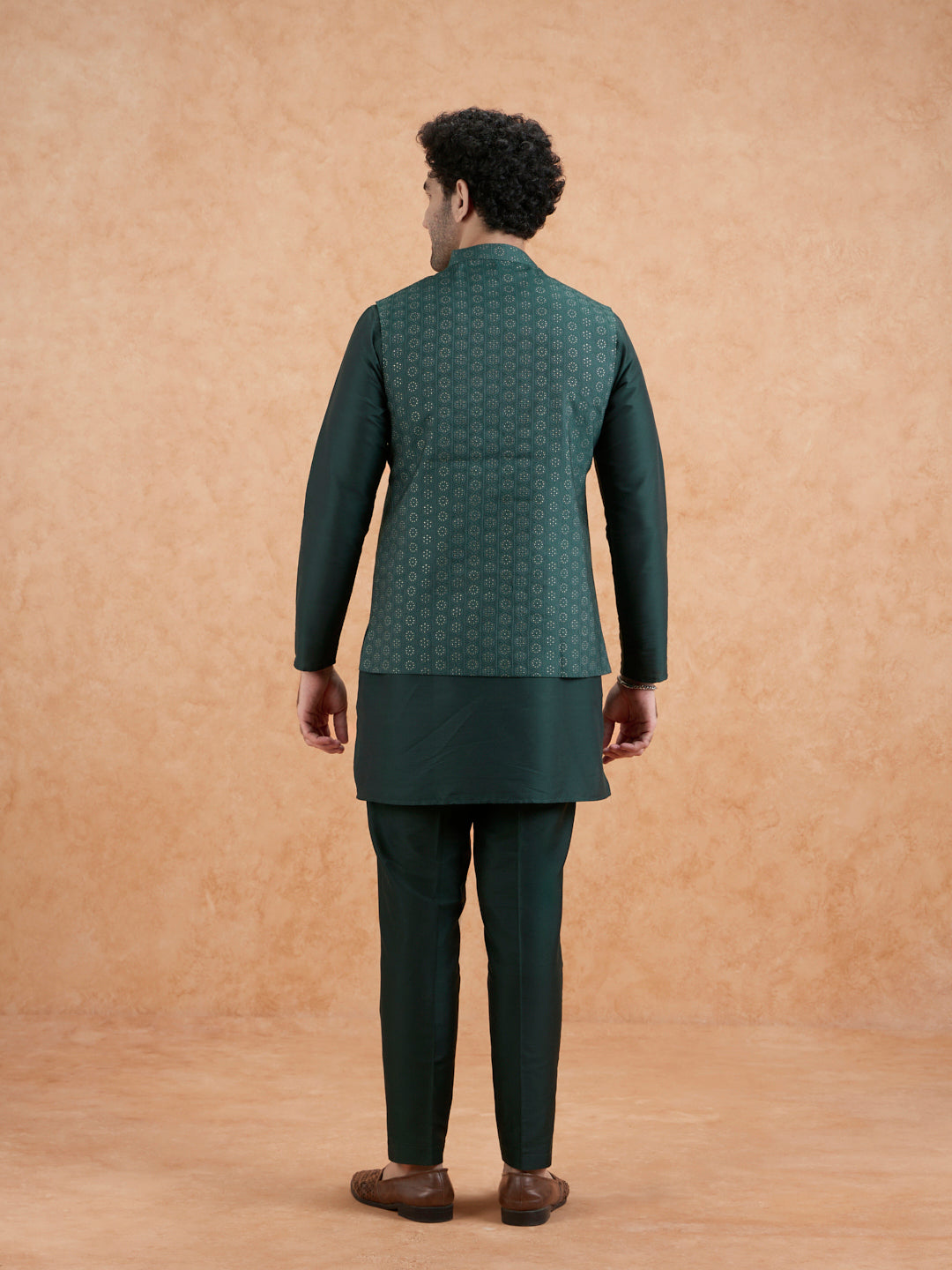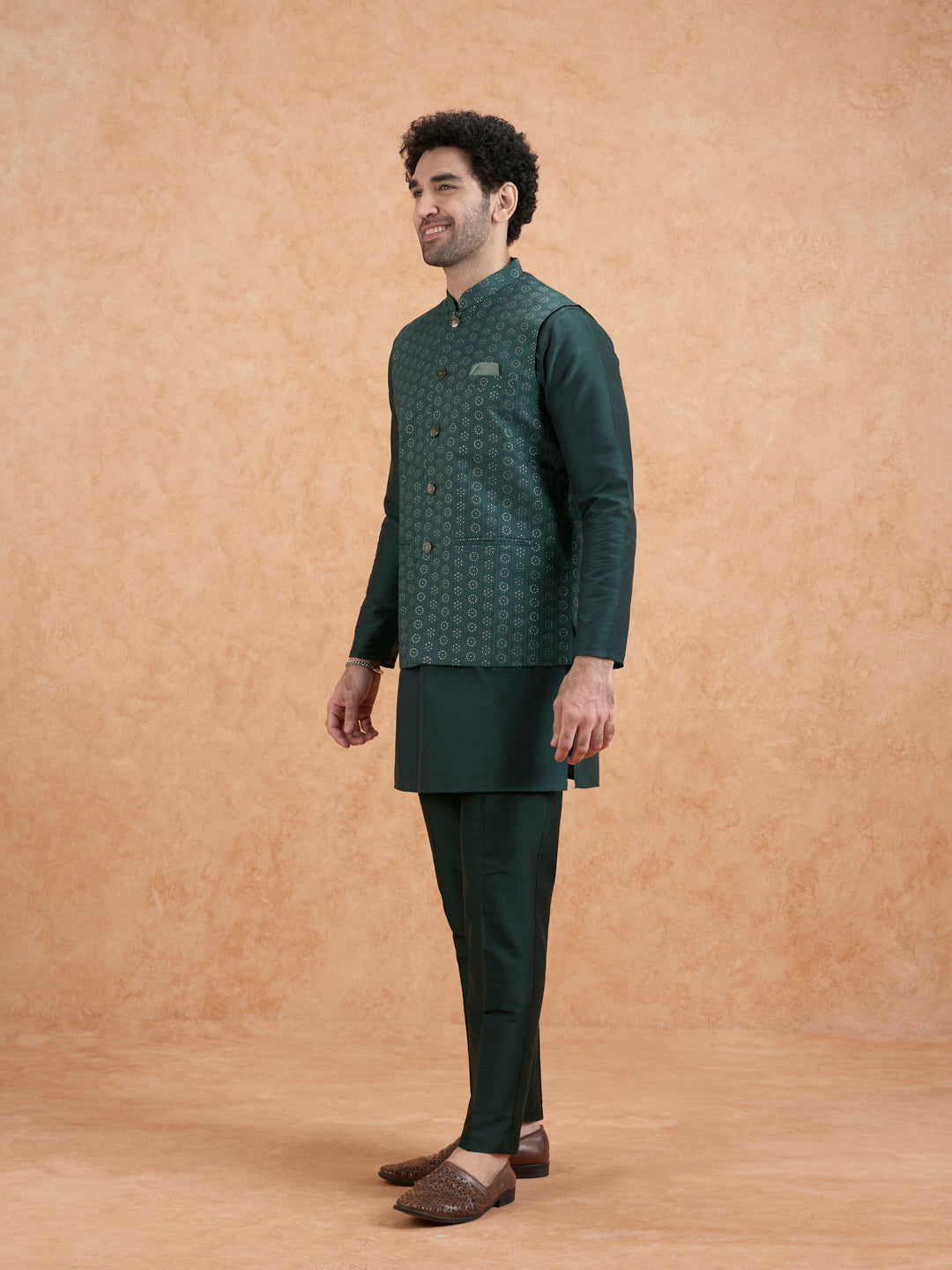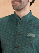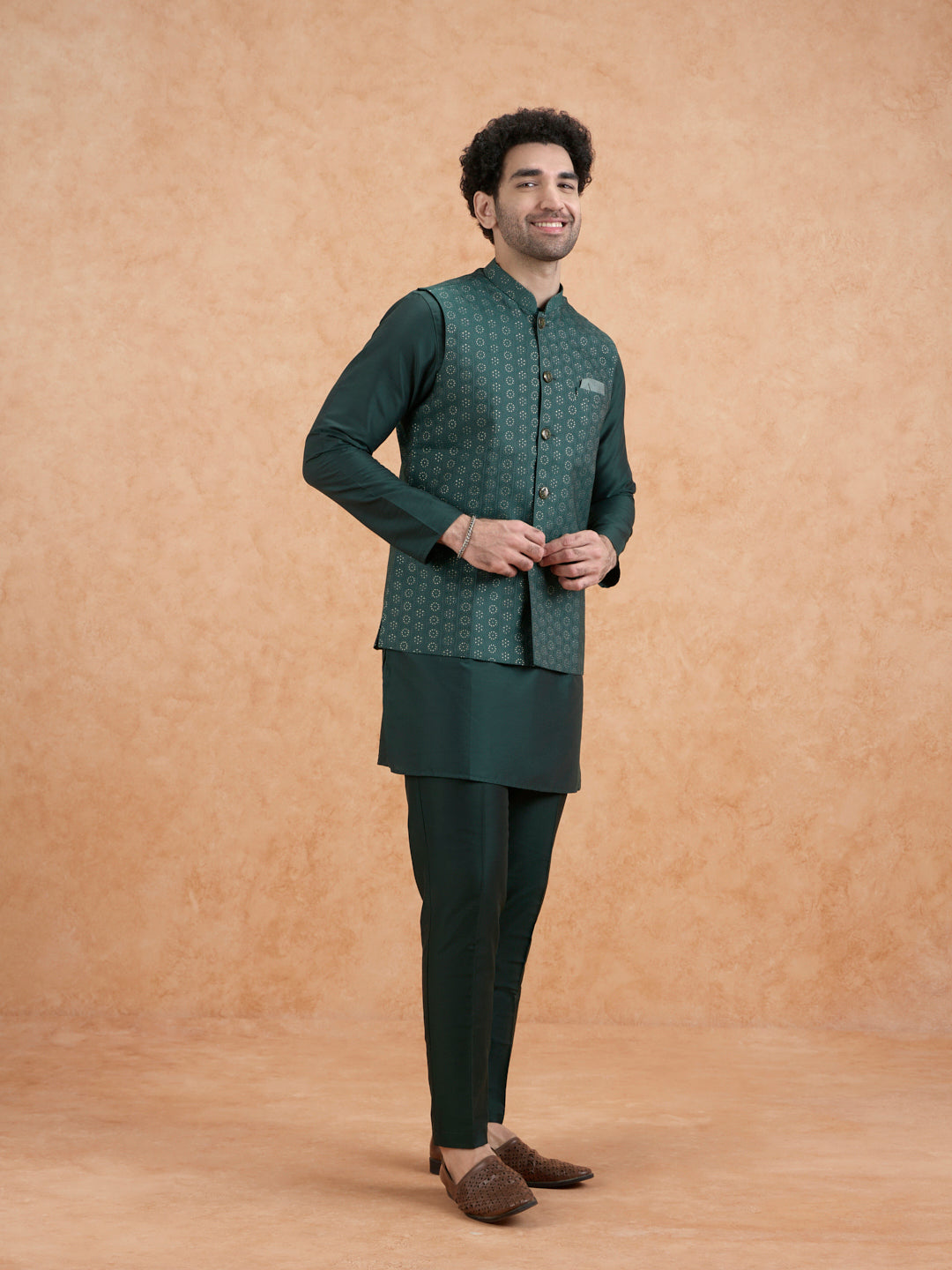 Green mid kurta jacket trouser set for men rich brocade jacket with cotton-blend base, perfect for weddings and festive events.