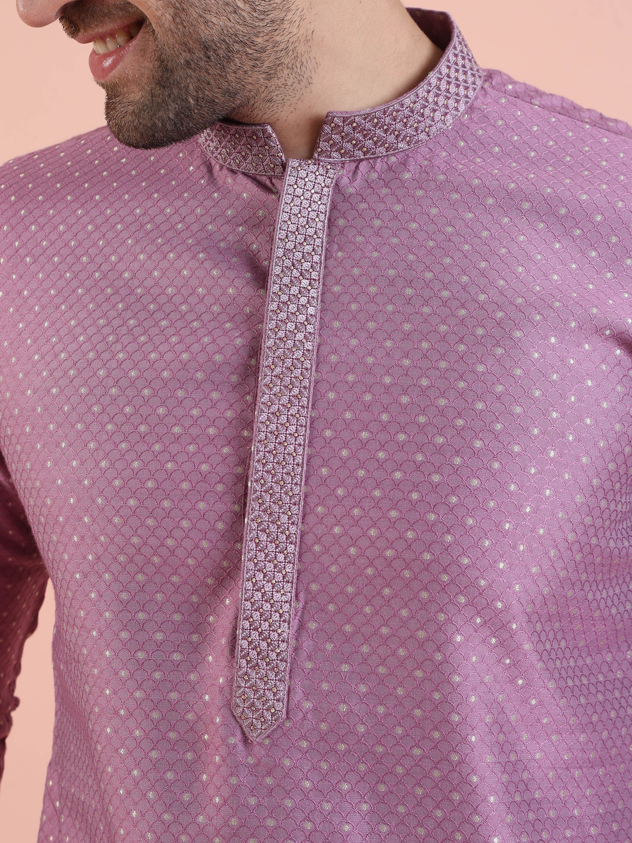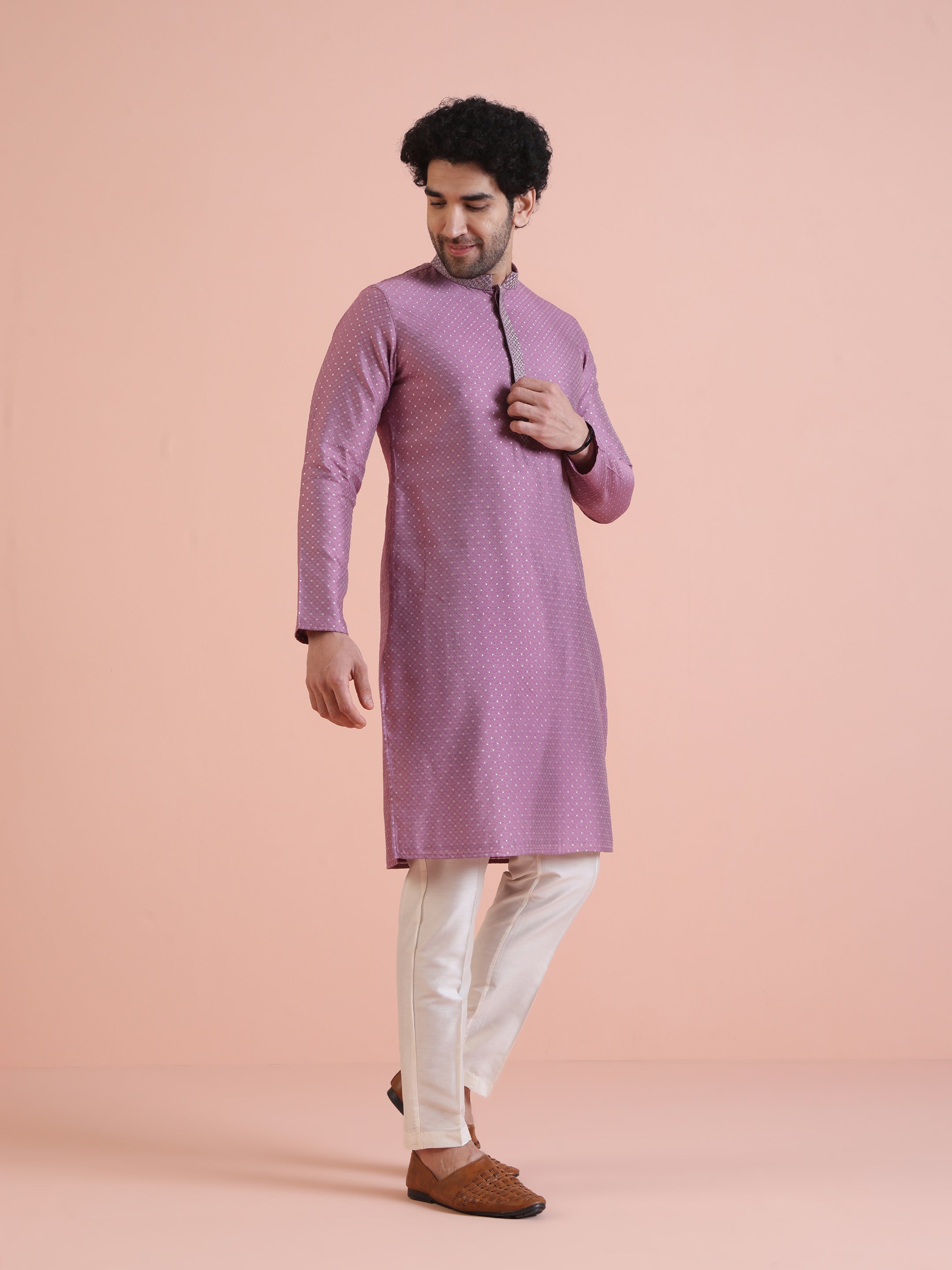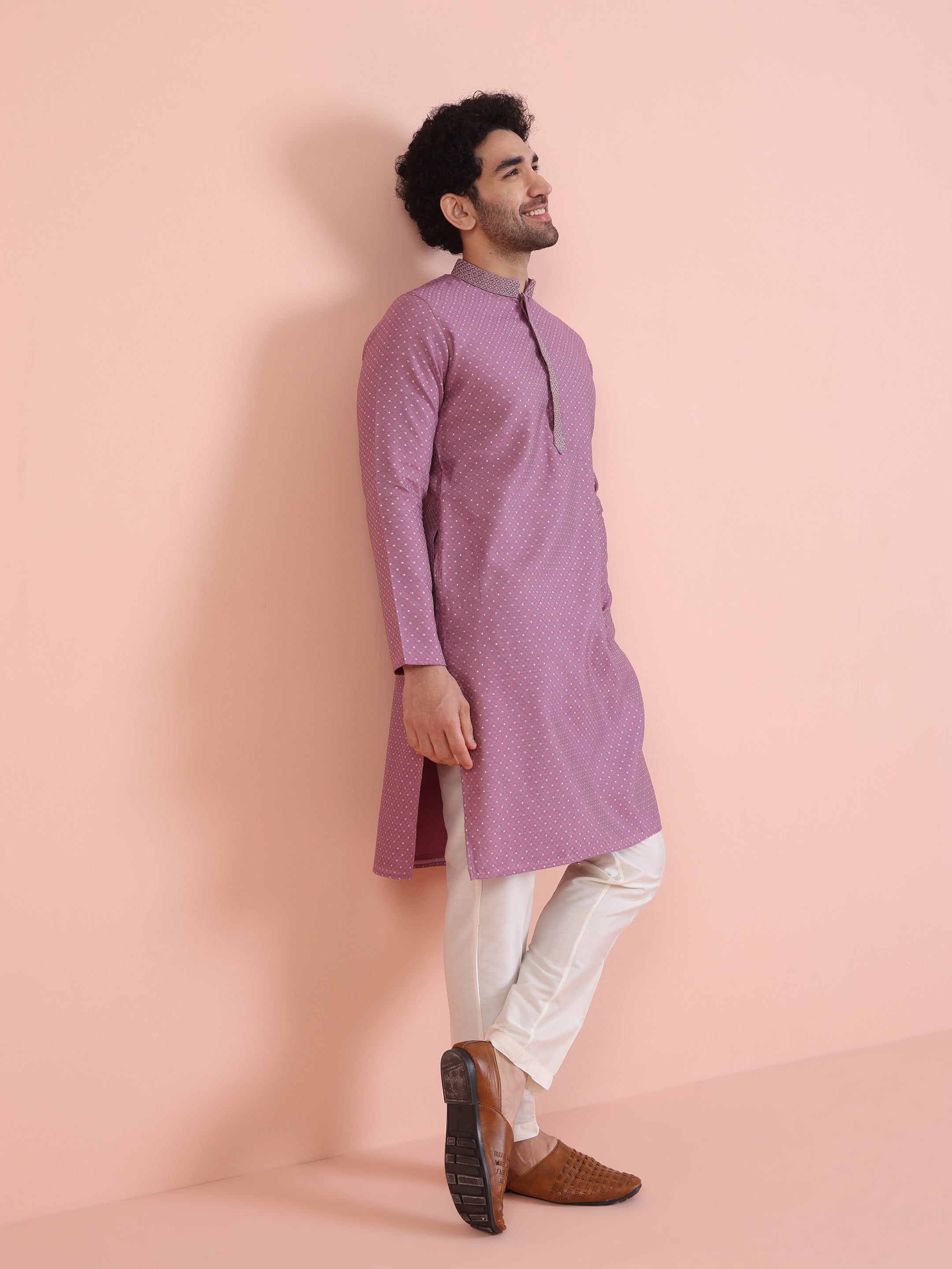 Experience classic elegance with this Men Mauve Jacquard Kurta Trouser Set with Thread Work. The breathable Silk Blend fabric ensures comfort throughout the day. Ideal for festive events or casual wear.