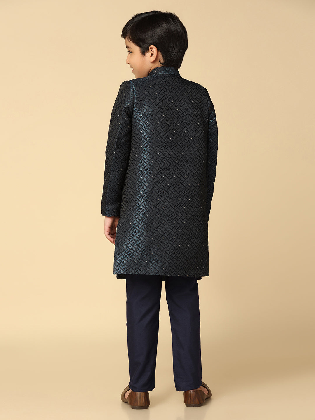 Experience classic elegance with this Kisah Boy's Turquoise Blue Silk Blend Embellished Indo Western Pyjama Set. The breathable fabric ensures comfort throughout the day. Ideal for festive events or casual wear.