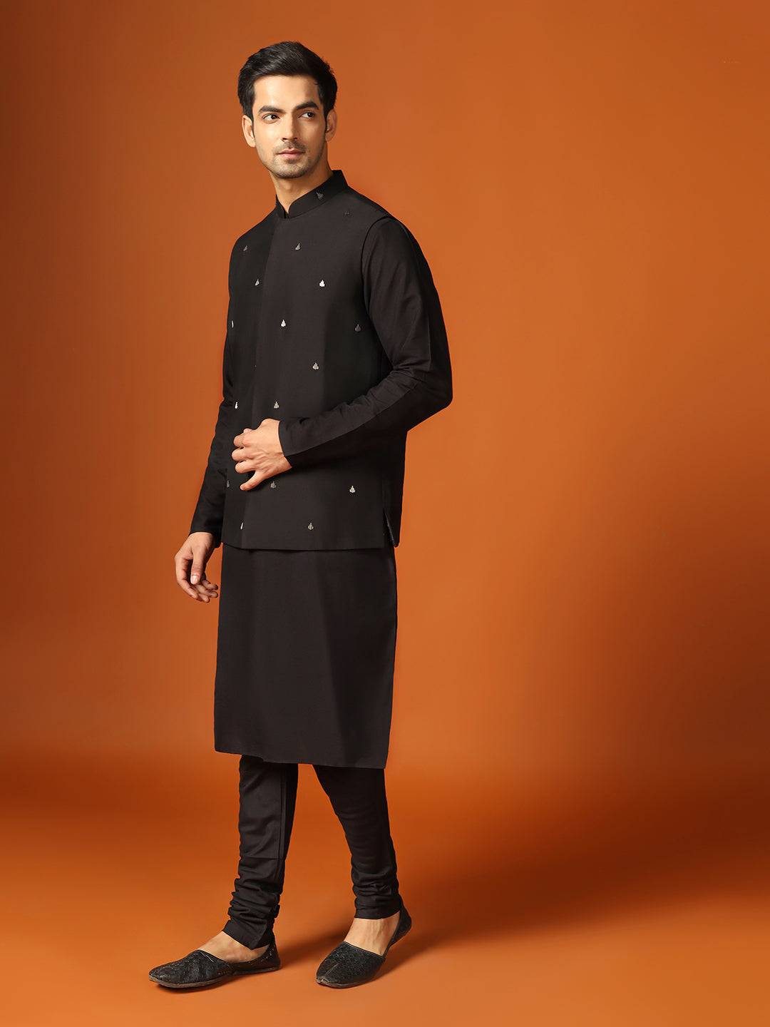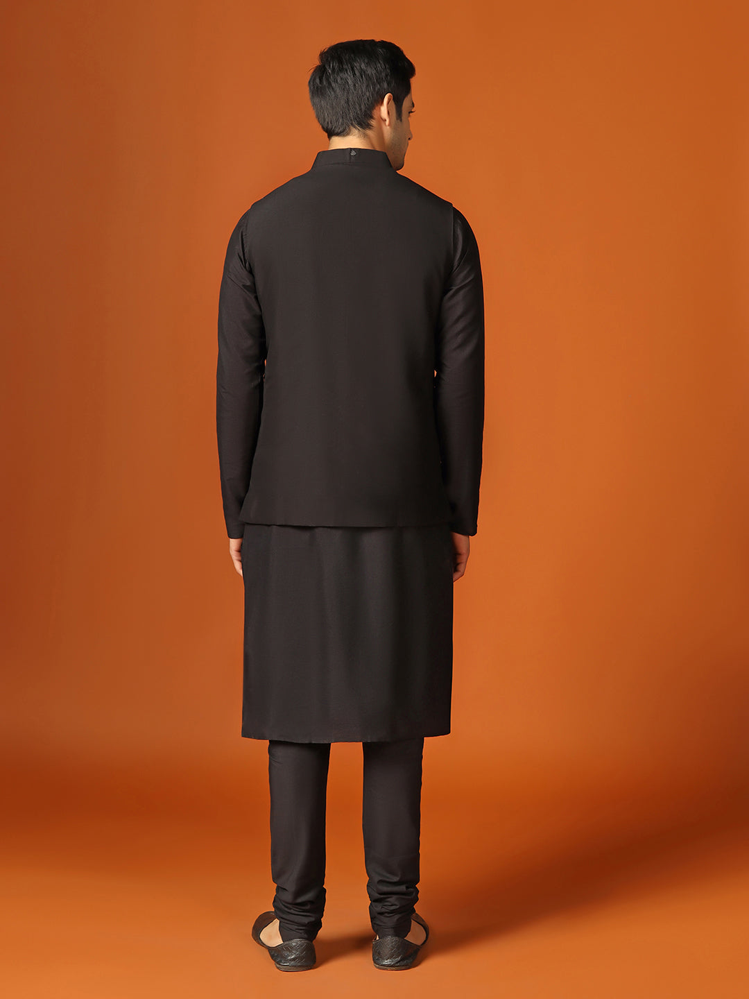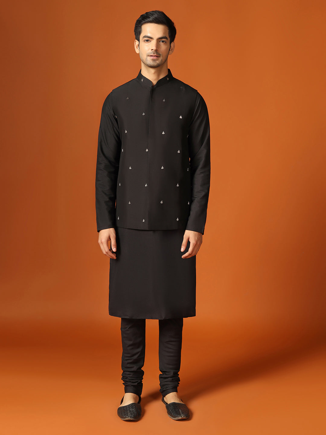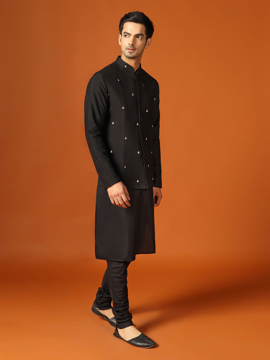 Men Black Kurta Jacket Churidar Set