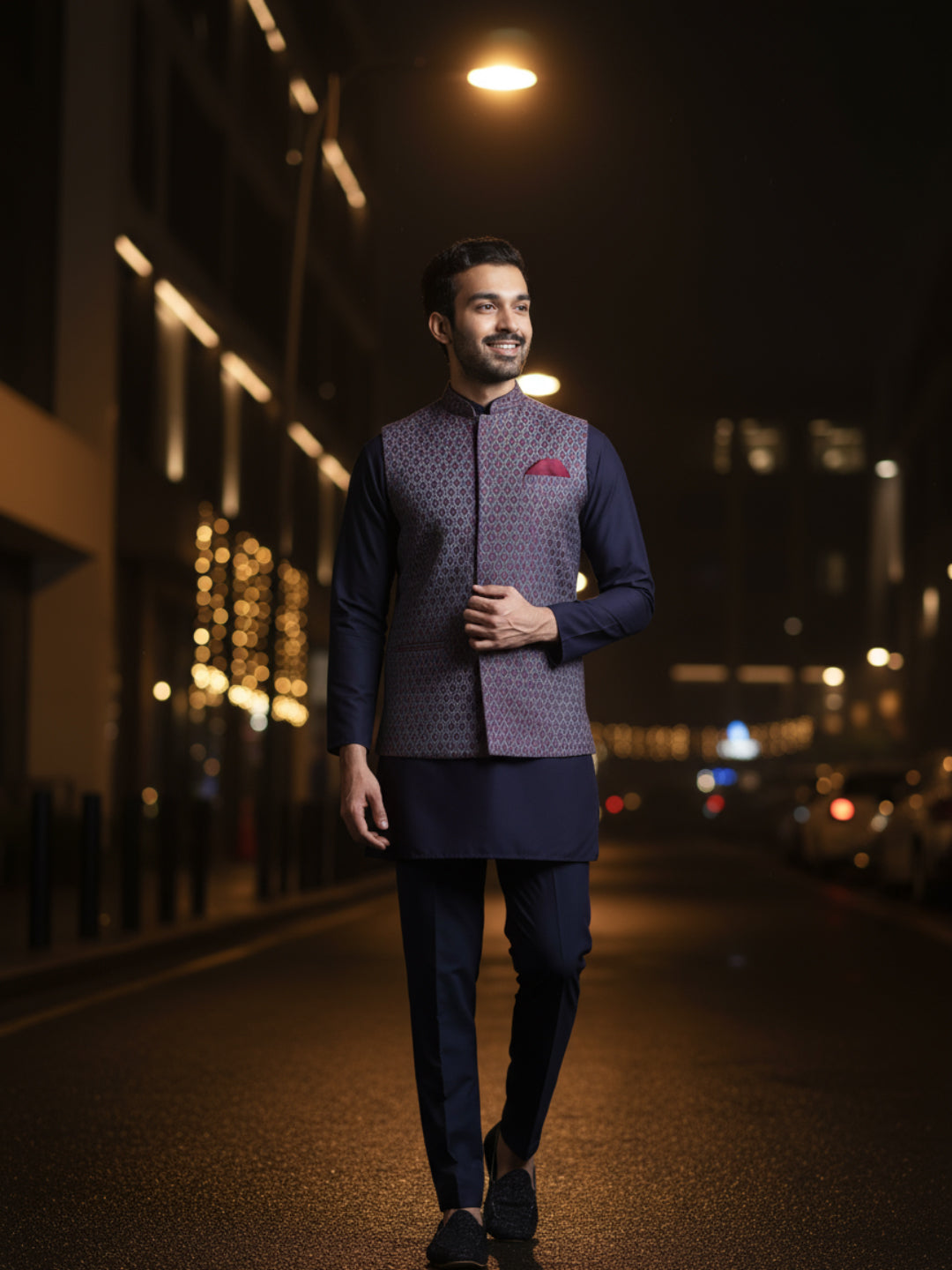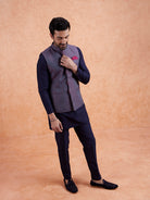 Maroon Silk Blend Jacquard Mid Kurta Jacket Trouser Set, Perfect festive ethnic wear for men, ideal festive and casual occasions.