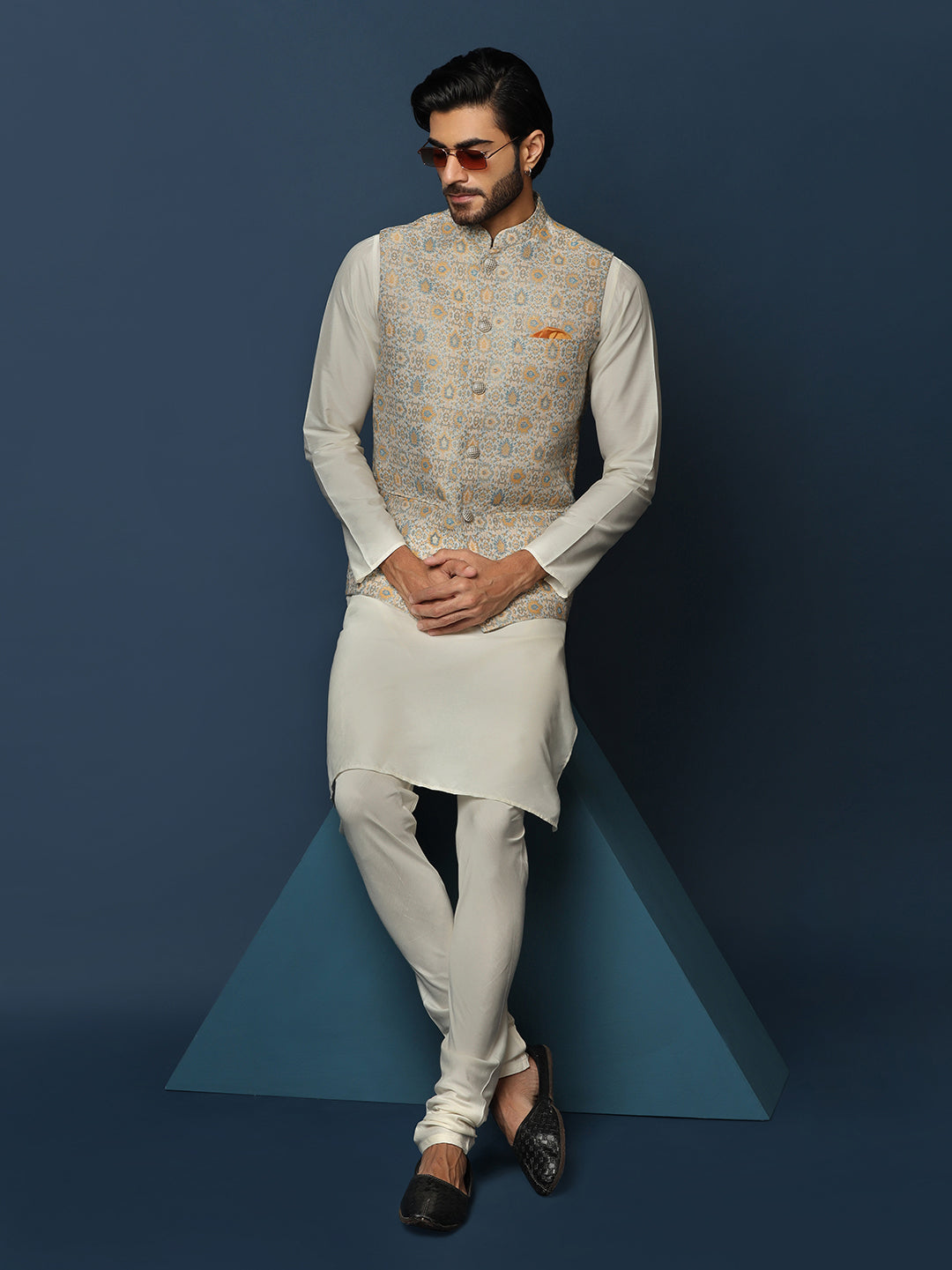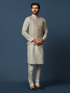 Mustard Silk Blend Jacquard Kurta Jacket Churidar Set, Perfect festive ethnic wear for men, ideal festive and casual occasions.
