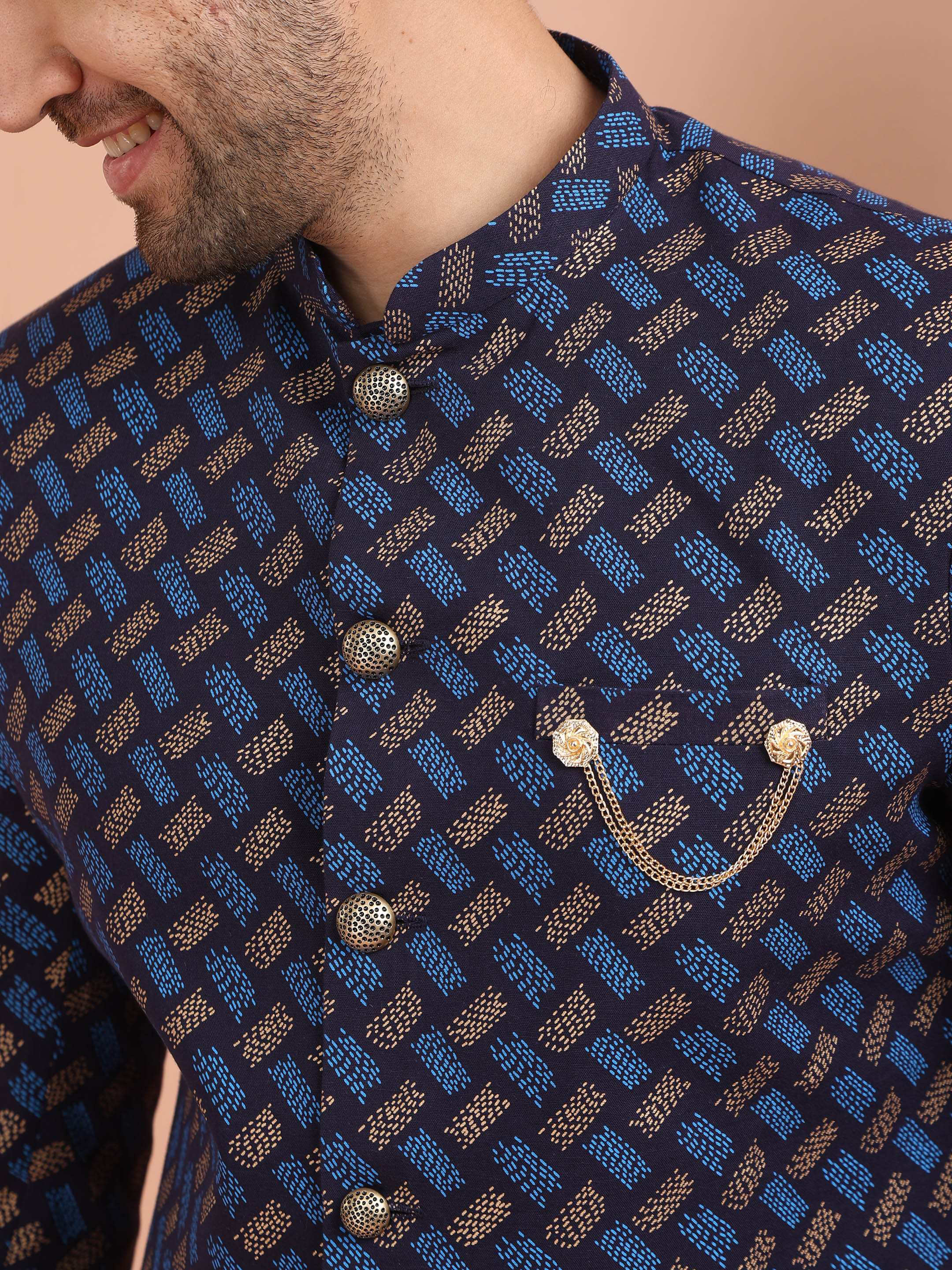 Royal navy blue sherwani with gold brocade design and ivory wide-leg trousers — a perfect balance of tradition and modern sophistication.