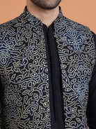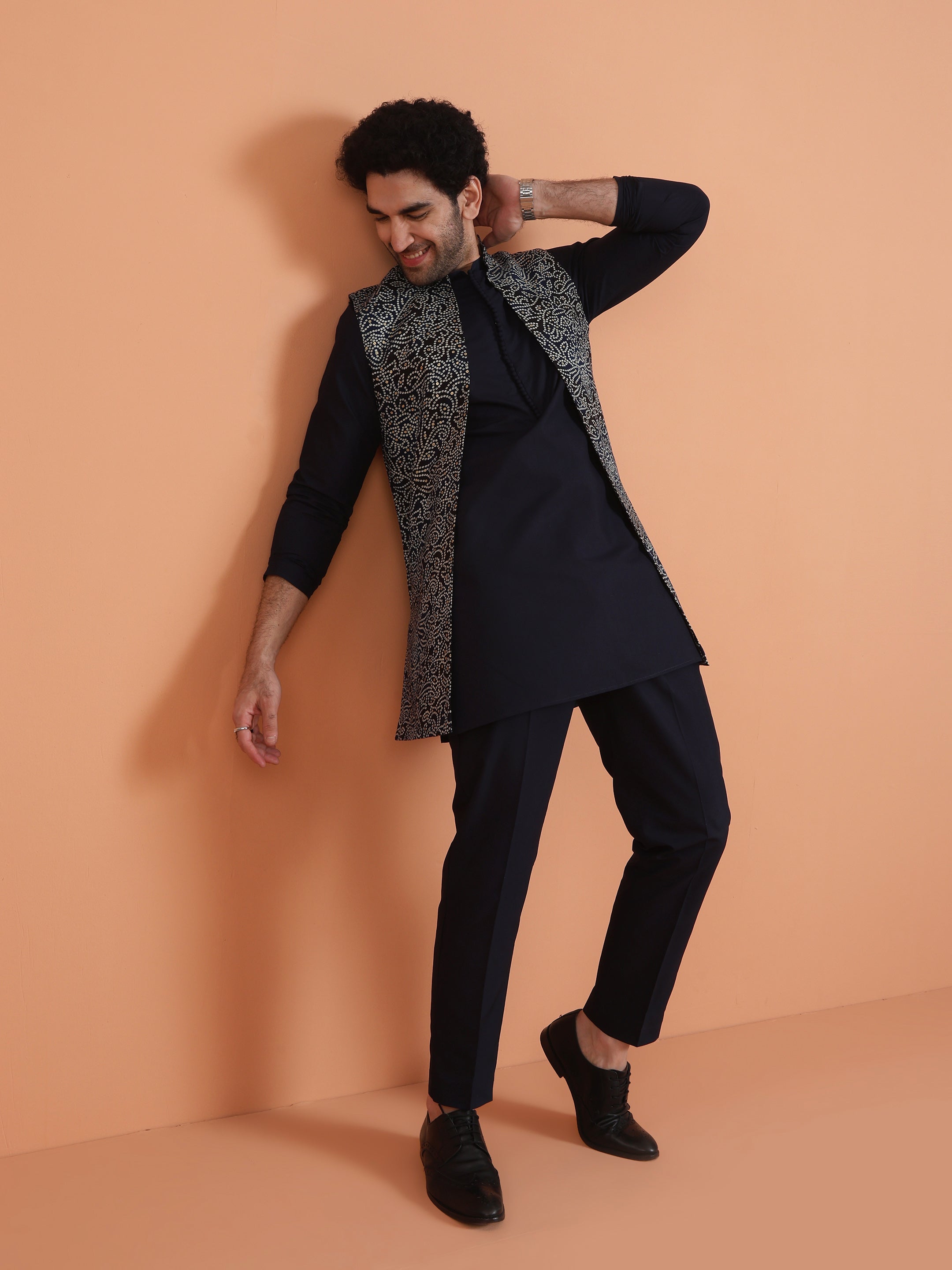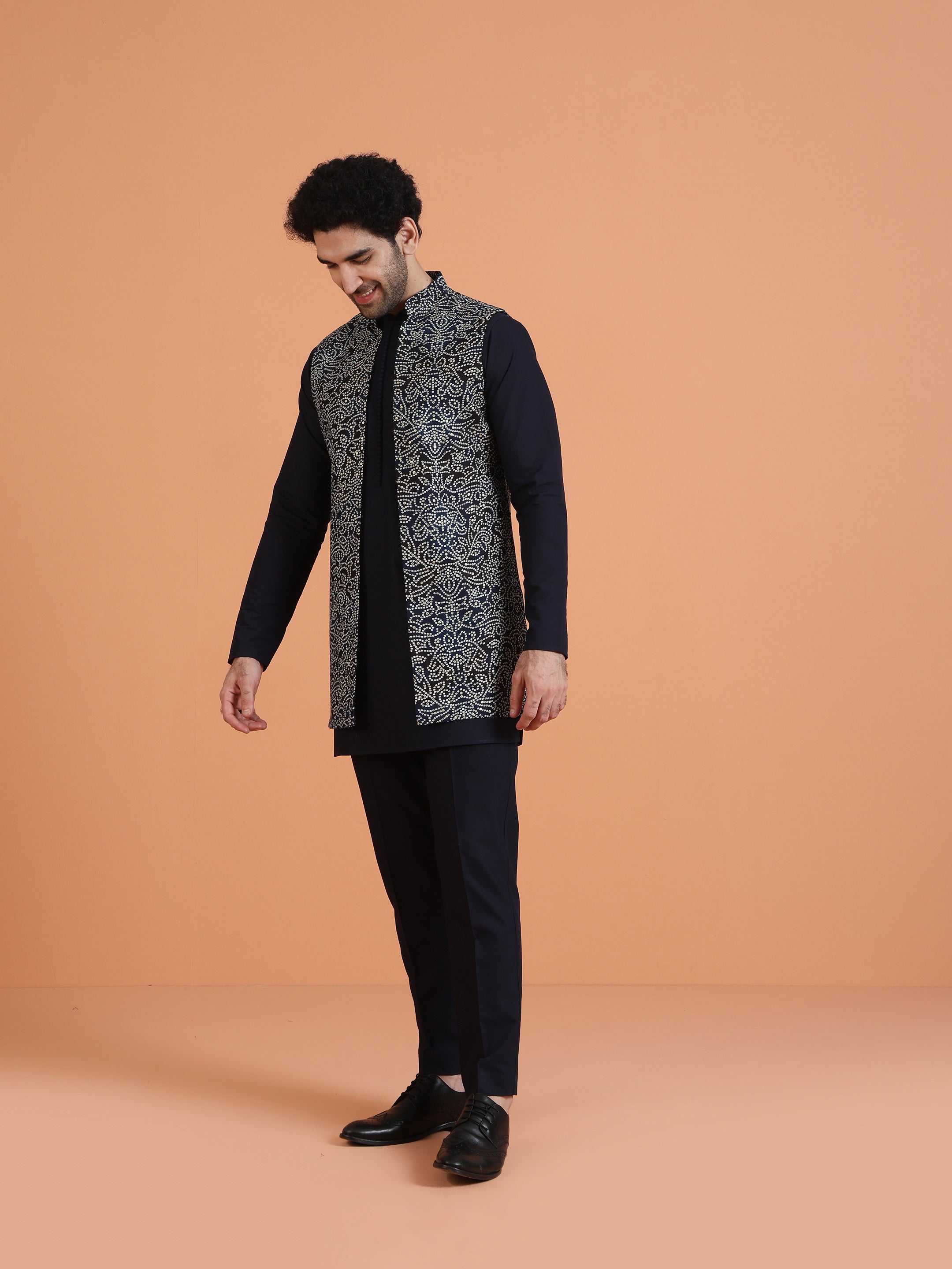 Navy blue long jacket with mirror work, paired with mid kurta and trouser. Modern Indo-western set in cotton silk blend for weddings & festive wear.