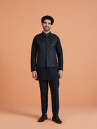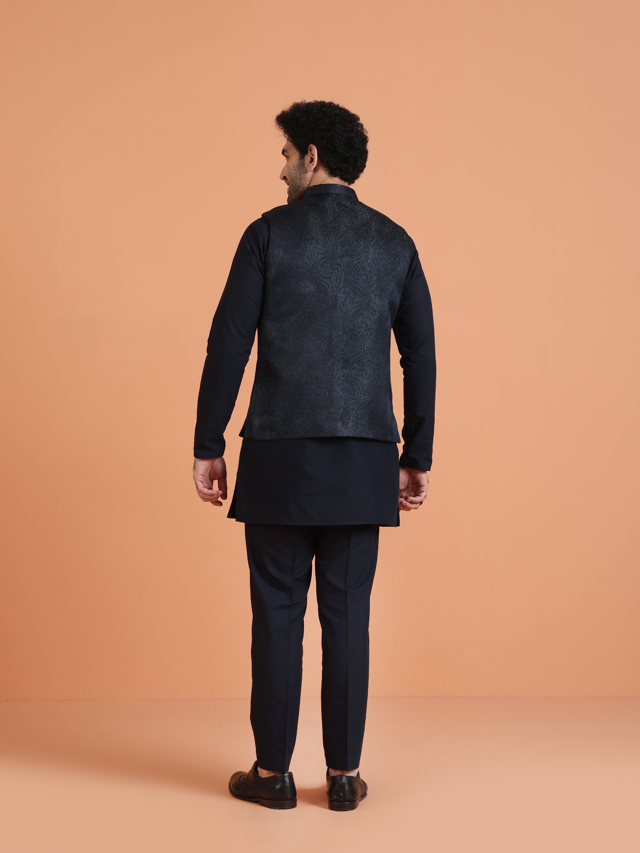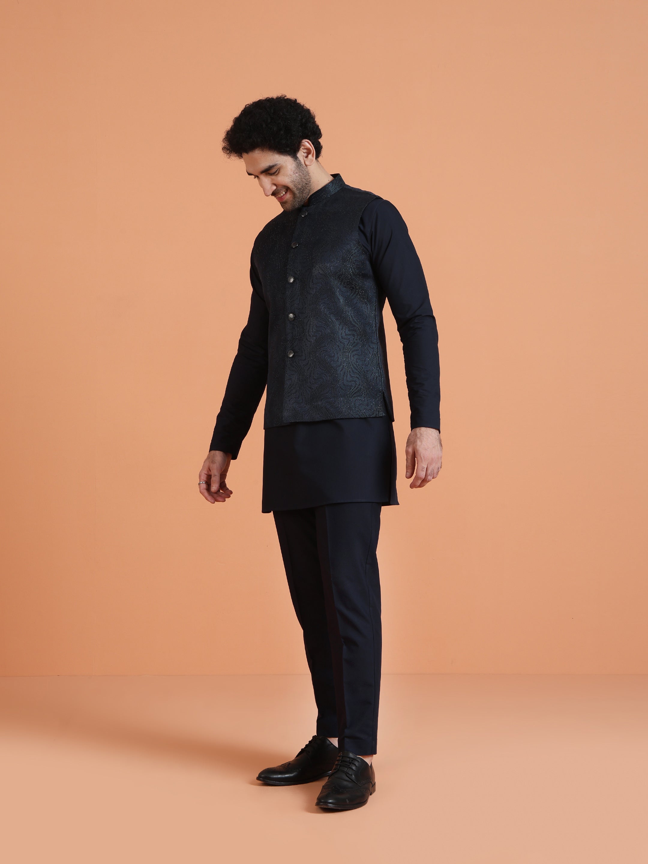 Navy blue mid kurta with metallic textured Nehru jacket and trouser set. Elegant Indo-western festive wear for weddings, receptions & parties.