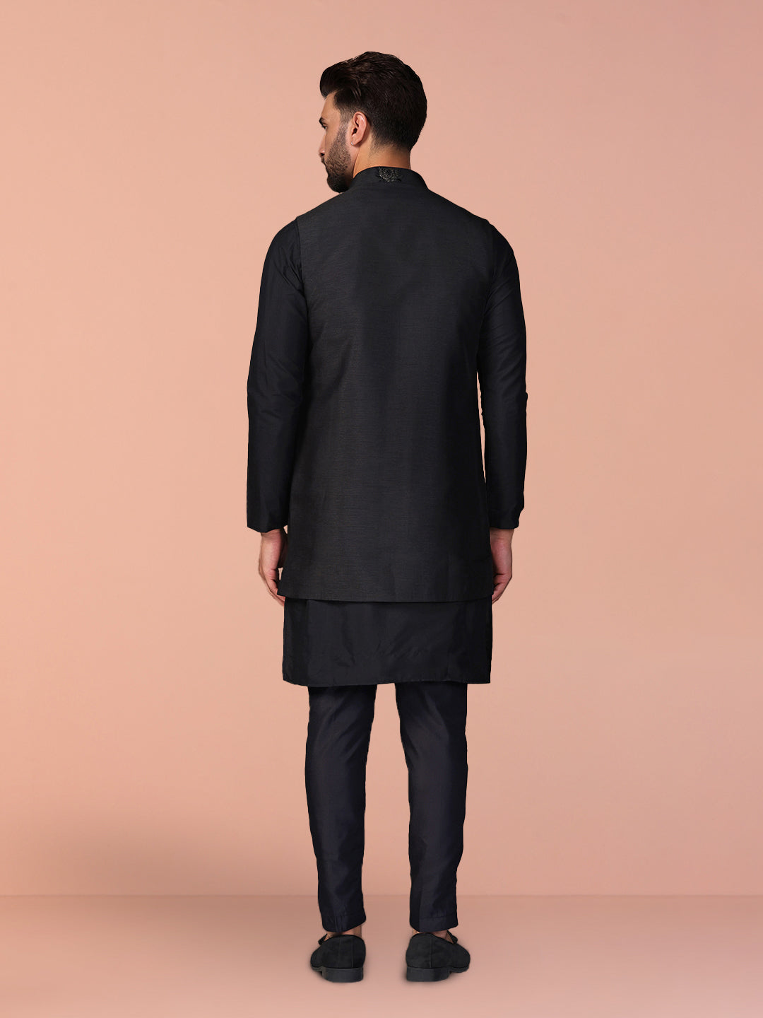 If there's one thing that'll always be in style it's a classic Black Kurta. This Black Kurta Jacket Set redefines effortless sophistication with its elegant mandarin collar and full-sleeve woven design. Crafted from breathable fabric, it offers both style and comfort. Whether you're headed to a casual gathering or something more formal, this set has you covered. Tailored to perfection, you'll feel as good as you look.