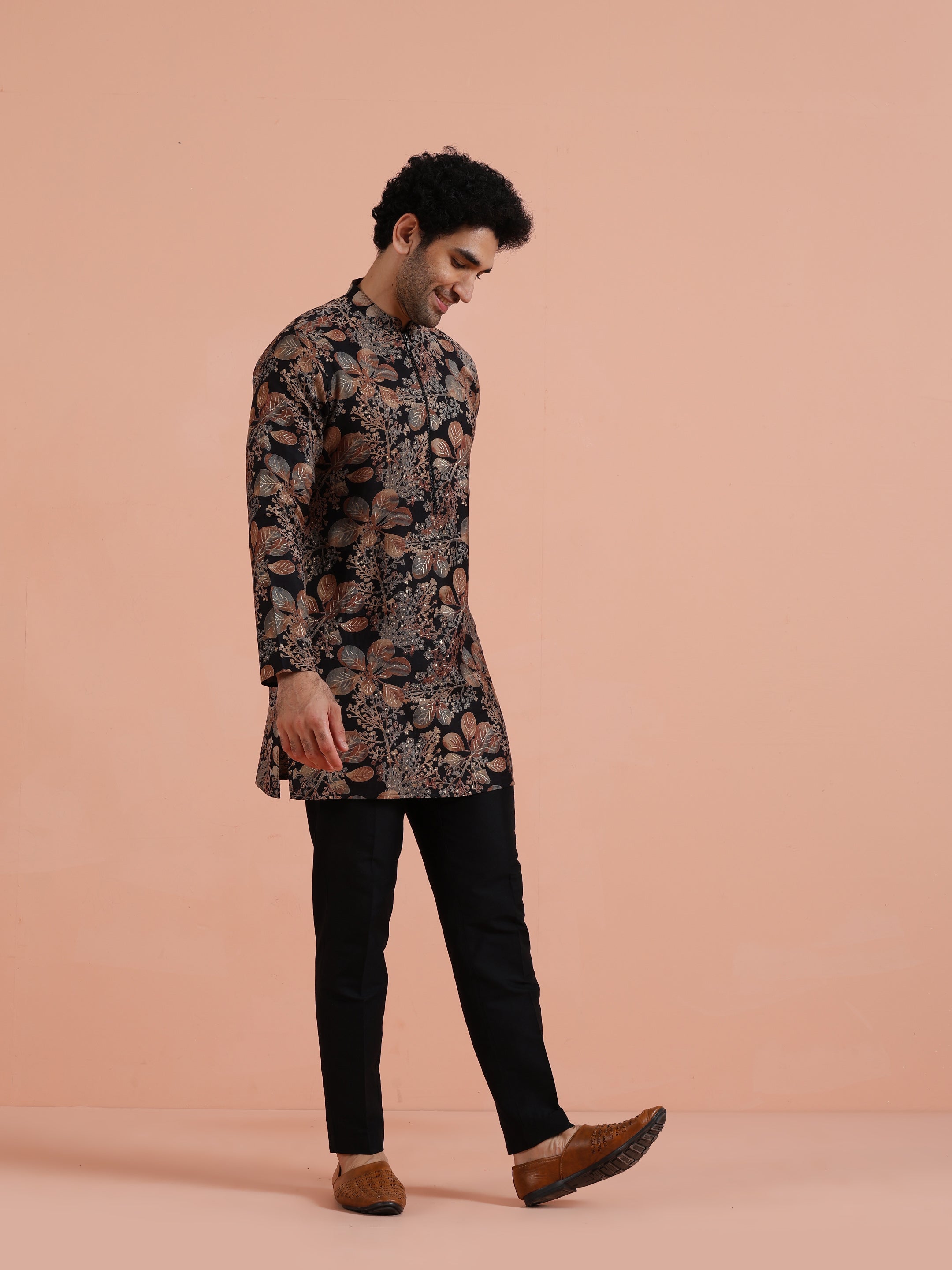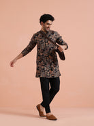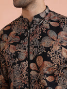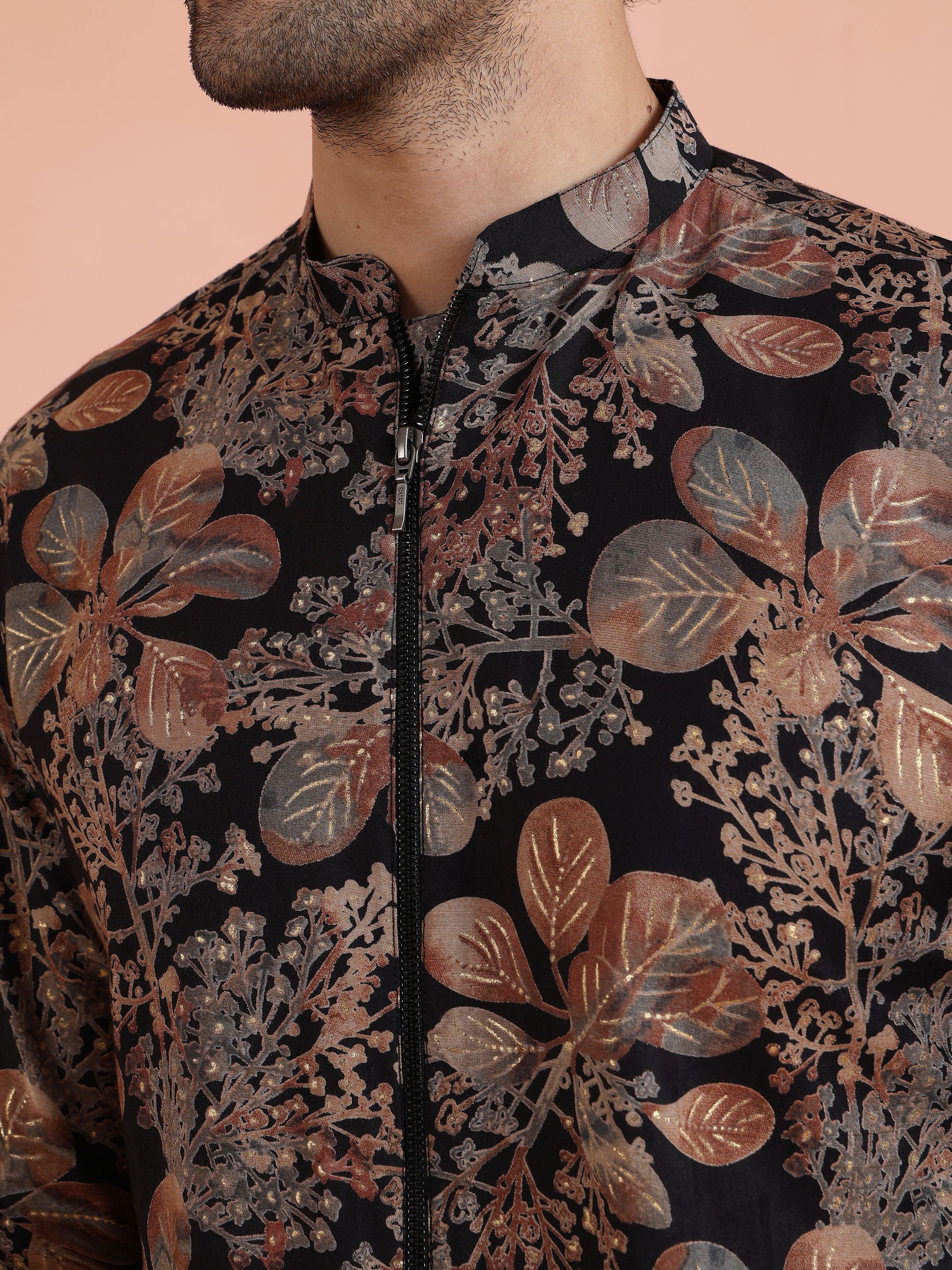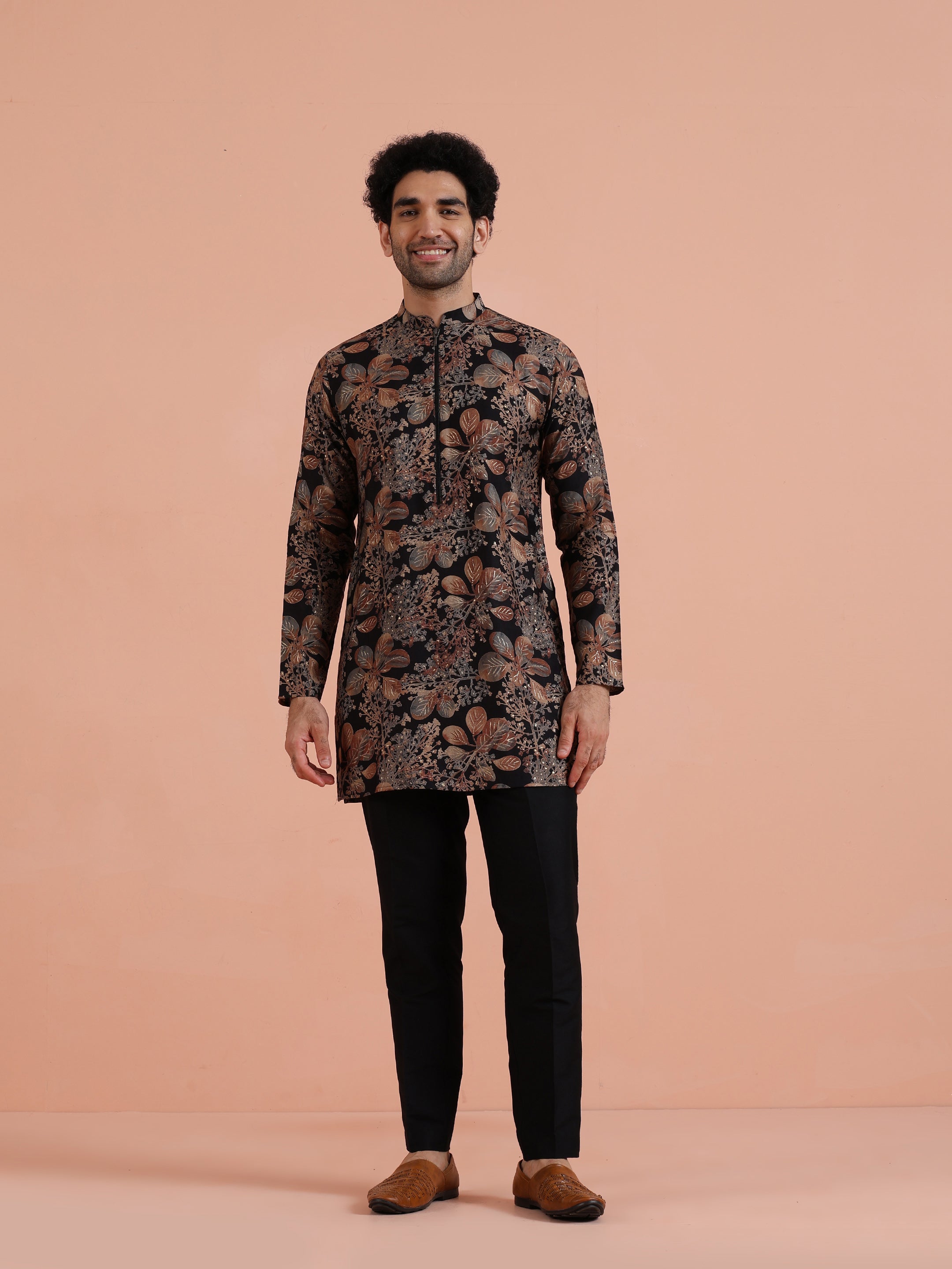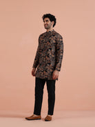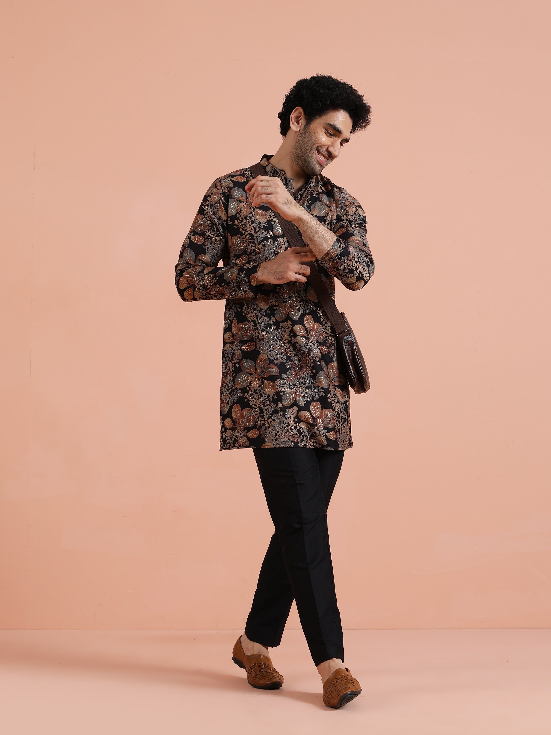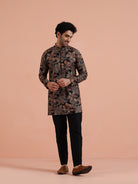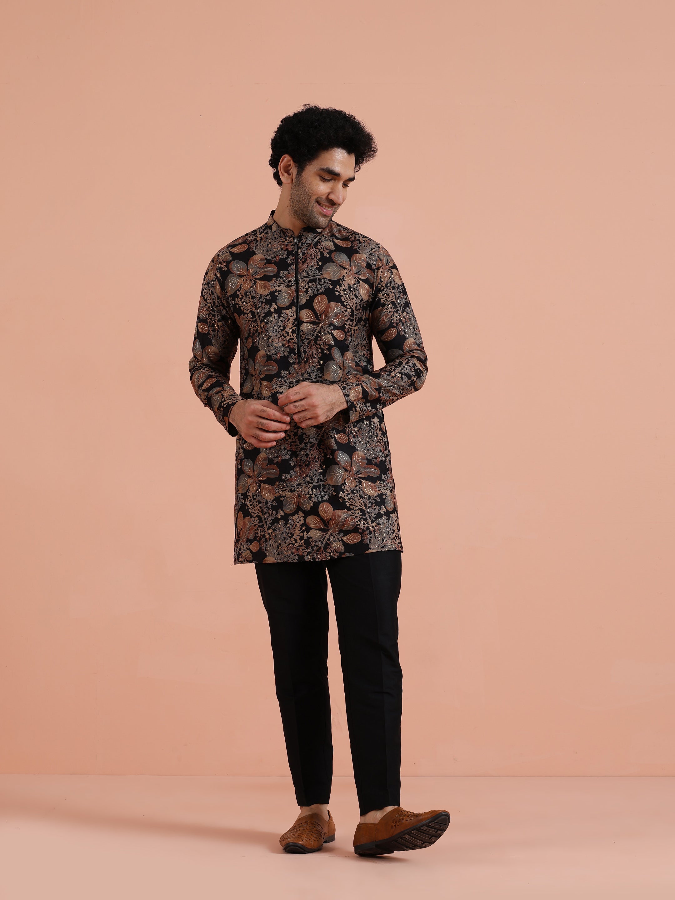 Black kurta adorned with golden brown floral motifs for a rich, traditional look. Featuring a unique zip placket that adds a modern twist, this kurta is crafted from a comfortable cotton-silk blend fabric that offers a subtle sheen—perfect for festive and formal occasions.