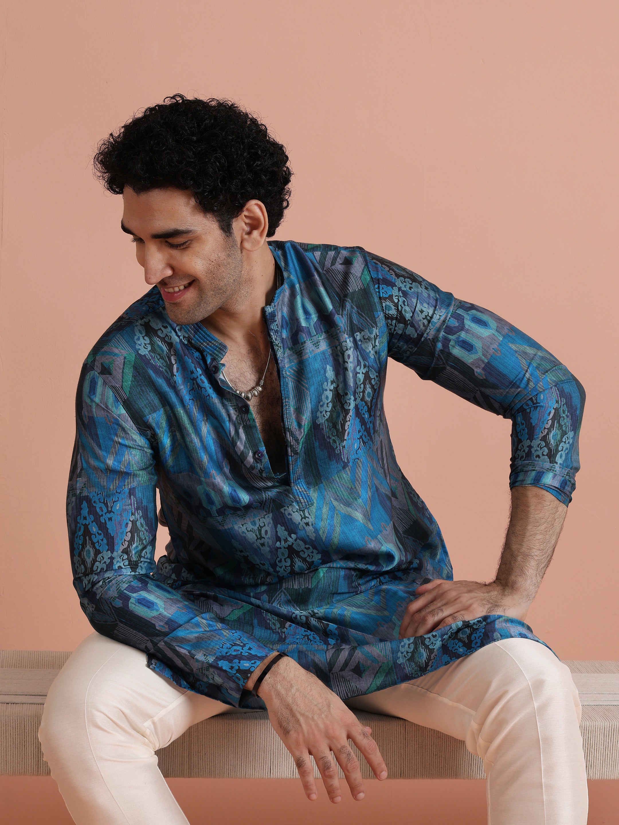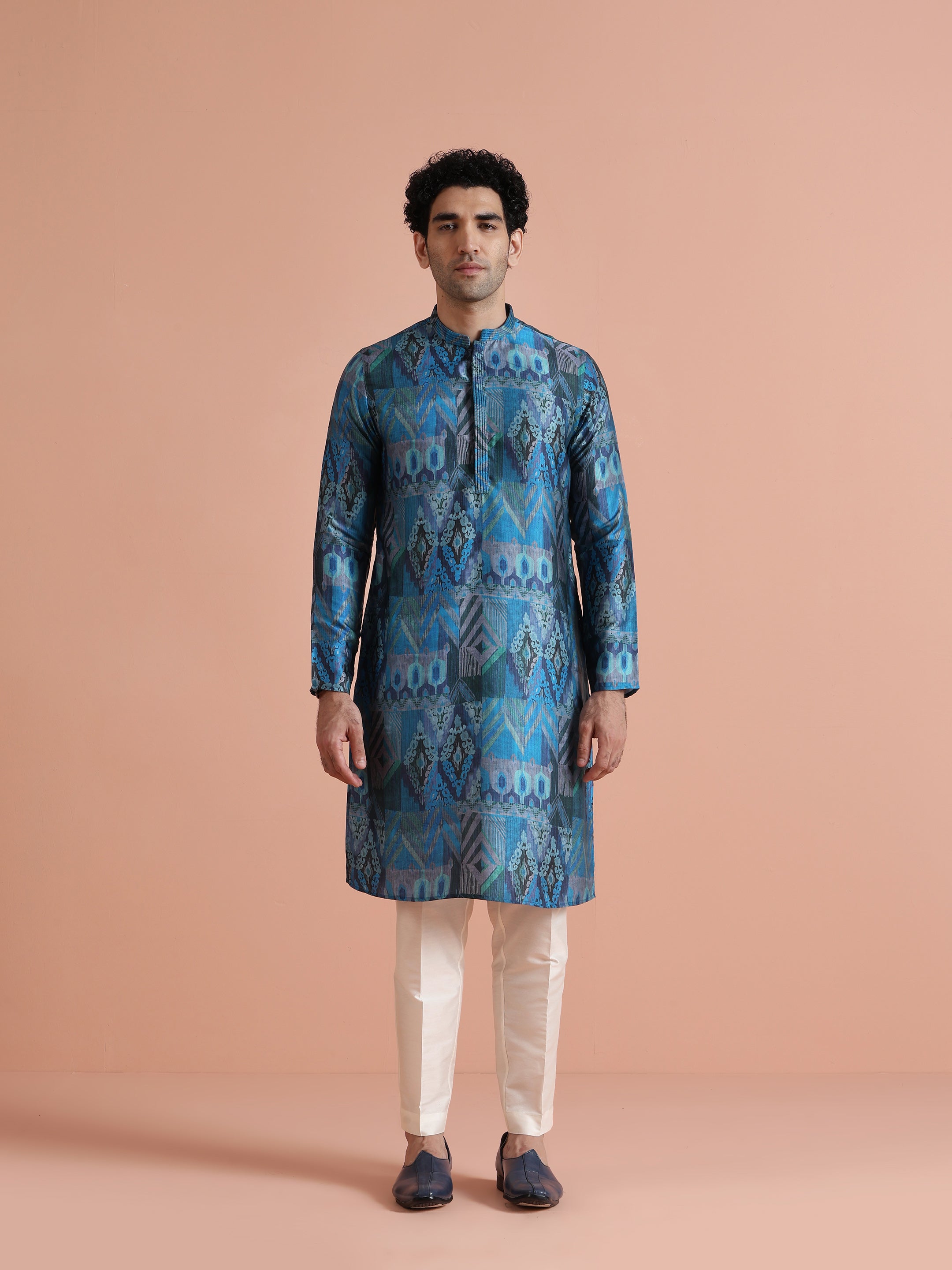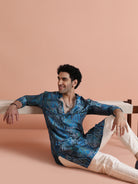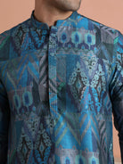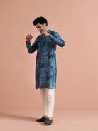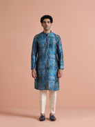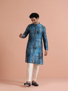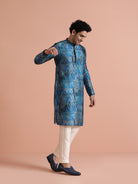 Kisah Menss Blue Polyviscose Printed Kurta with Cream Trouser Elegant kurta trouser set for festive occasions, weddings, and pujas.