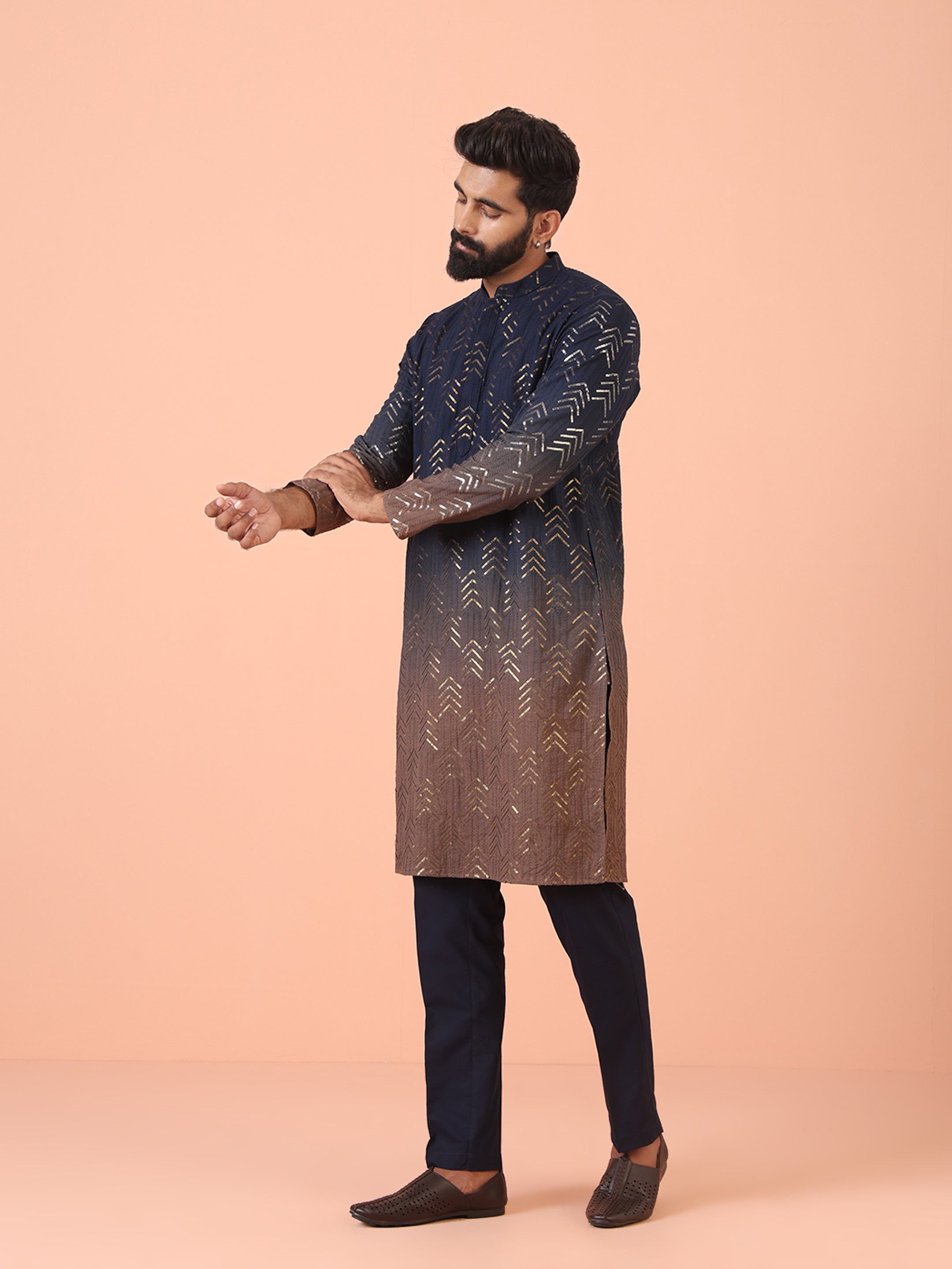 Navy Ombre Golden Print Silk Kurta