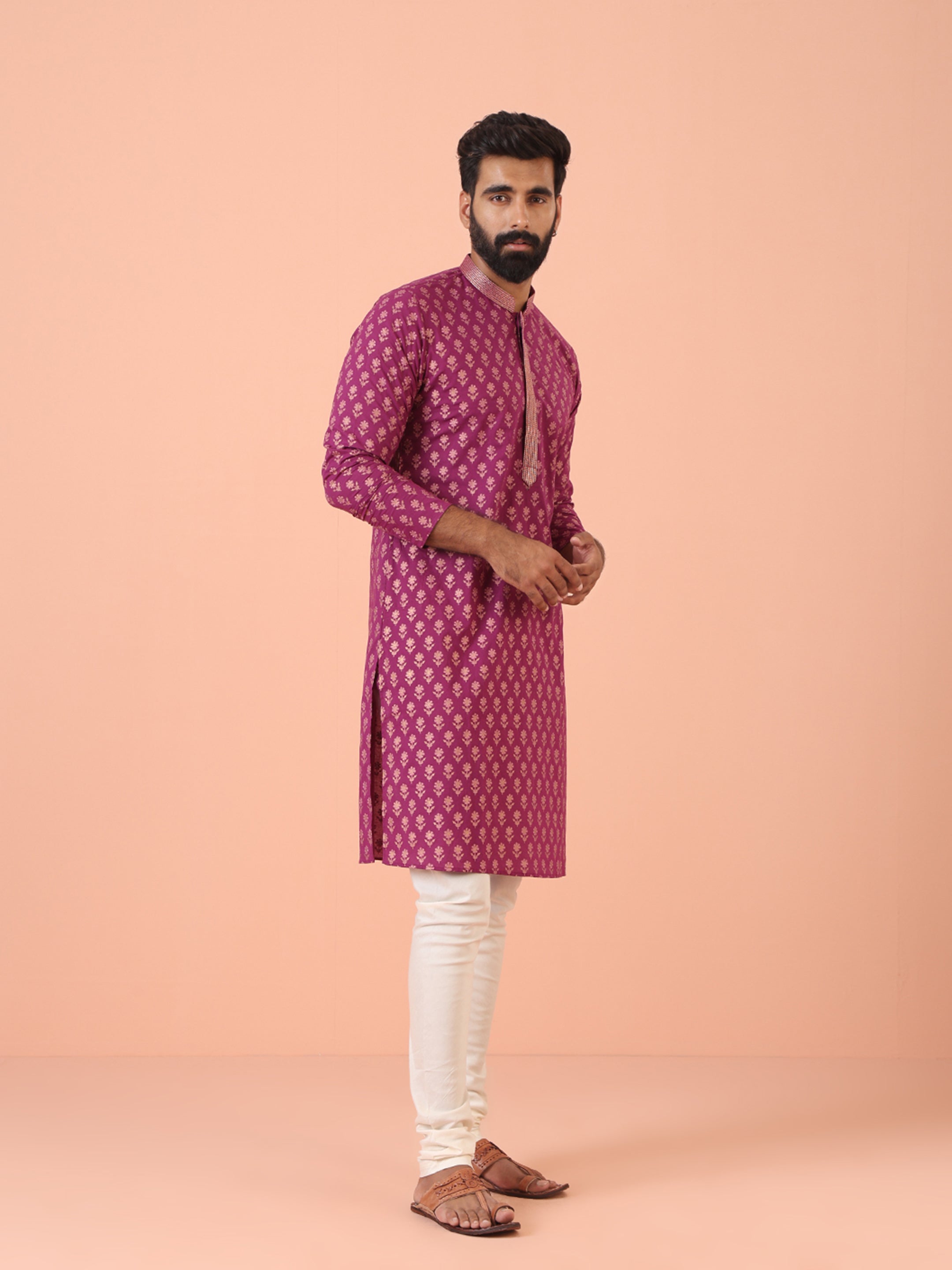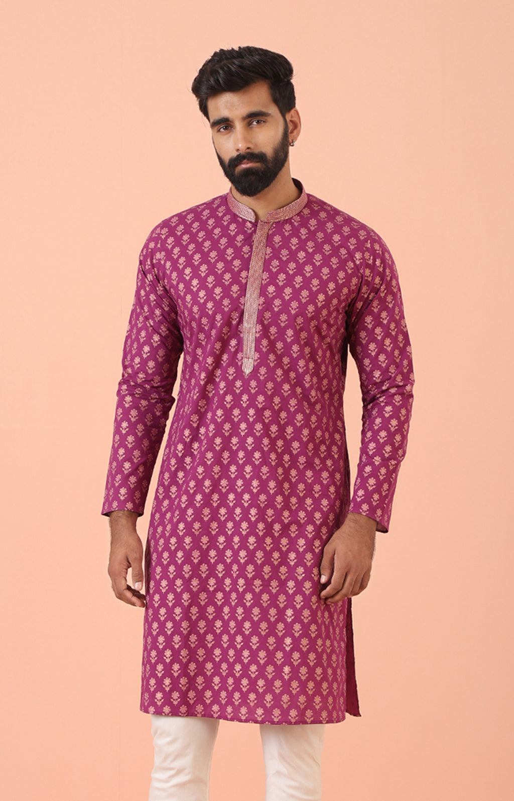 Magenta Kurta with Golden Motif Print and Contrast Placket