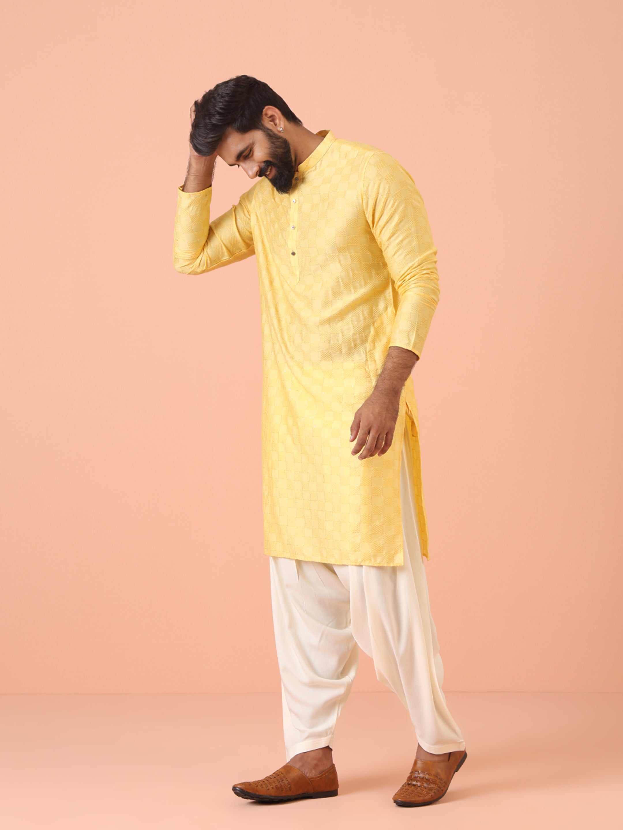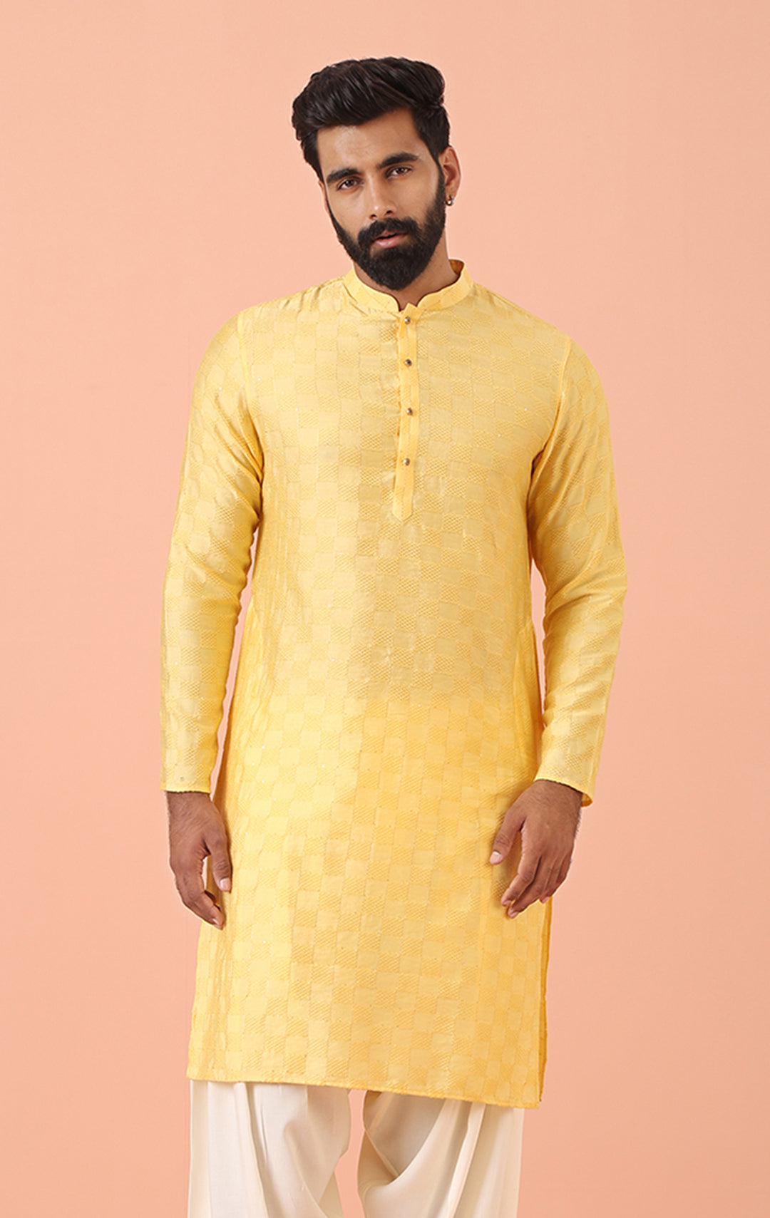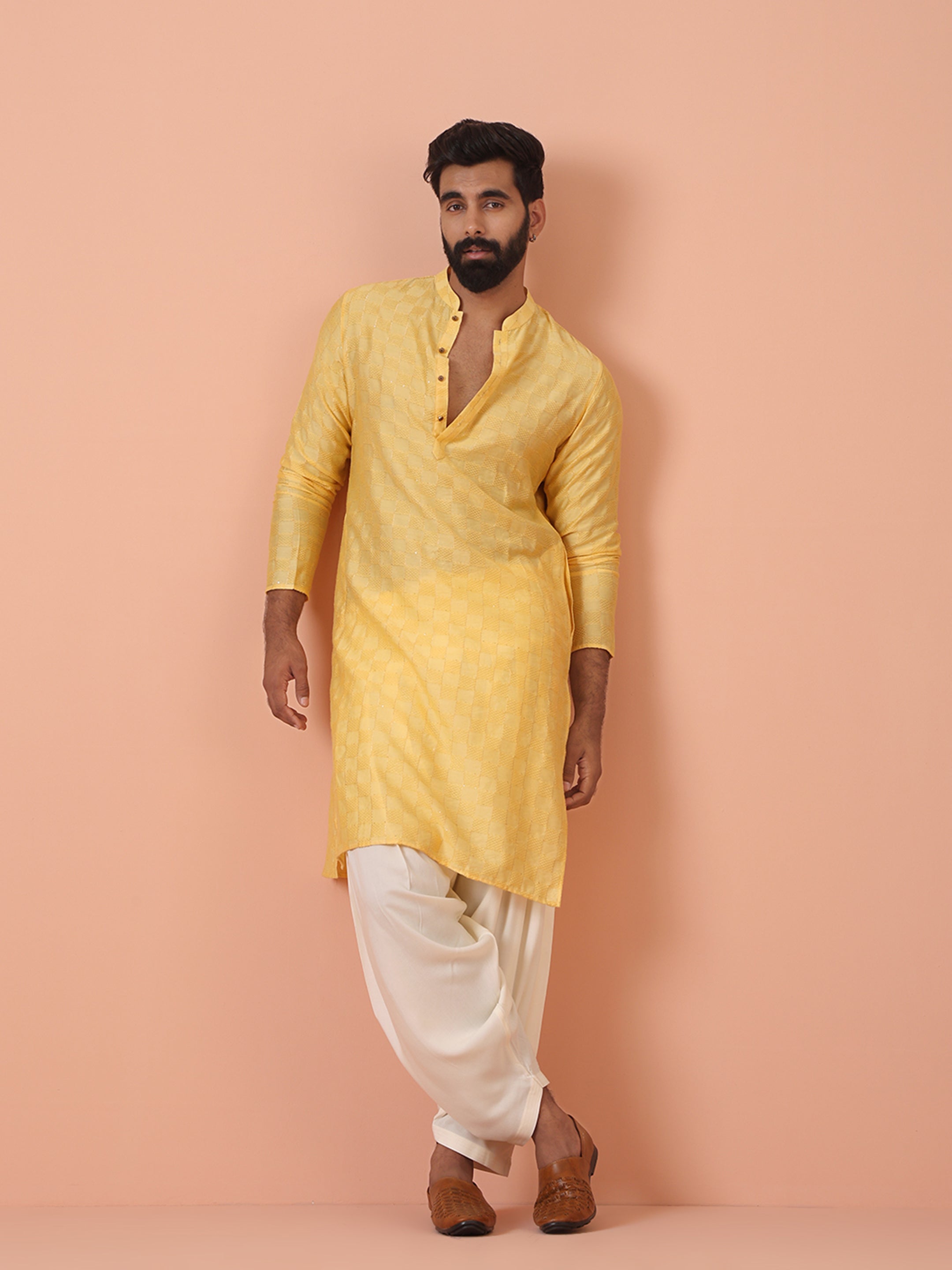 Experience classic elegance with this Men's Yellow Color Cotton Blend Kurta. The Self Design Pattern adds a refined touch, while the breathable fabric ensures comfort throughout the day. Ideal for festive events or casual wear, this Kurta is a wardrobe essential.
