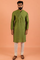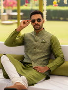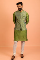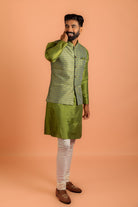 This Kurta Jacket Set with Green Color is an elegant mandarin collar style that is perfect for occasional wear. With a full sleeve Jacquard Pattern and comfortable Silk Blend fabric, it will make you look stylish.