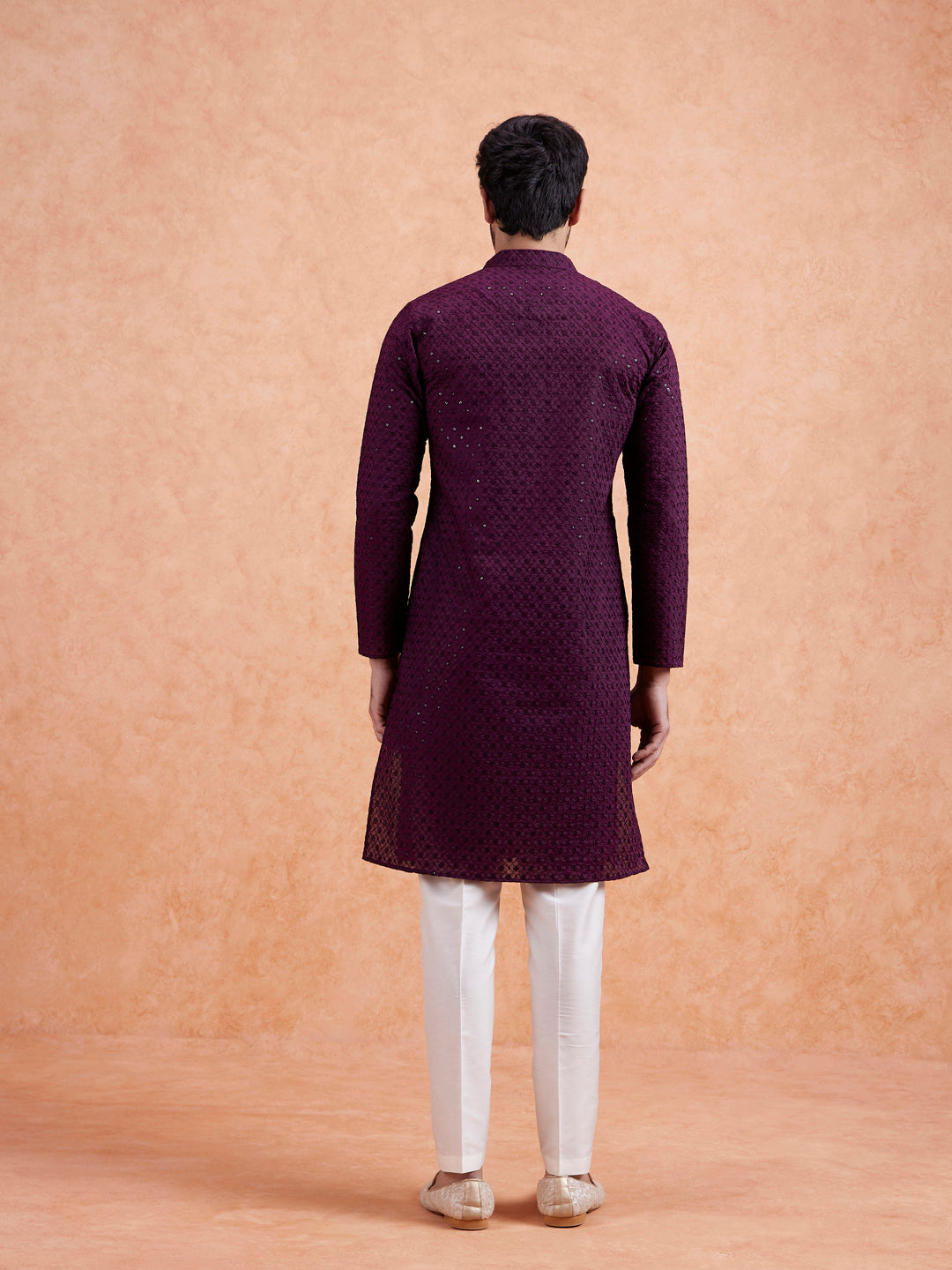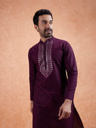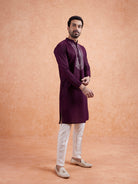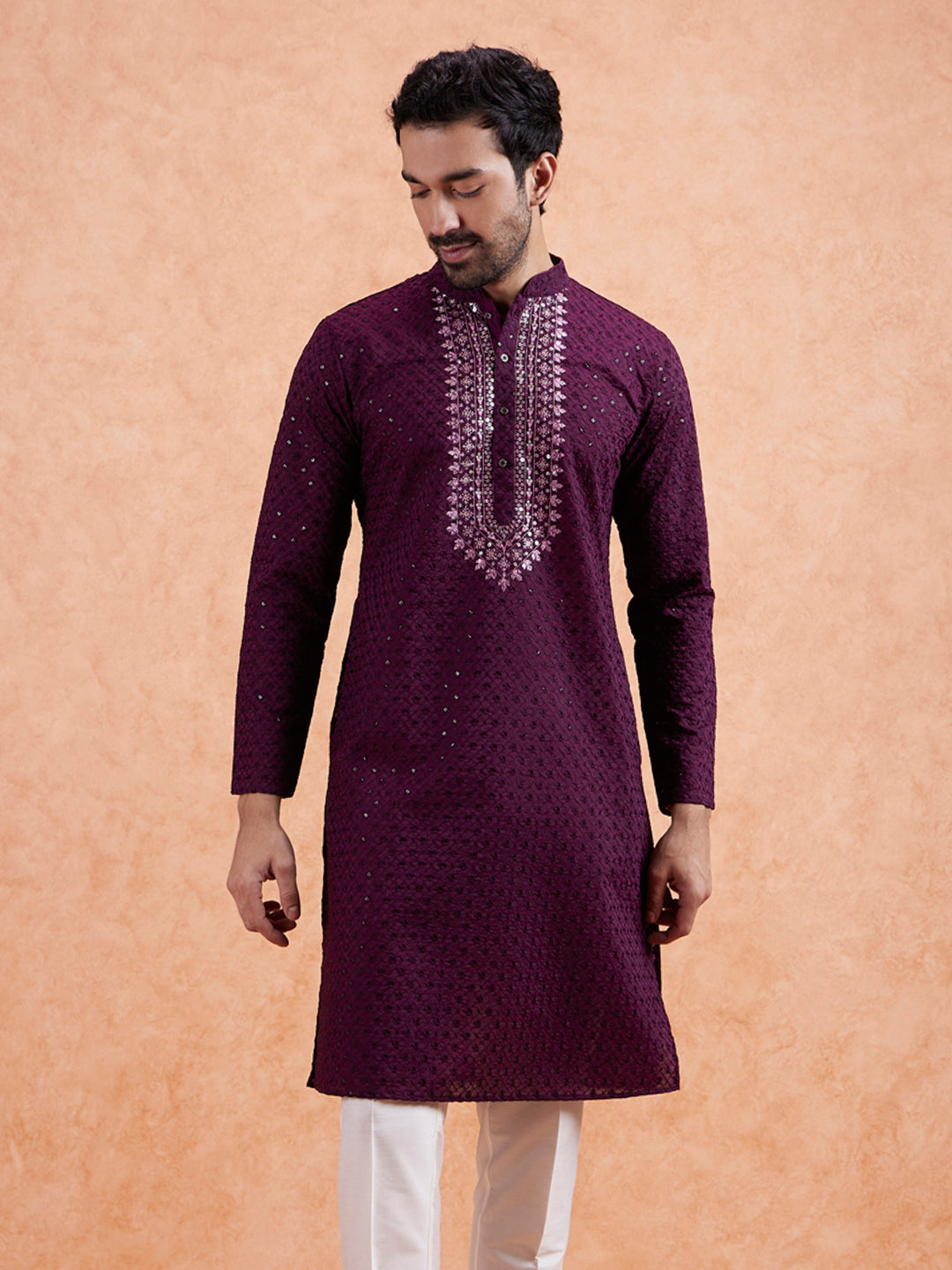 This purple cotton blend kurta features sequence embroidery and a regular fit. Perfect for festive occasions or casual gatherings, it combines sophistication with comfort.