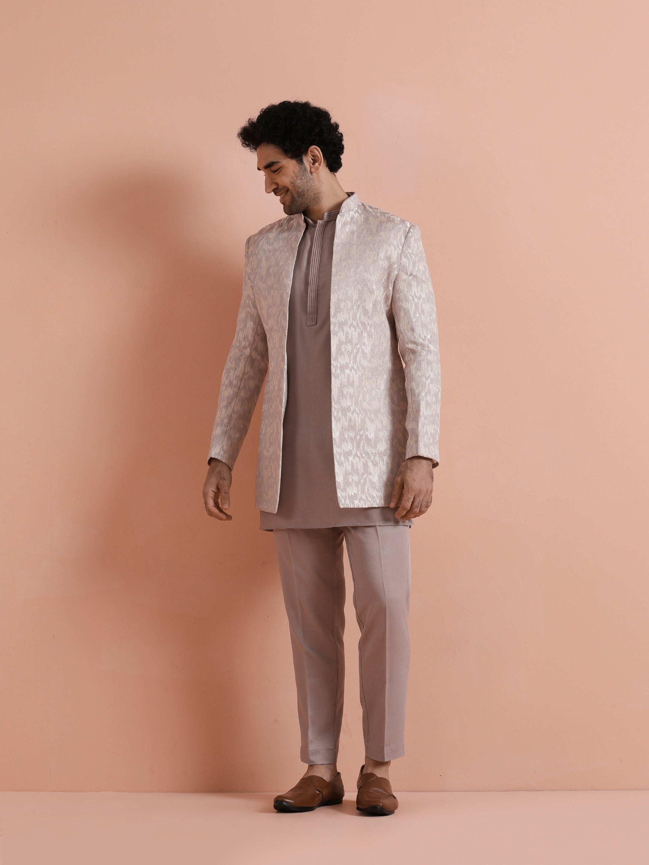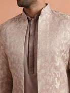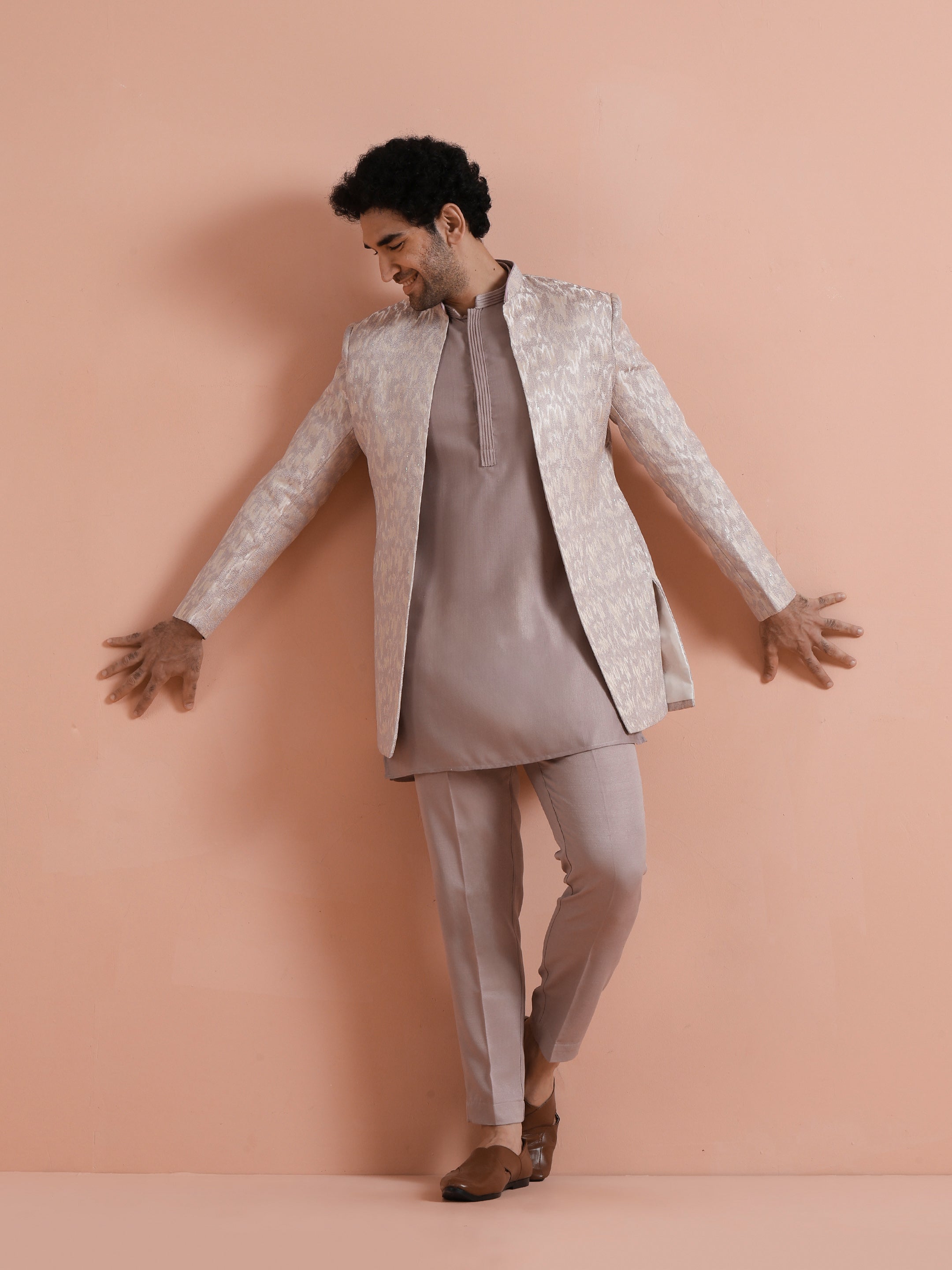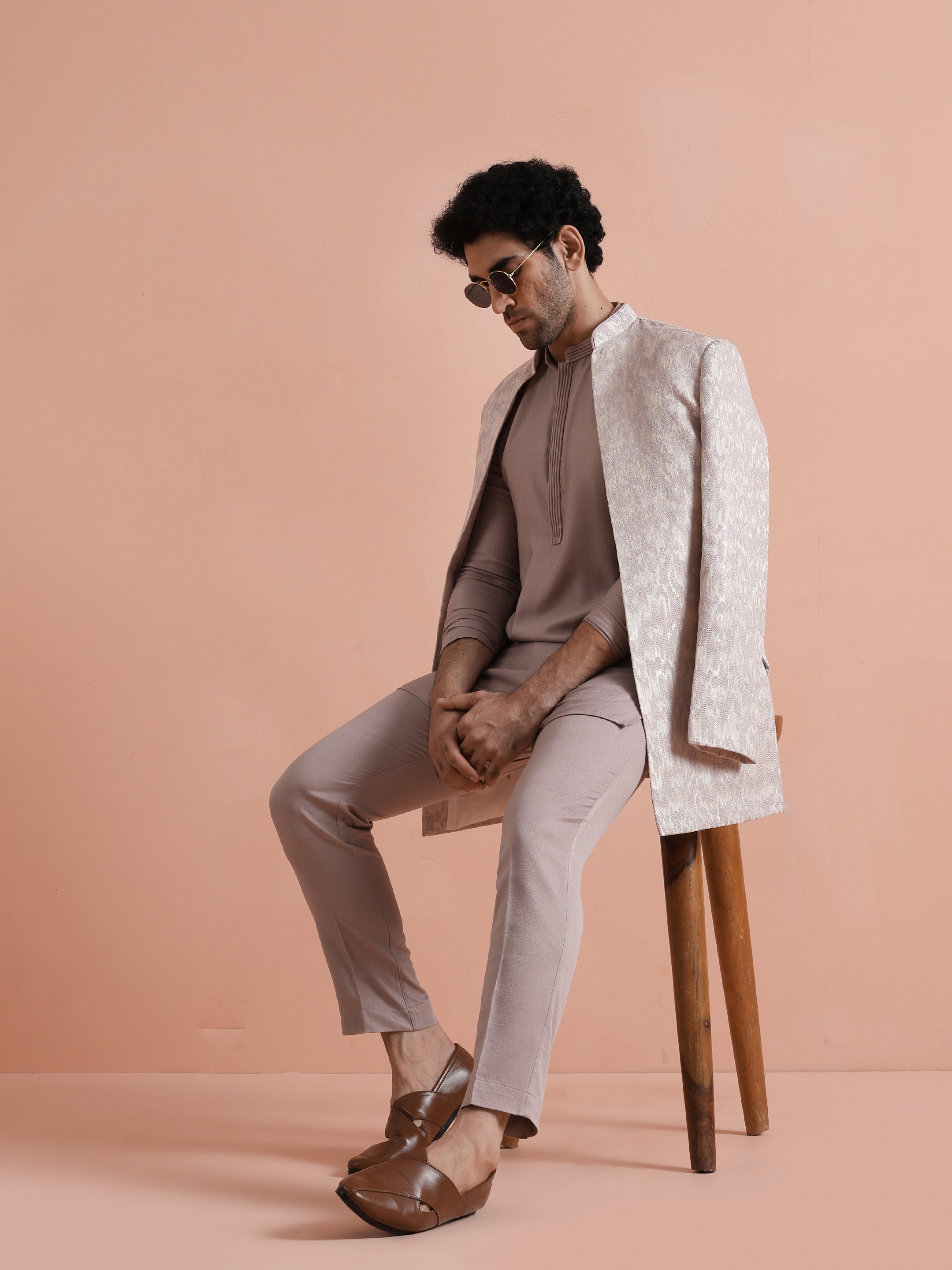 Mauve Poly Silk Jacquard Mid Kurta Short Front Open Sherwani Trouser Set, Perfect festive ethnic wear for men, ideal festive and casual occasions.