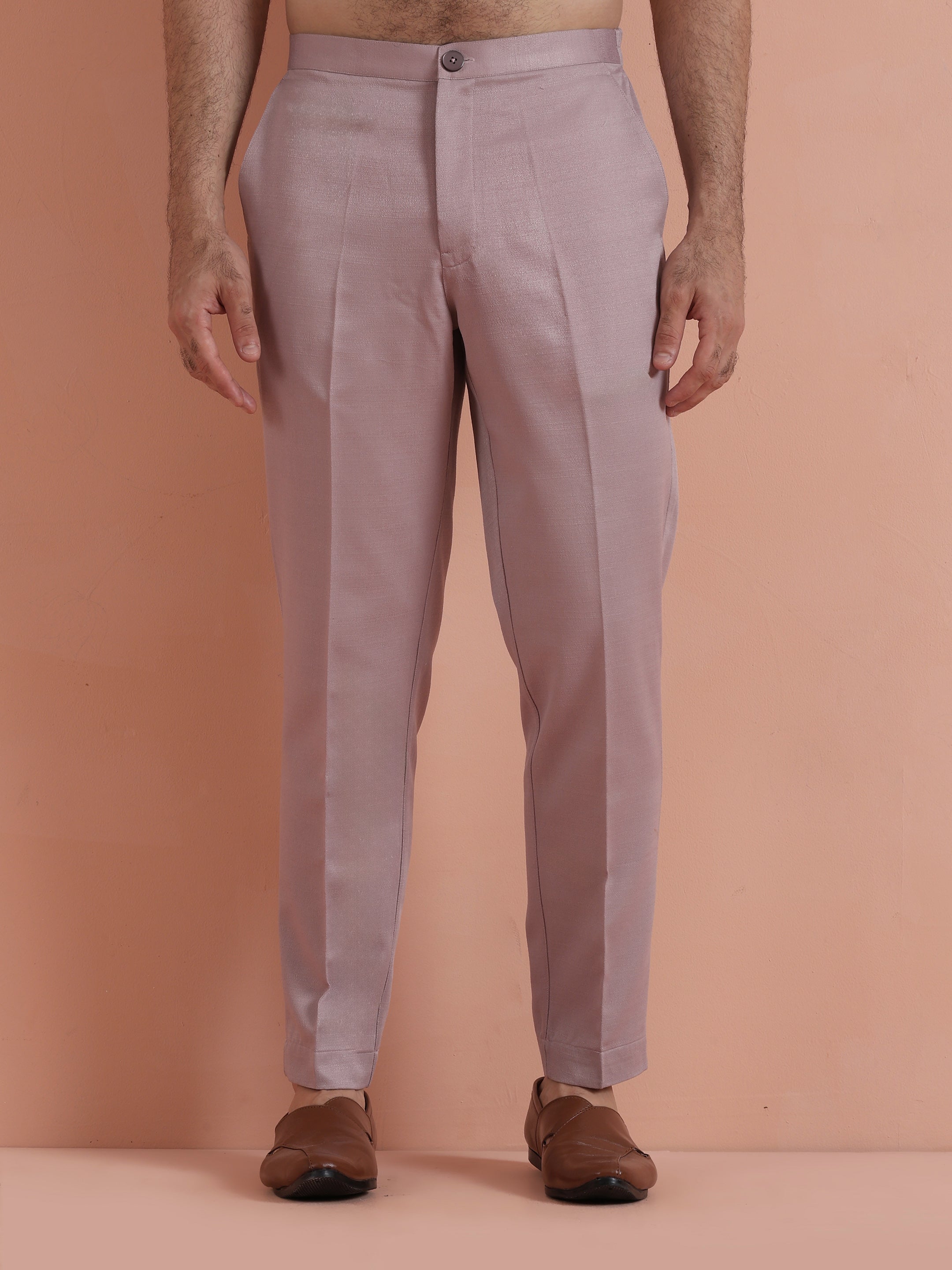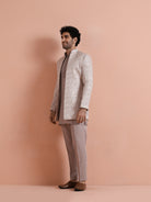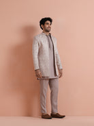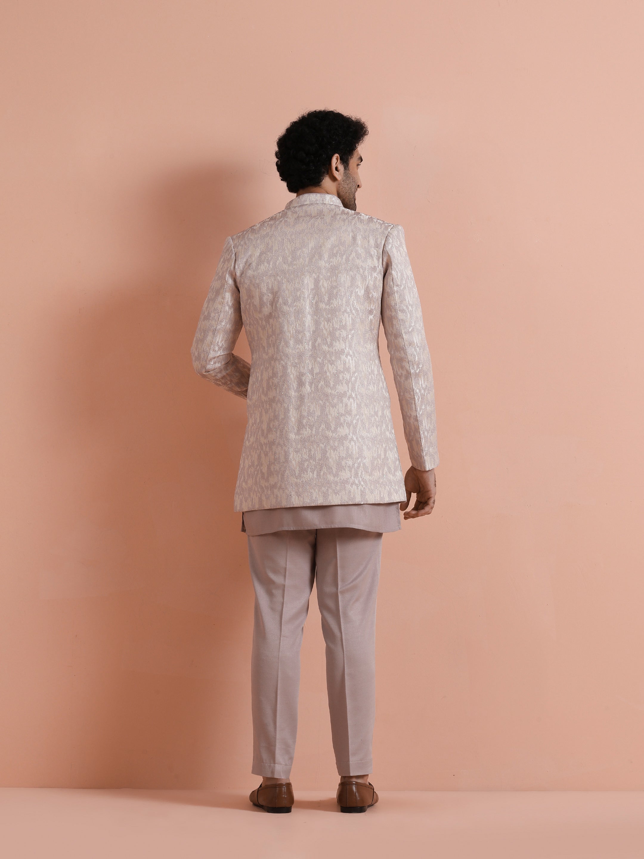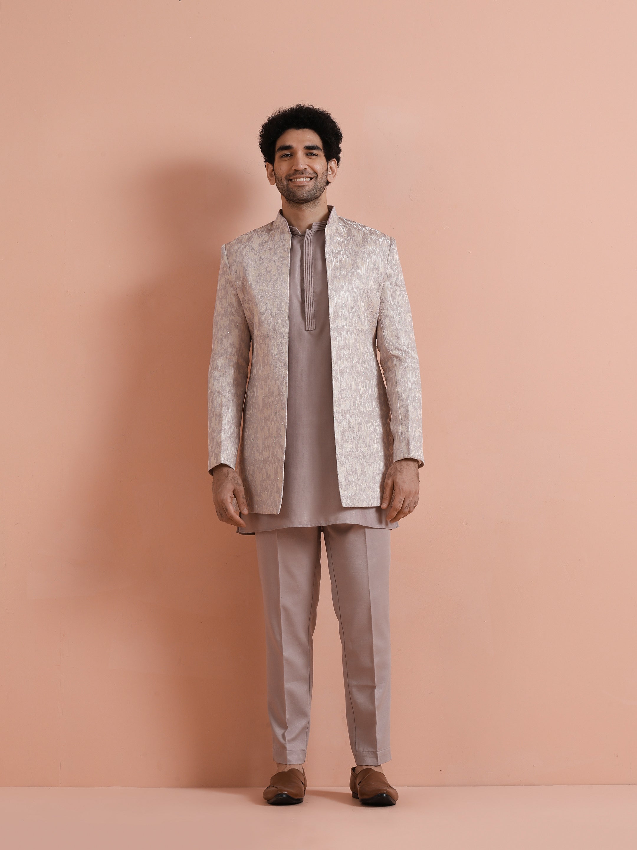 Mauve Poly Silk Jacquard Mid Kurta Short Front Open Sherwani Trouser Set, Perfect festive ethnic wear for men, ideal festive and casual occasions.