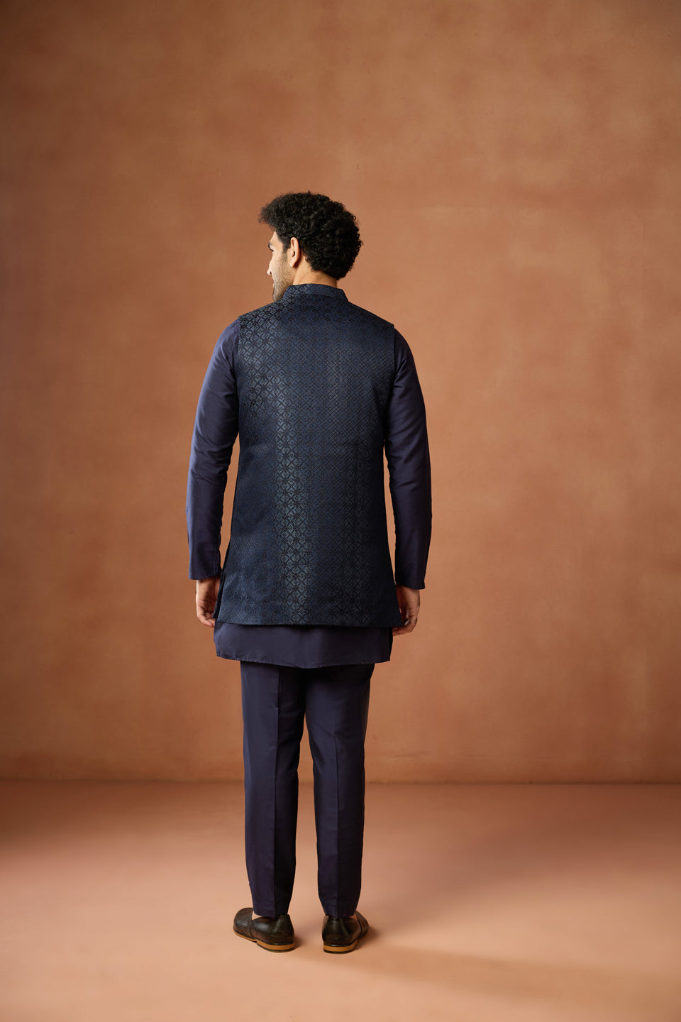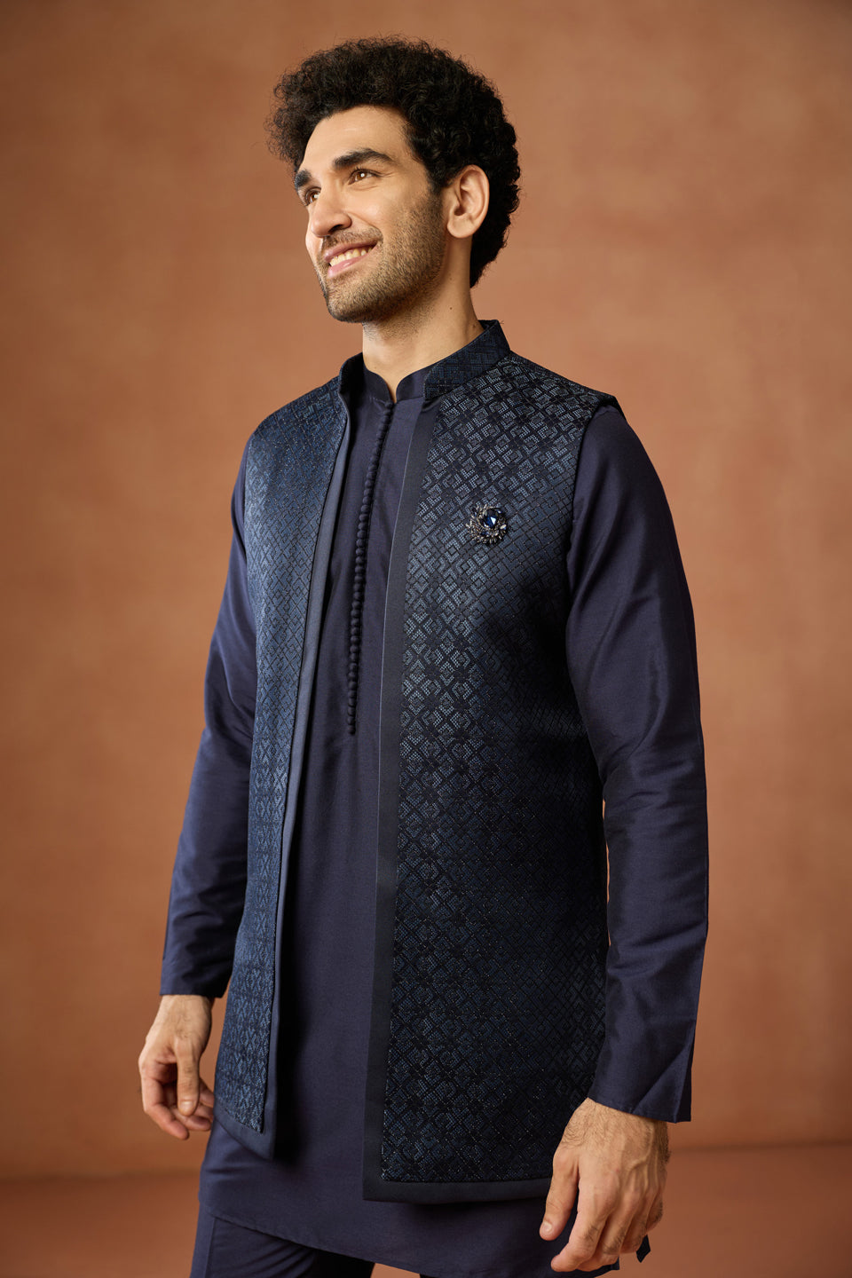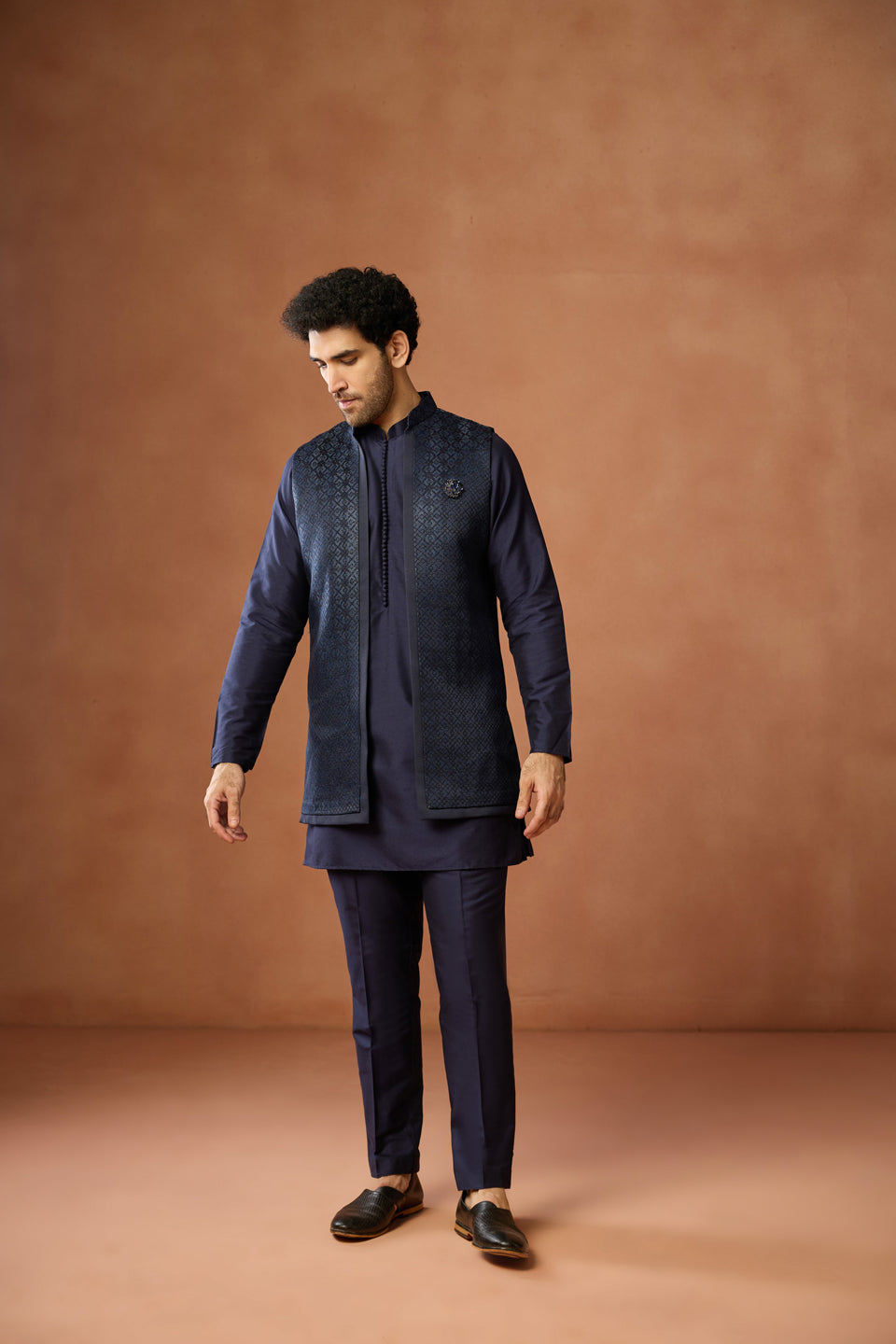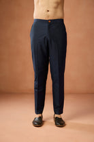 Kisah Menss navy blue silk blend kurta jacket trouser set with jacquard front open jacket. Perfect for weddings, receptions, and festive occasions.
