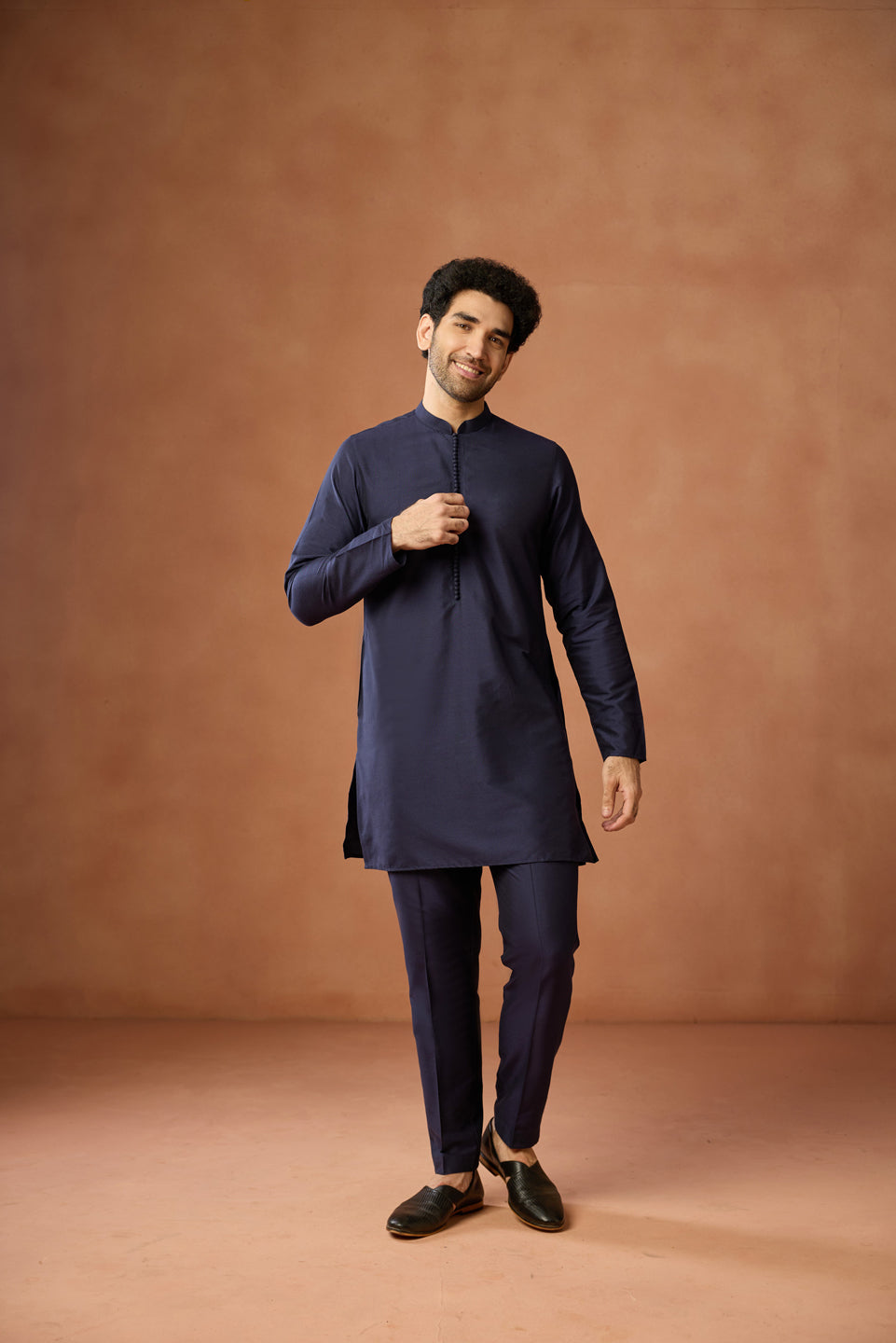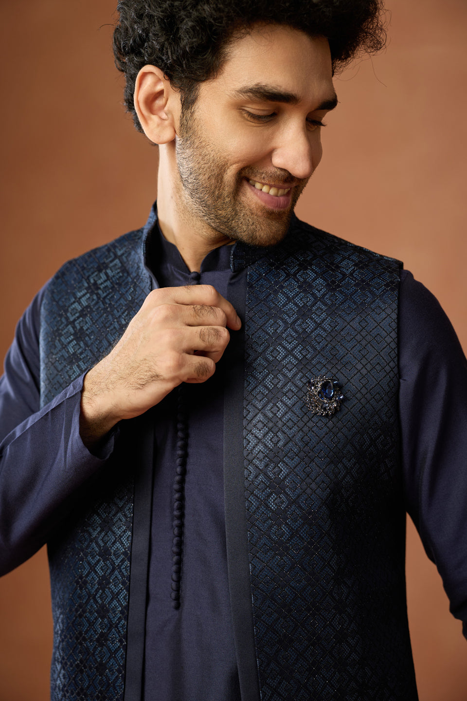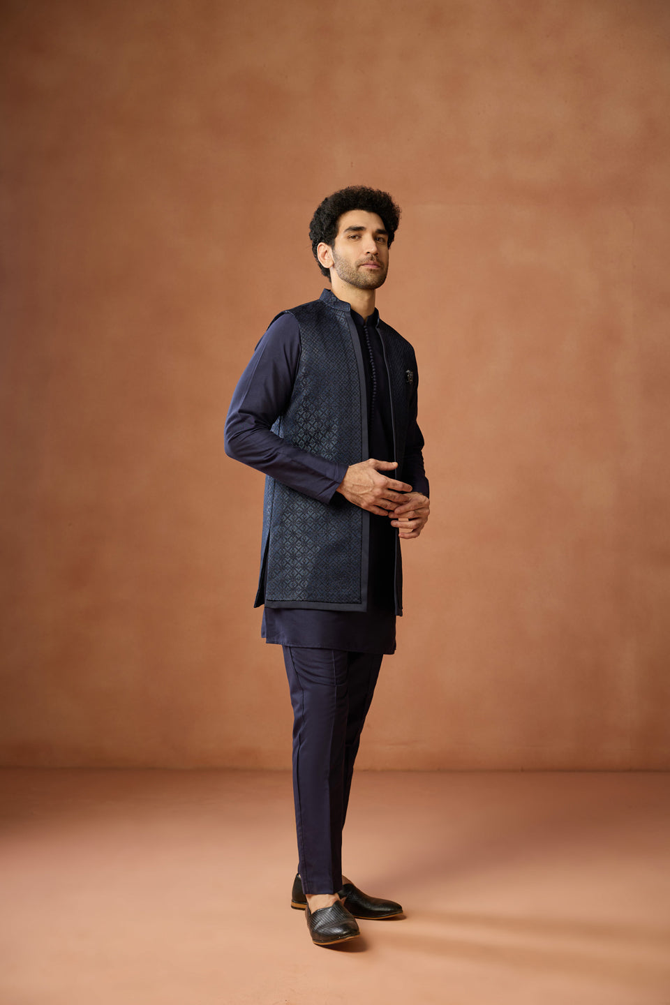 Kisah Menss navy blue silk blend kurta jacket trouser set with jacquard front open jacket. Perfect for weddings, receptions, and festive occasions.