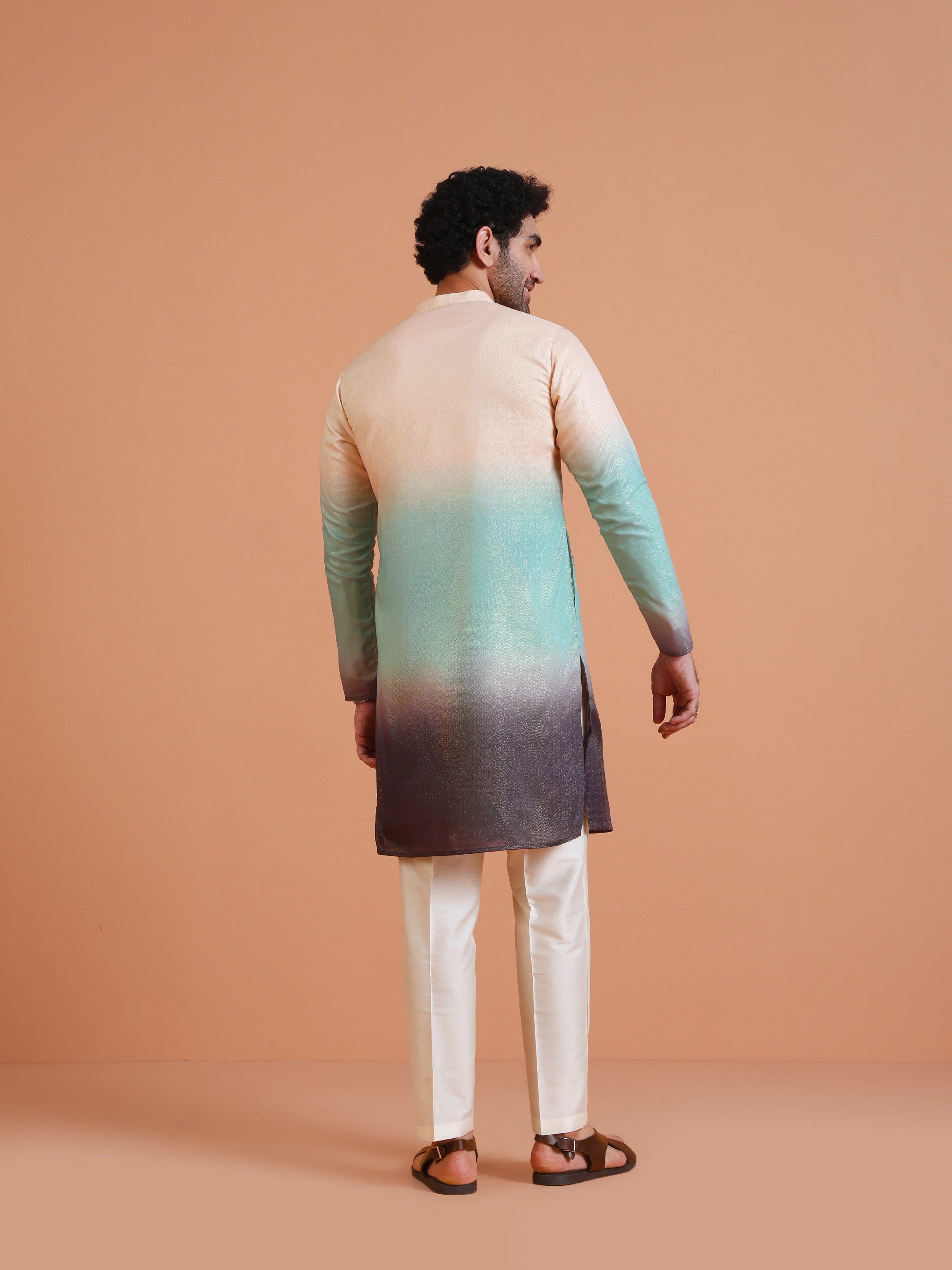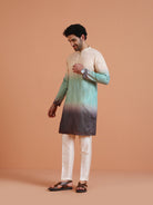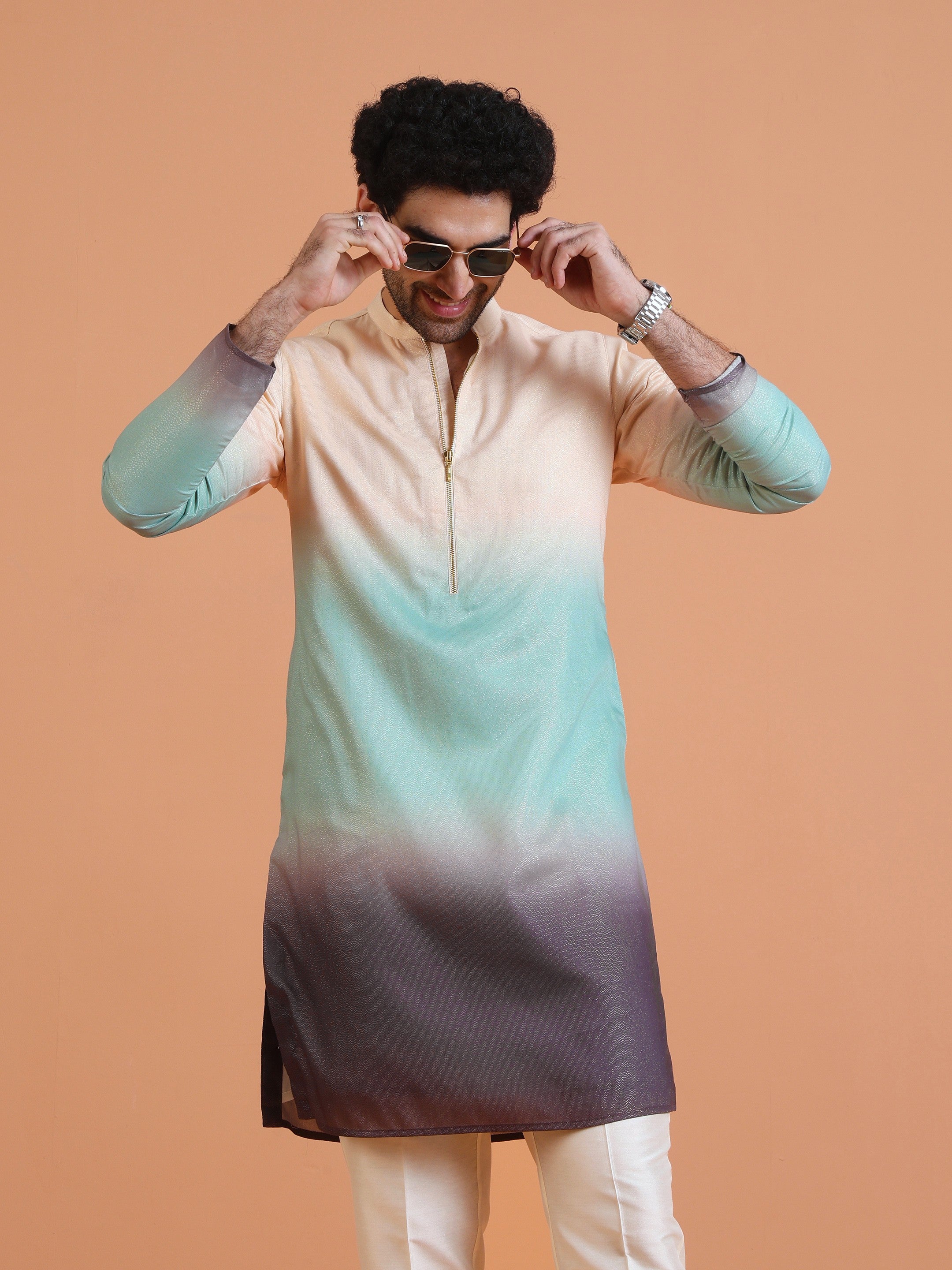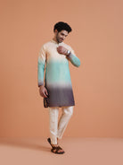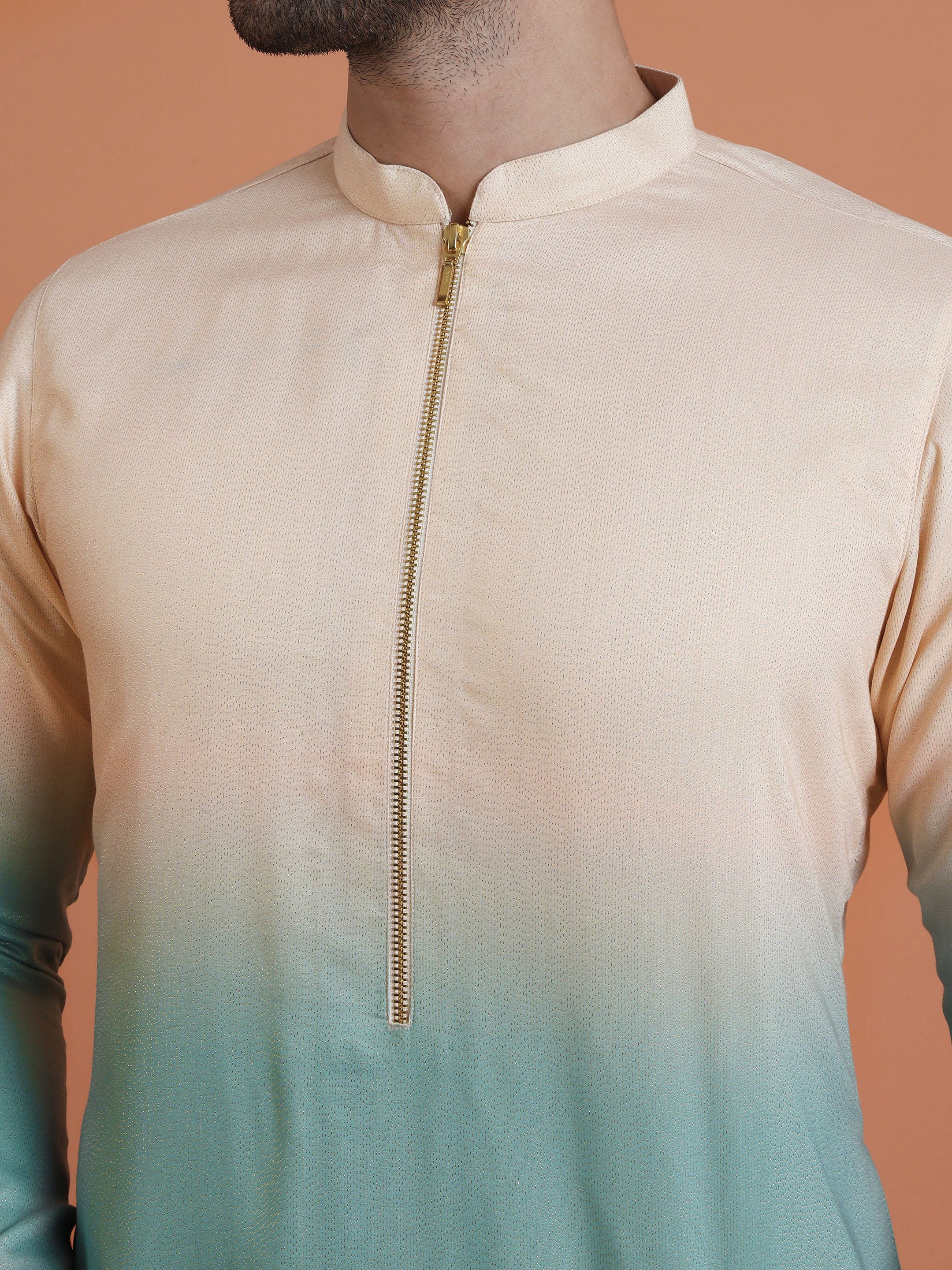 Kisah ombre cotton silk kurta with beige to aqua gradient and gold zipper placket. Long festive kurta perfect for weddings and sangeet.