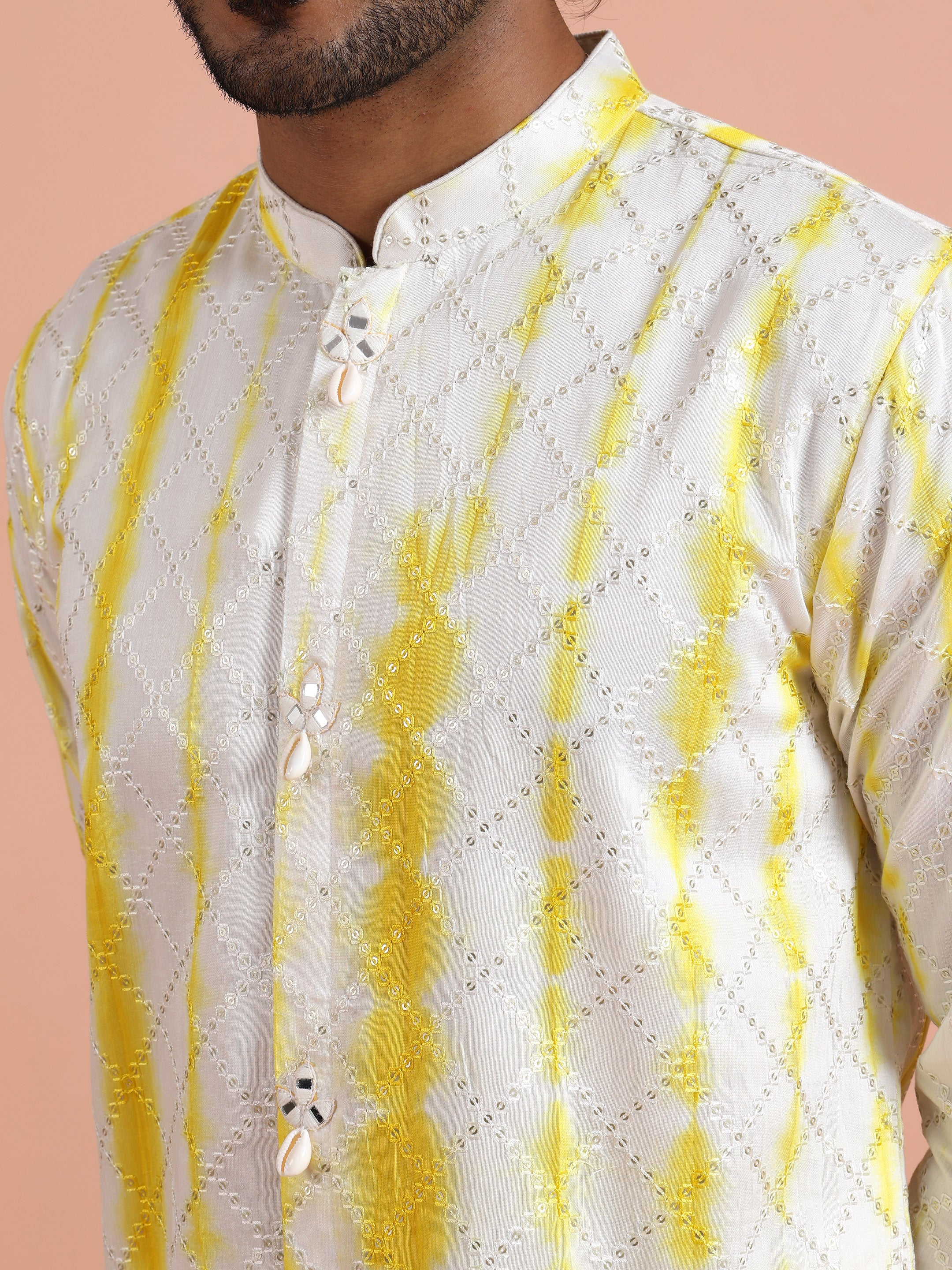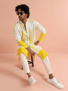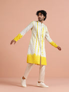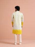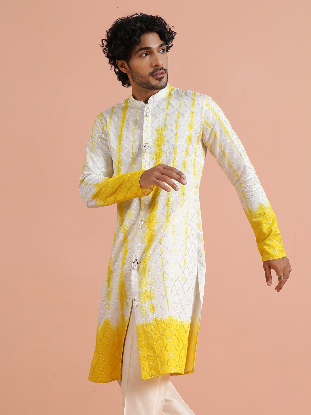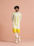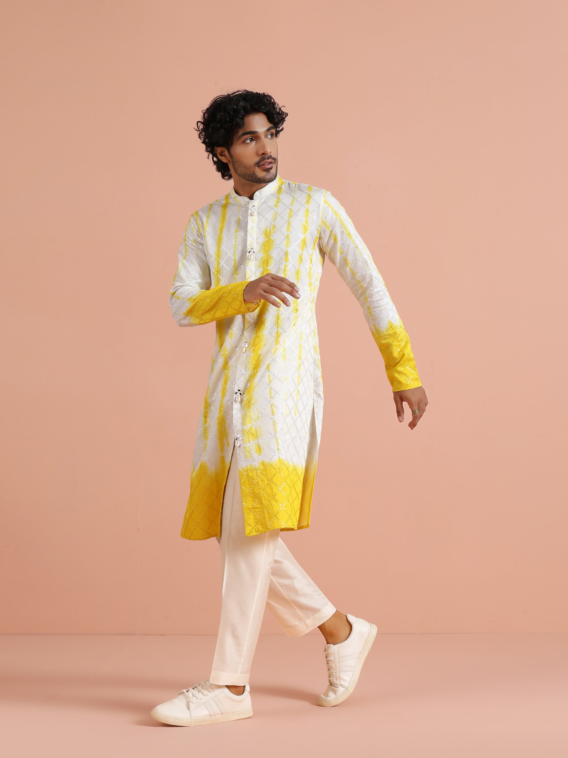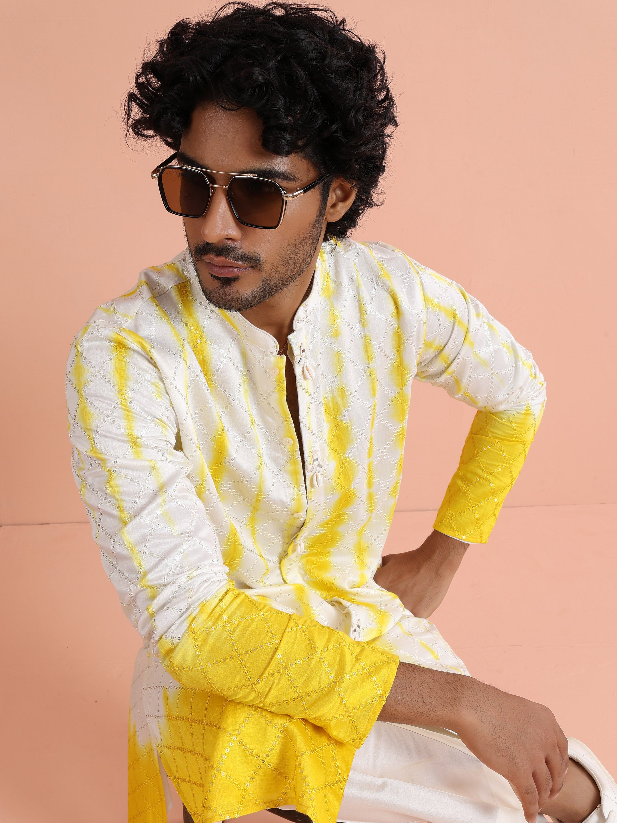 Kisah Menss White & Yellow Ombre Kurta bright festive piece with geometric detailing. Perfect for haldi, mehendi, and daytime celebrations.