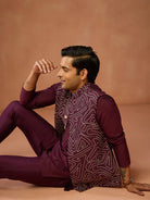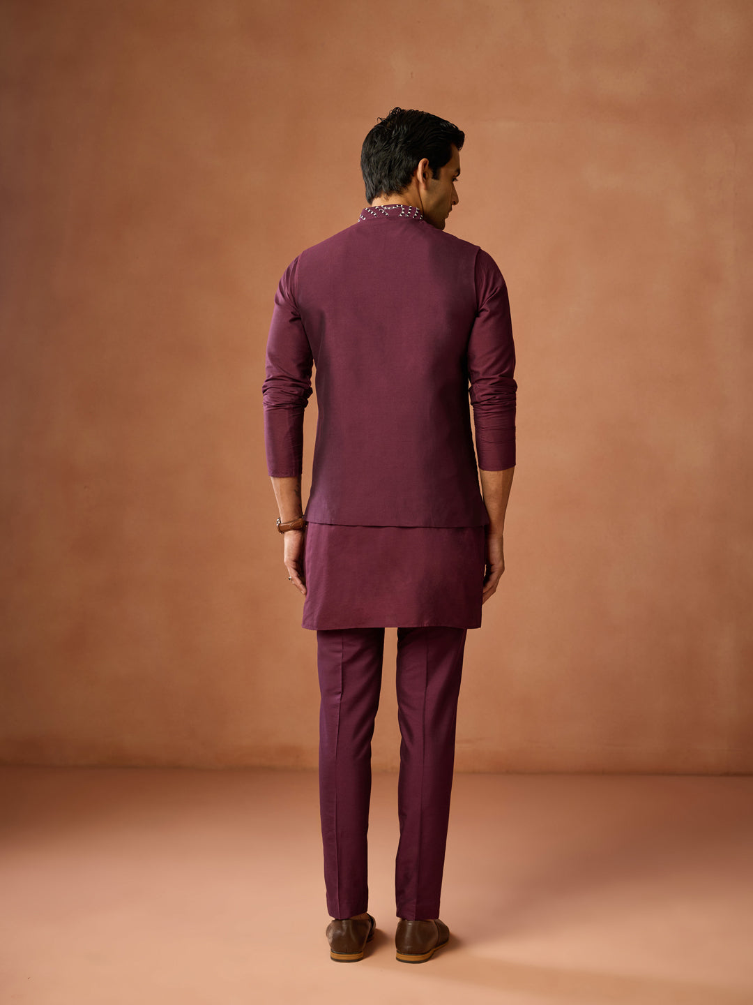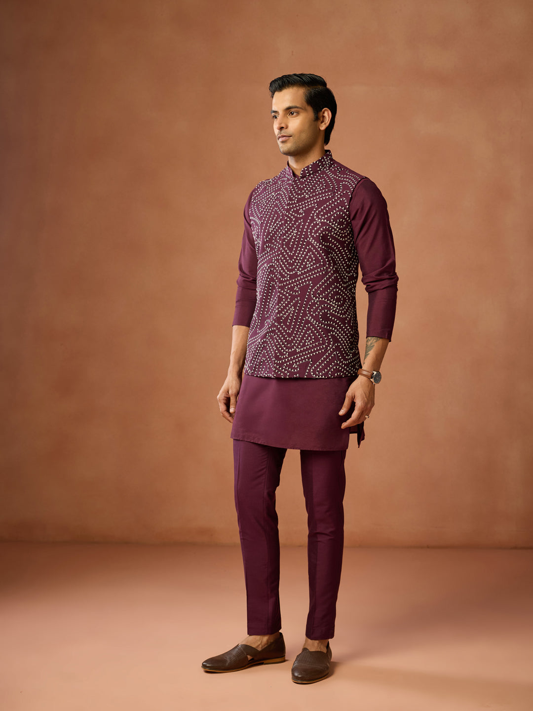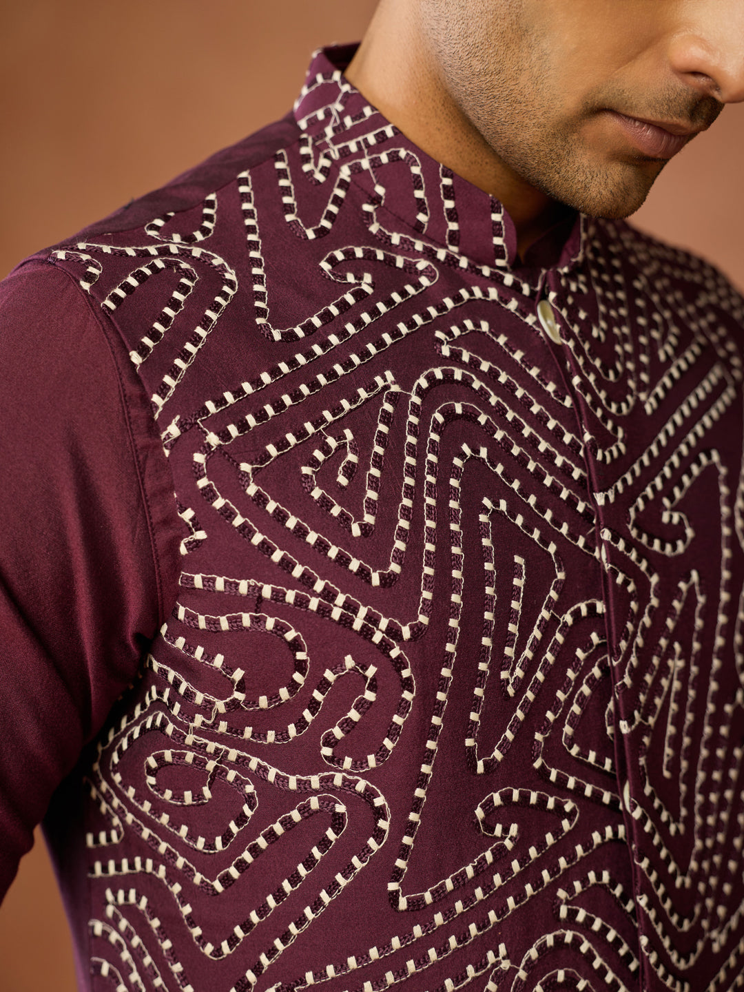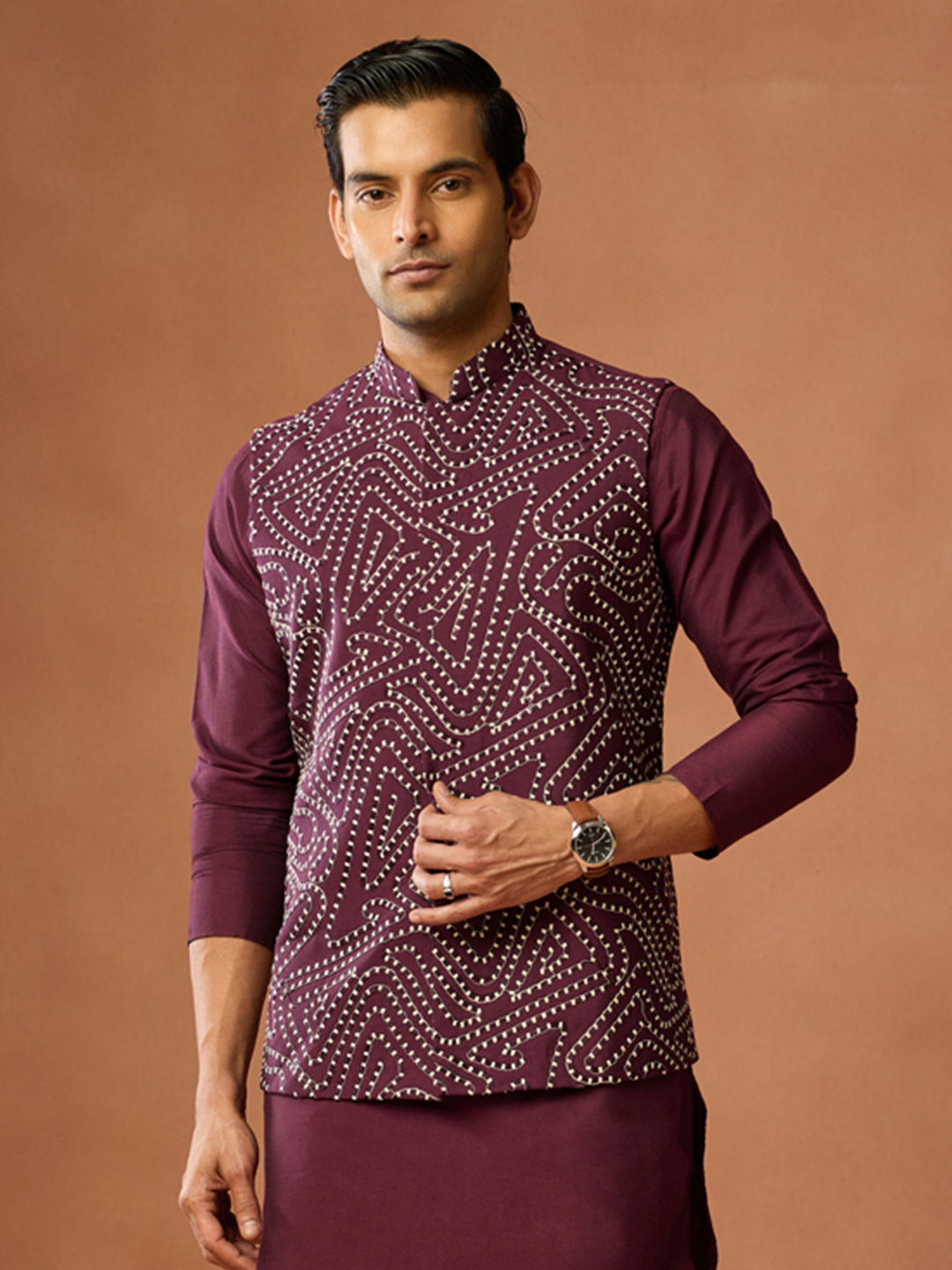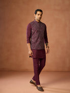 Wine Poly Silk Embroidered Jacket, Perfect festive ethnic wear for men, ideal festive and casual occasions.