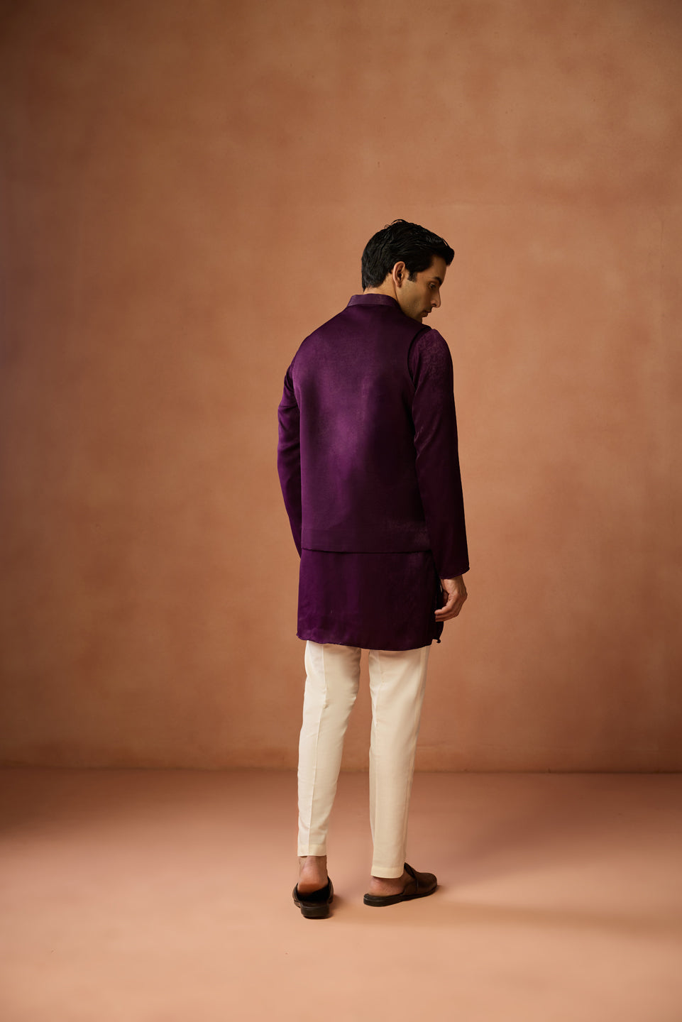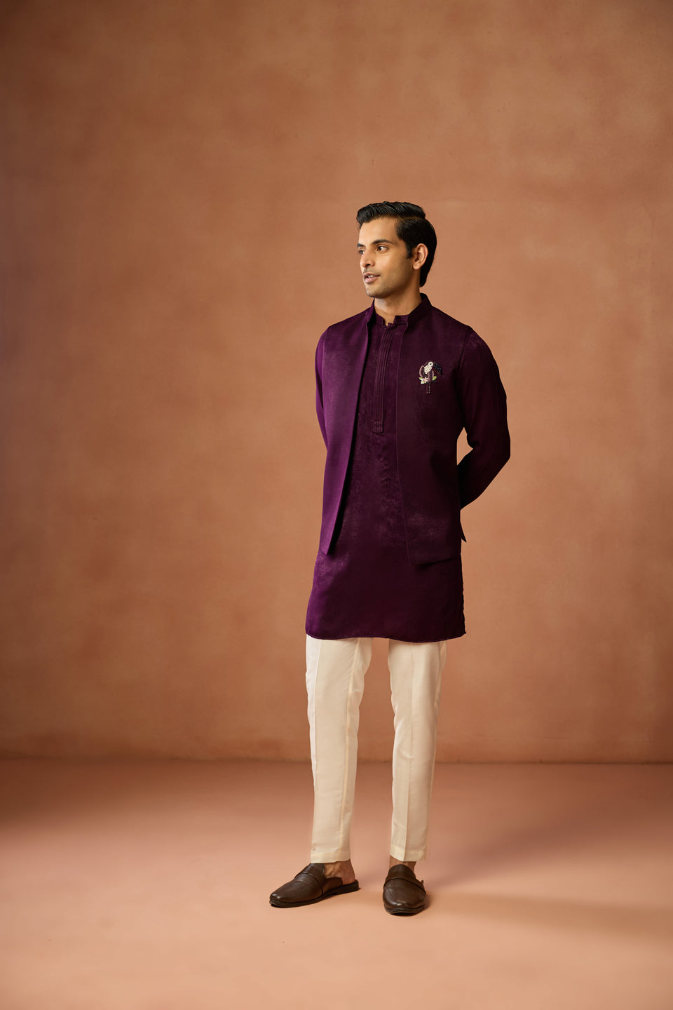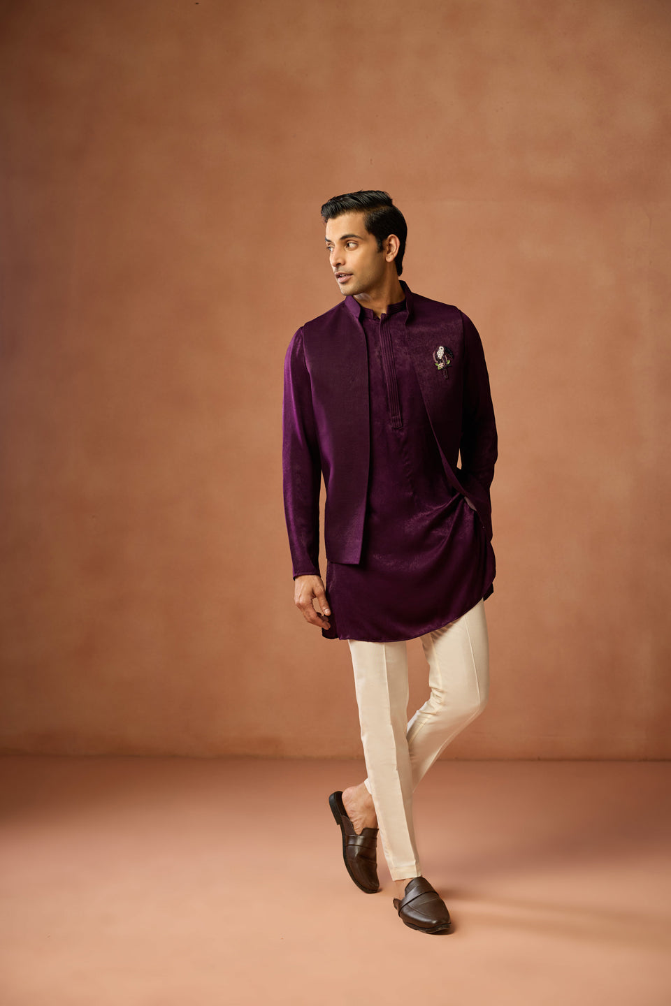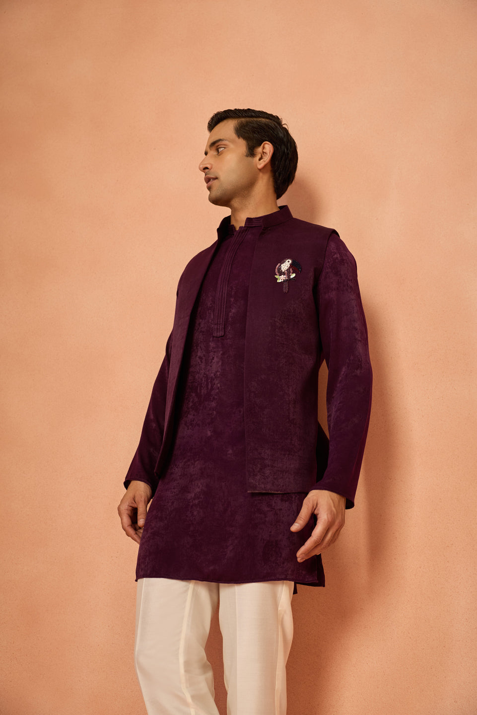 Kisah wine purple silk blend mid kurta with front open jacket, embellished brooch, and cream trousers. Modern Indo-western set for weddings.