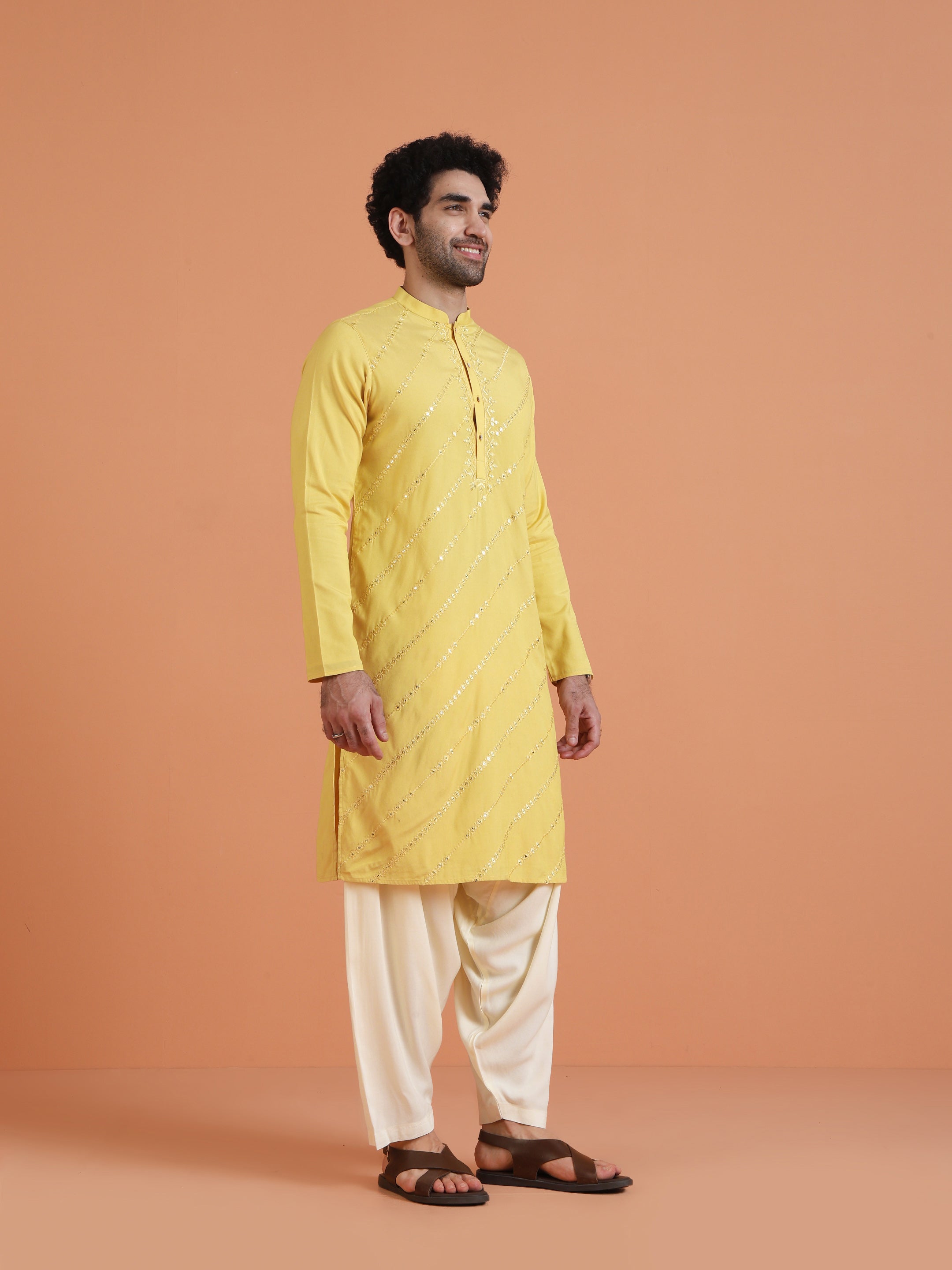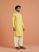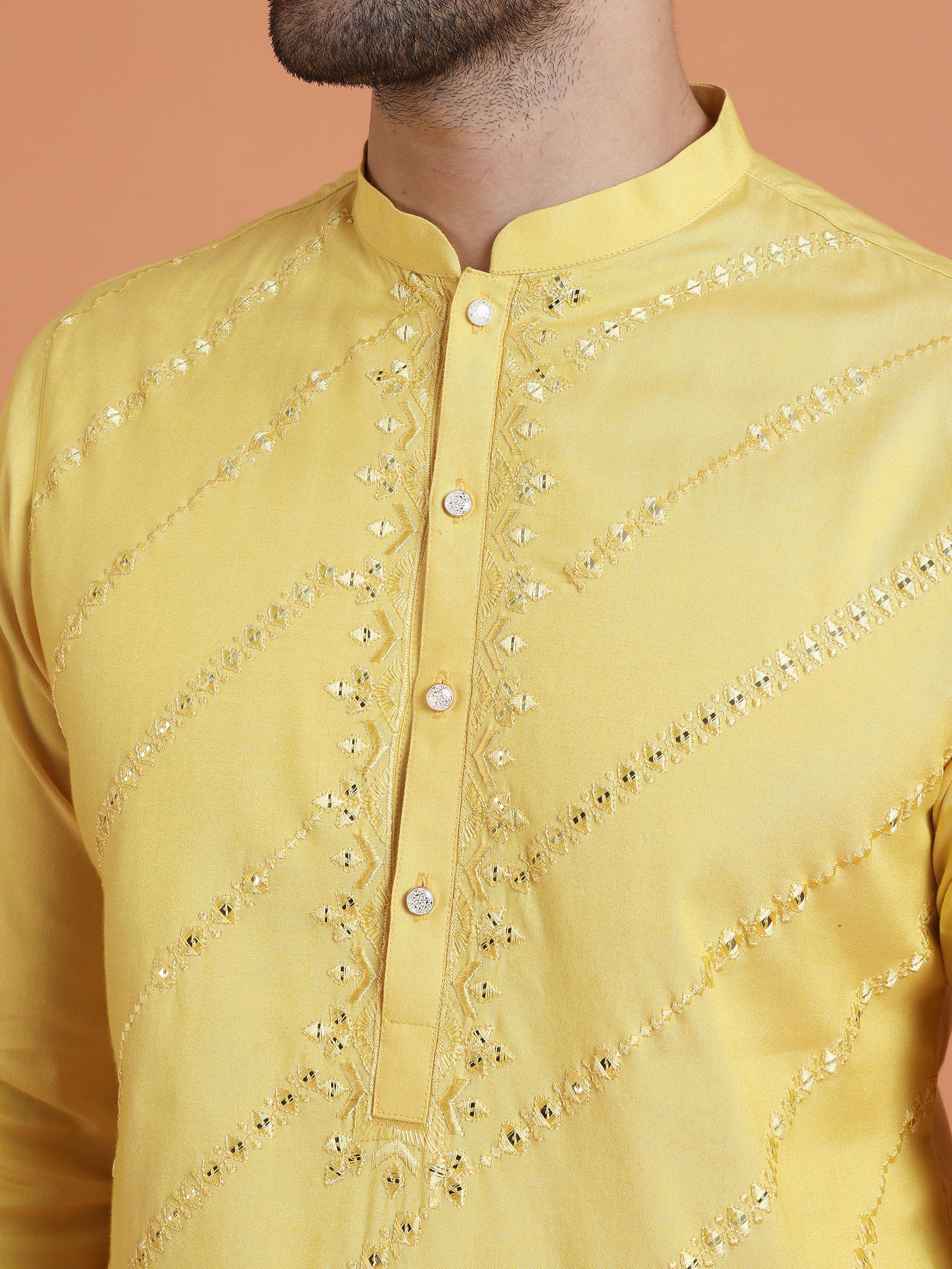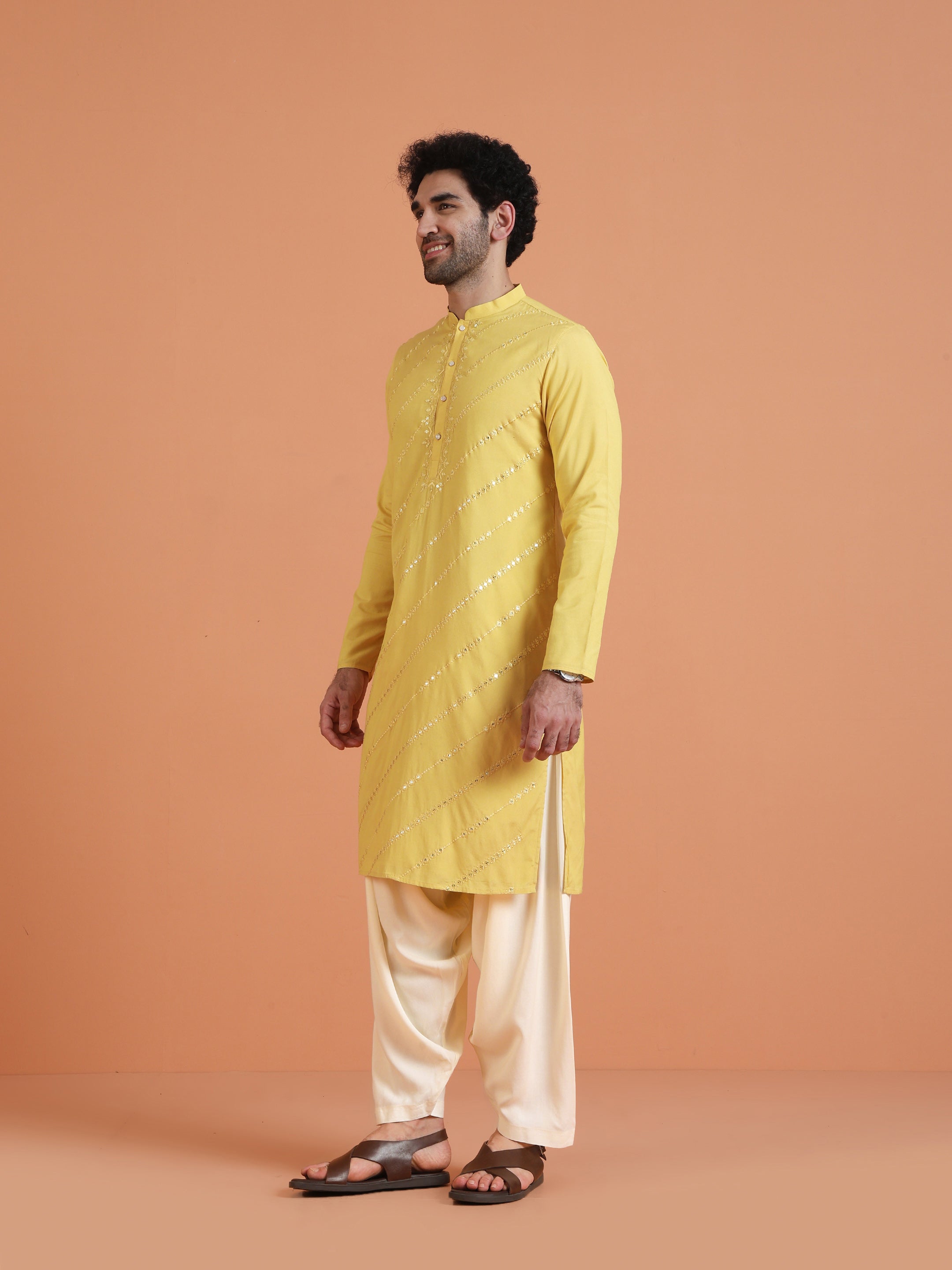 Kisah yellow cotton silk kurta with diagonal mirror work. Long festive kurta perfect for haldi, weddings, Diwali, and cultural occasions.