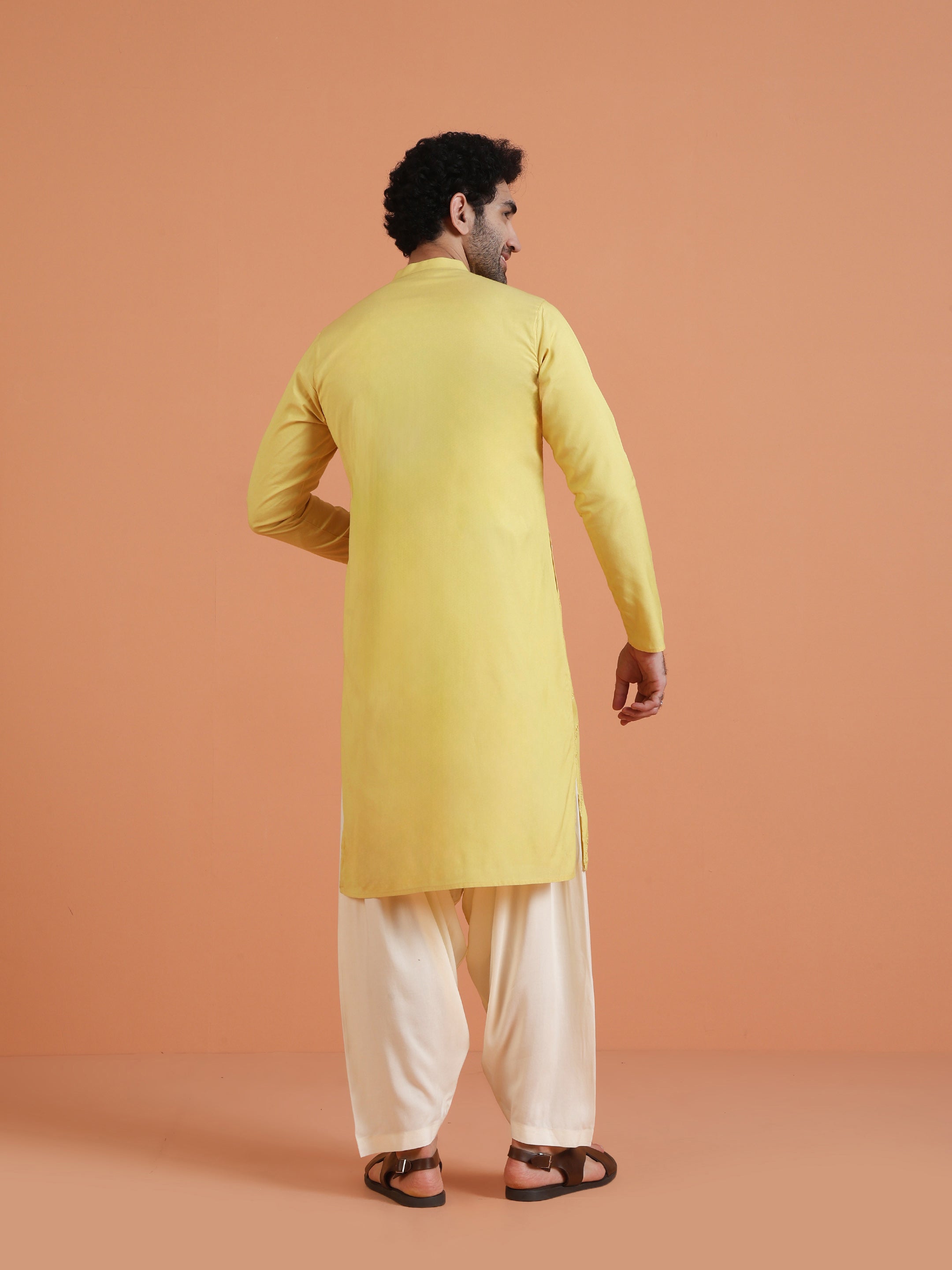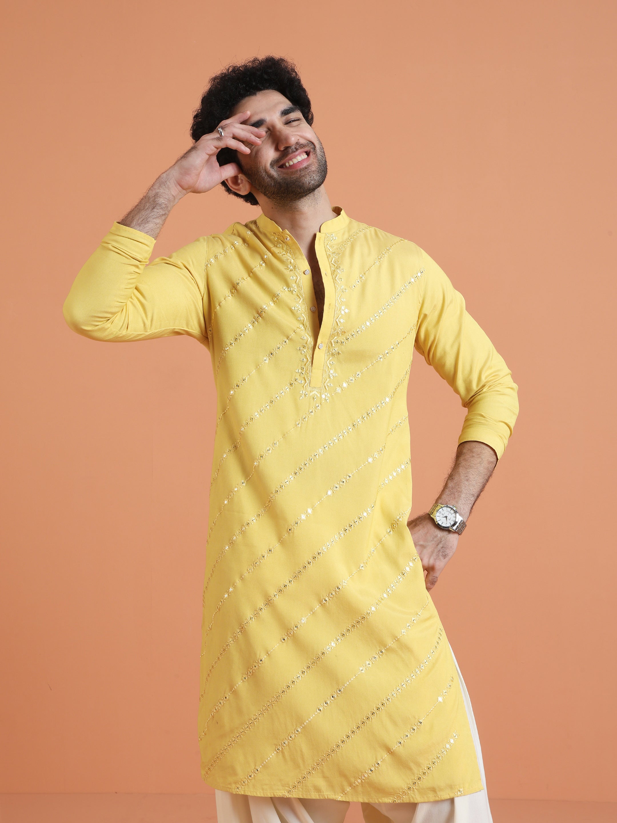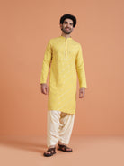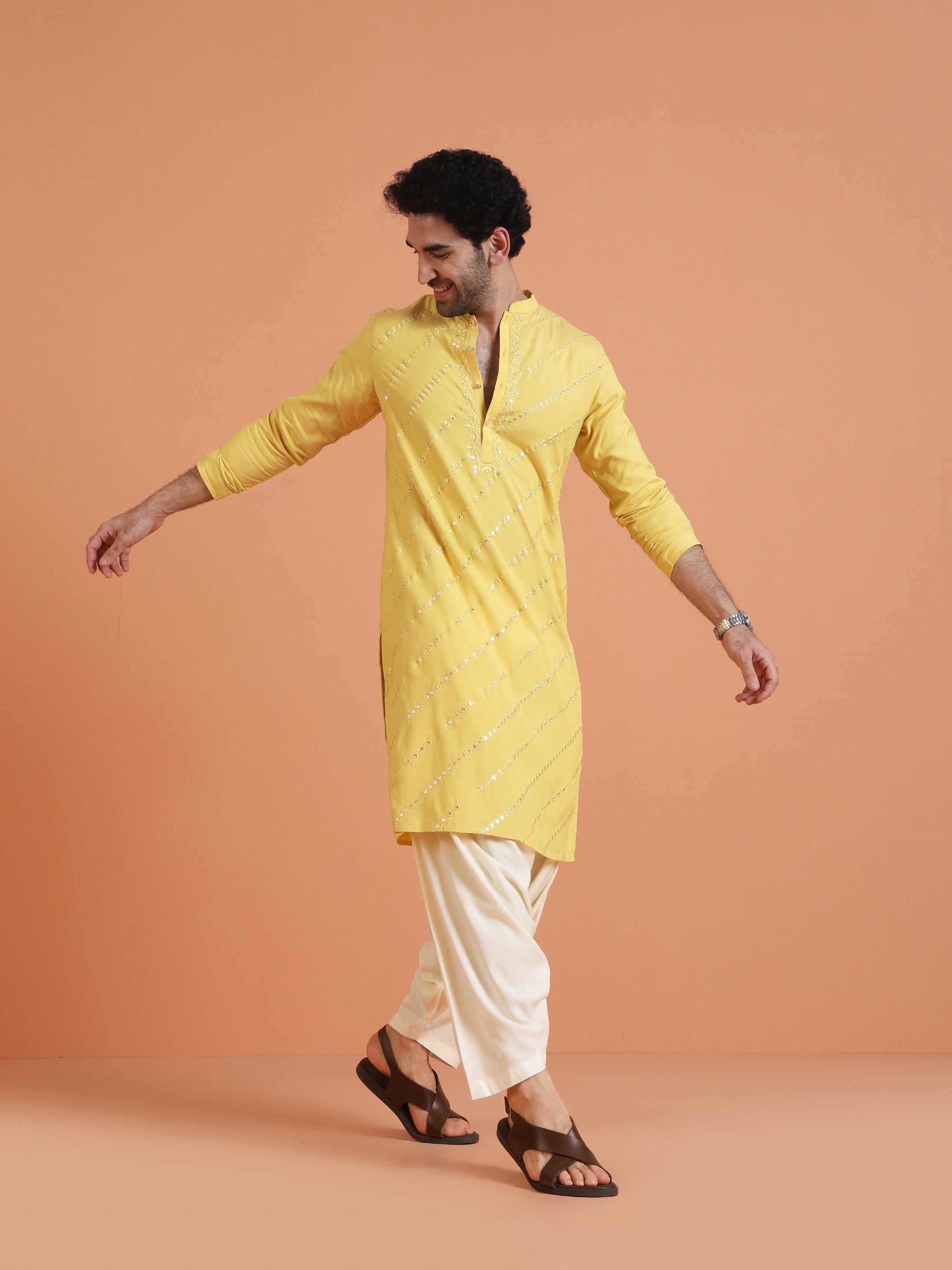 Kisah yellow cotton silk kurta with diagonal mirror work. Long festive kurta perfect for haldi, weddings, Diwali, and cultural occasions.