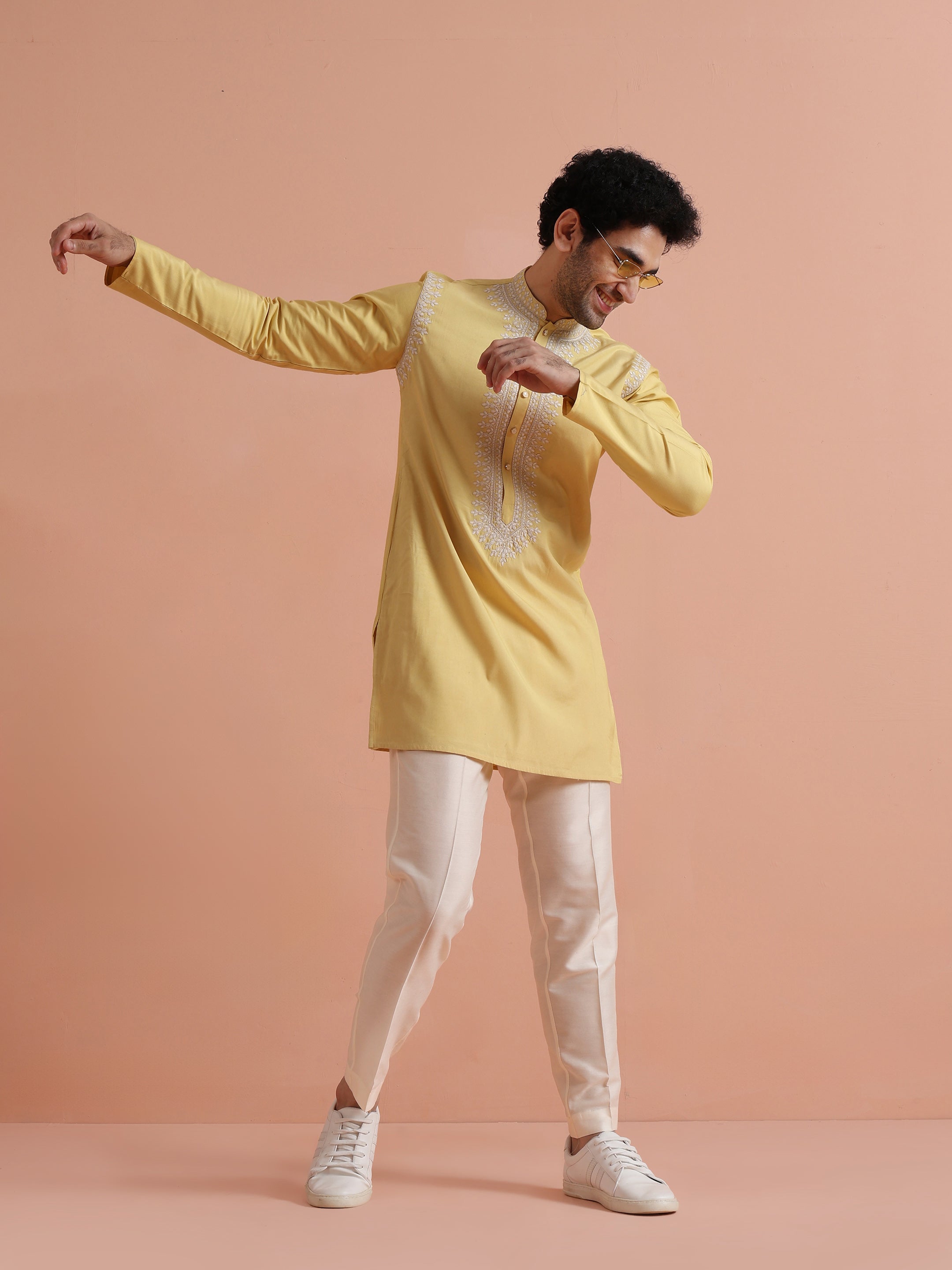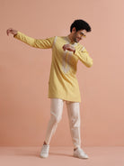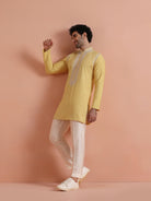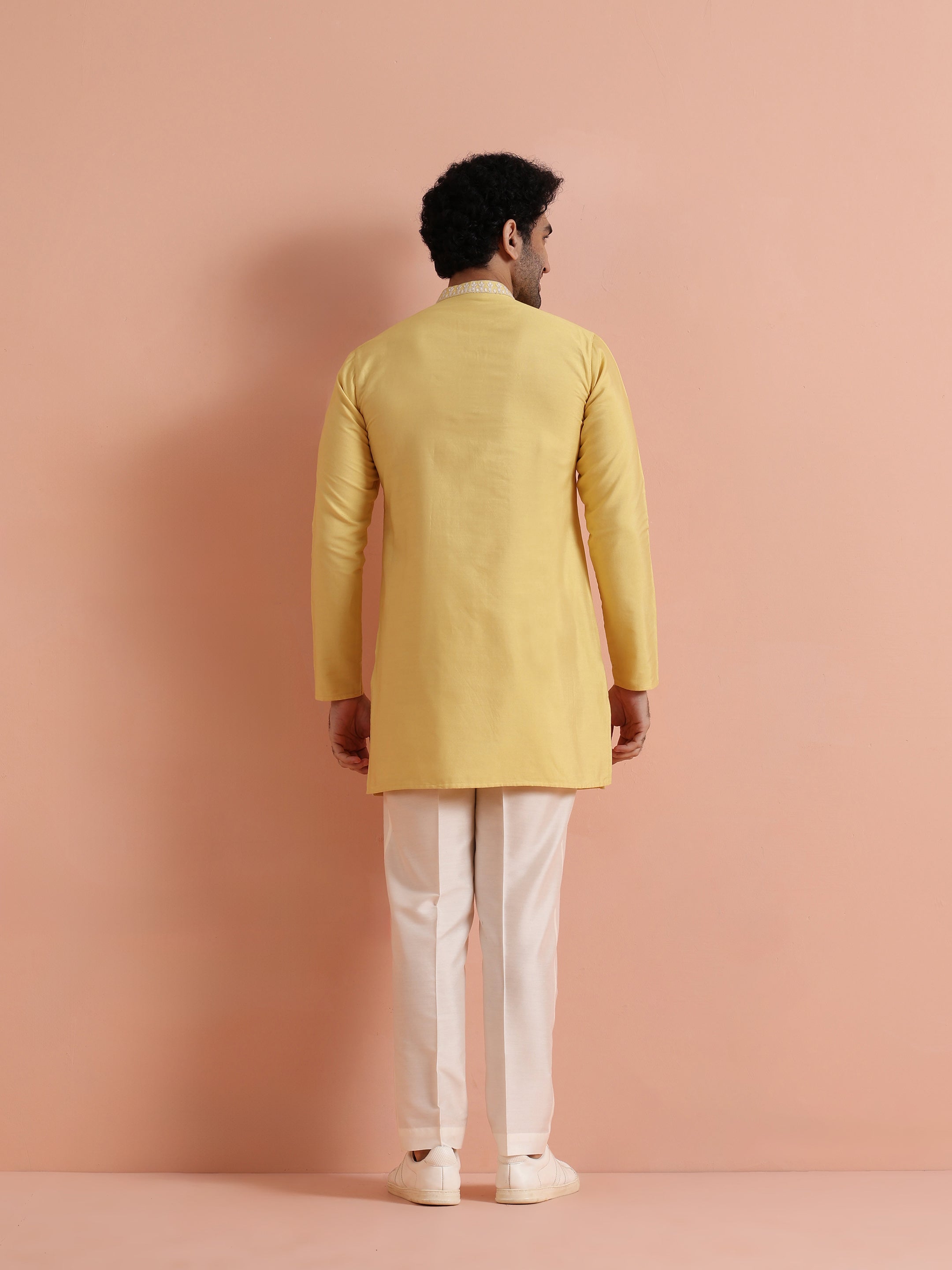Bright yellow embroidered poly silk mid kurta by Kisah. Perfect festive wear with elegant neckline detailing and comfortable fit for celebrations.
