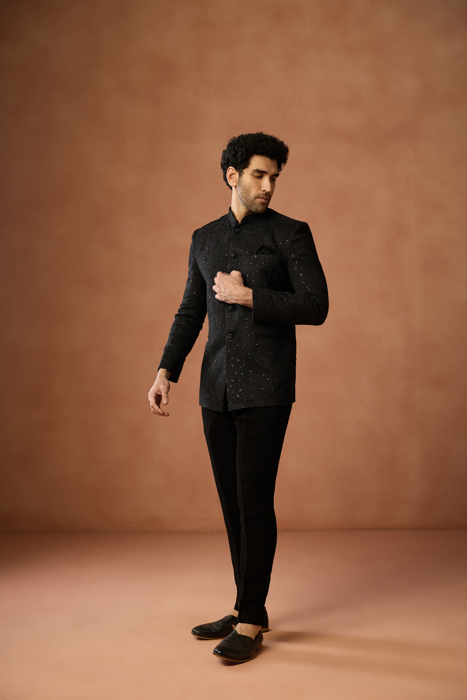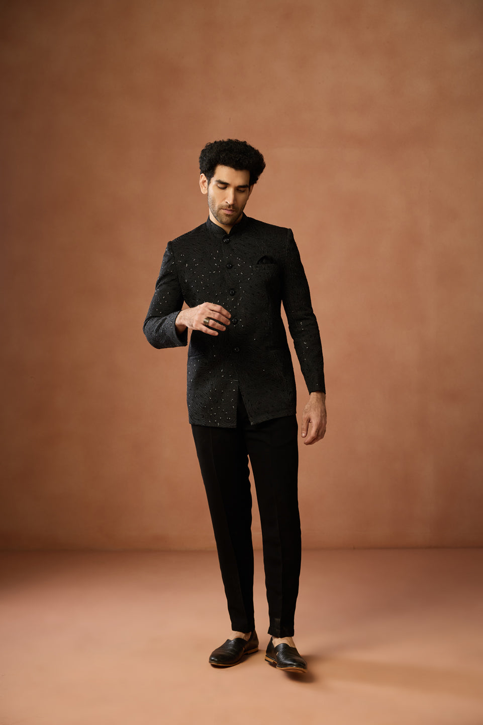 Black Poly Silk Jacquard Bandhgala Trouser Set, Perfect festive ethnic wear for men, ideal festive and casual occasions.