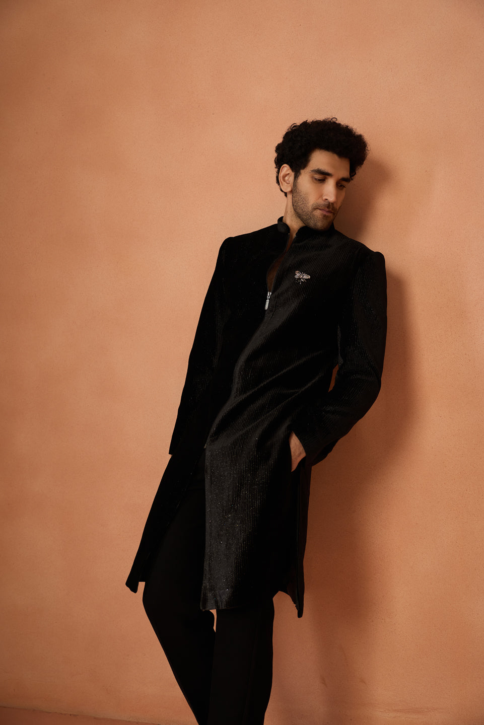 Black Polyviscose Glitter Velvet Sherwani with Zip Trouser Set, Perfect festive ethnic wear for men, ideal festive and casual occasions.