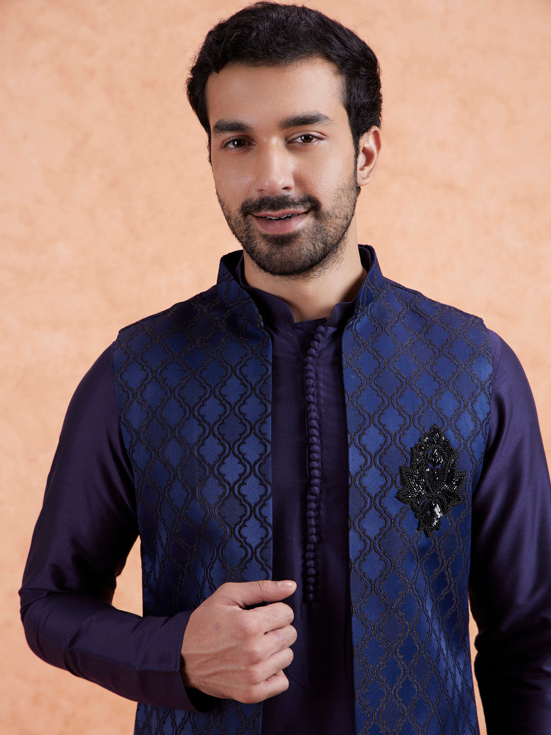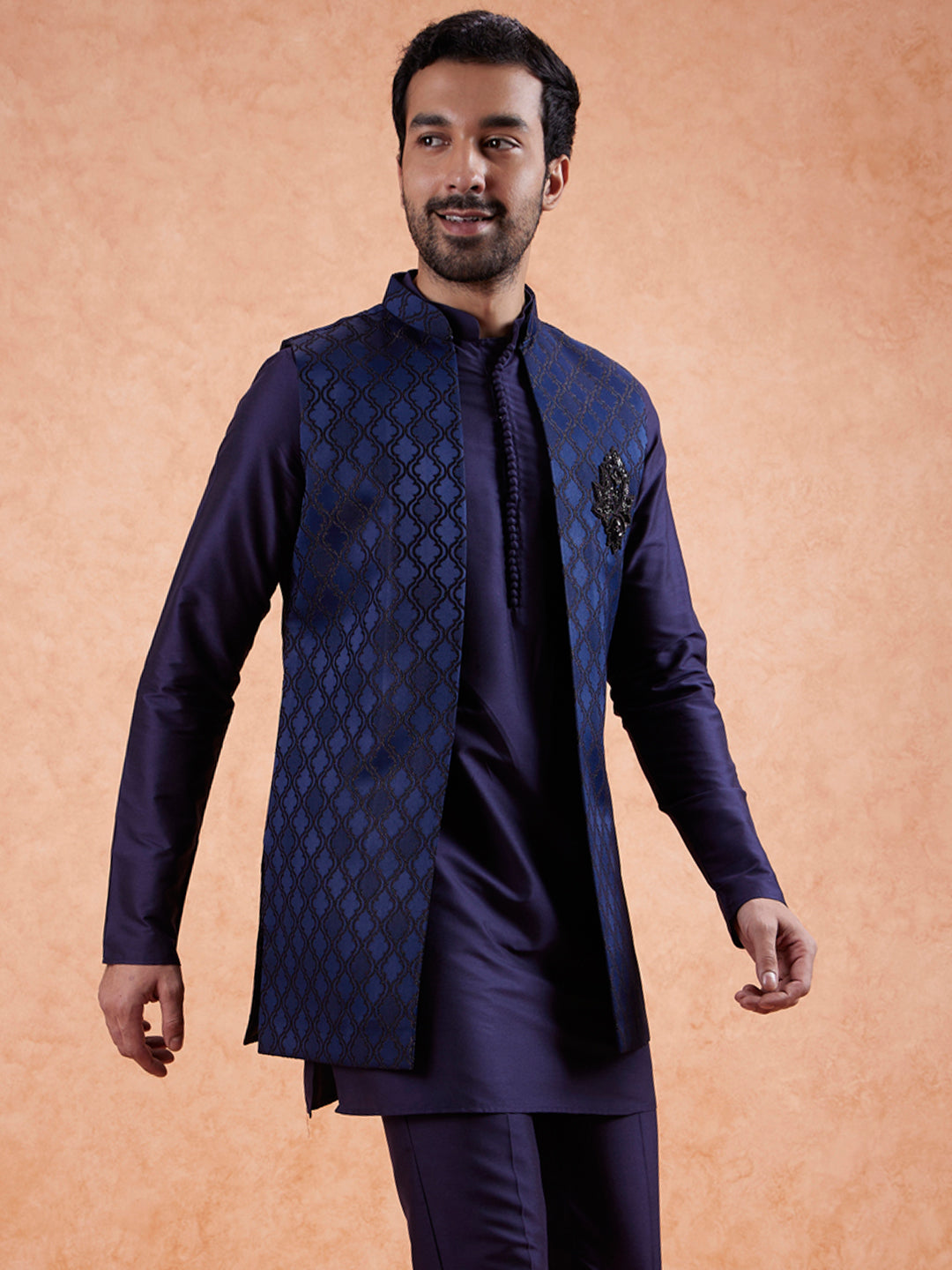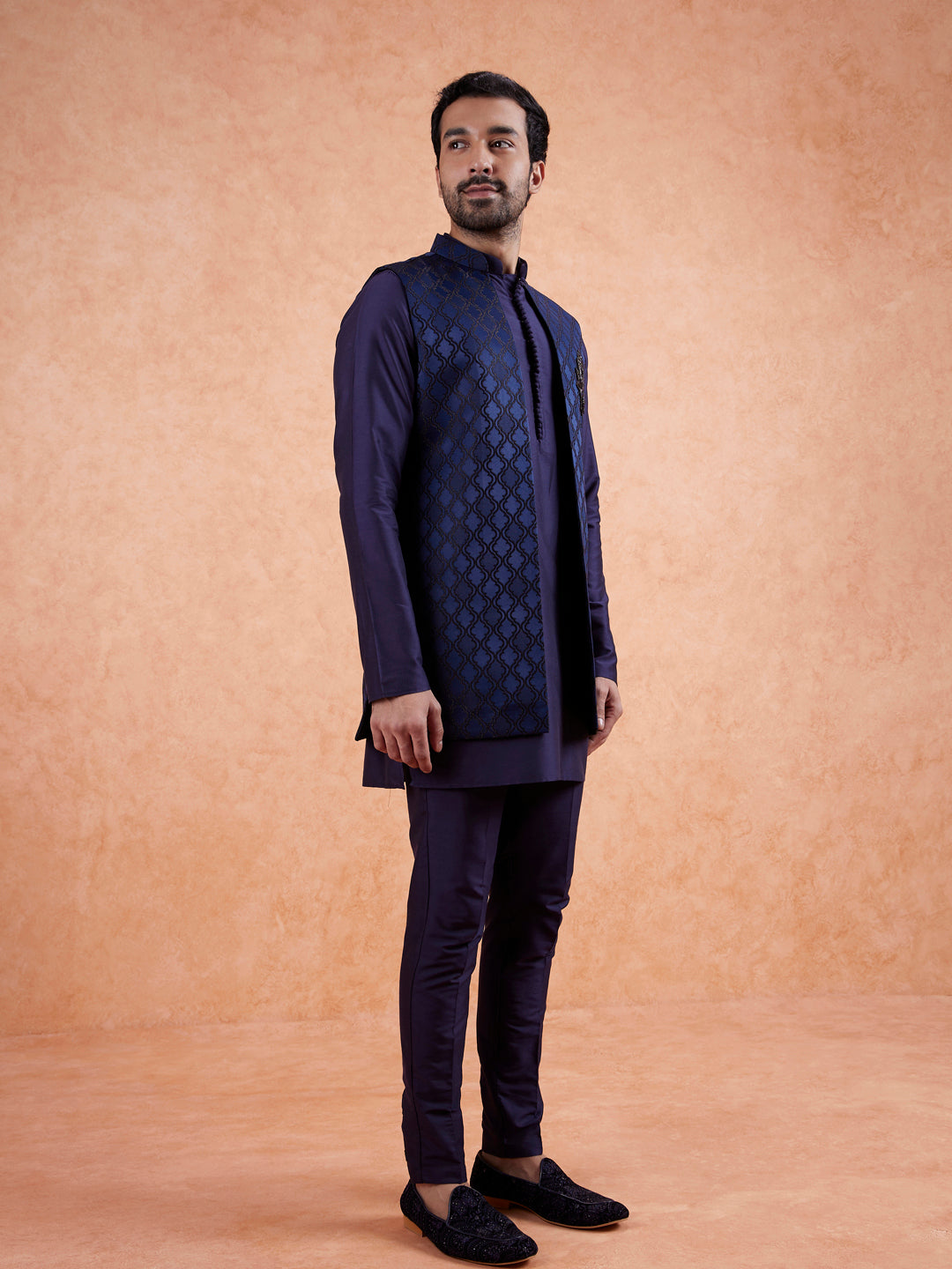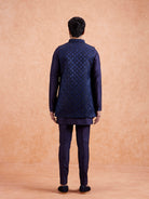 Blue Silk Blend Ethnic Motifs Mid Kurta Front Open Jacket Trouser Set, Perfect festive ethnic wear for men, ideal festive and casual occasions.