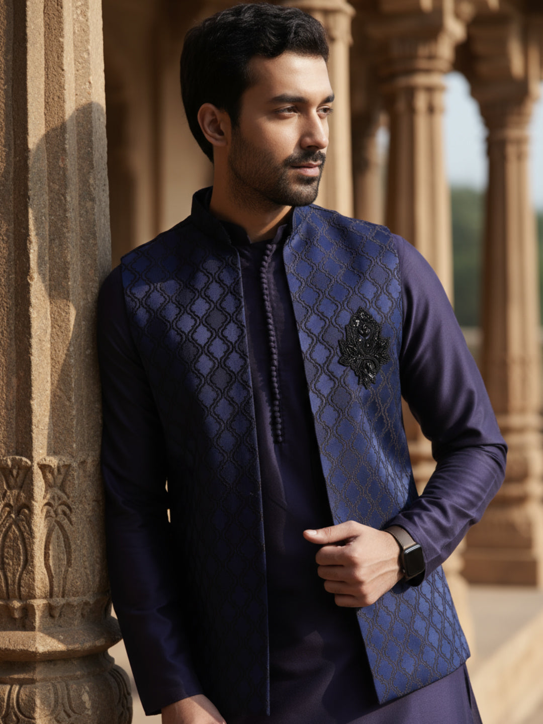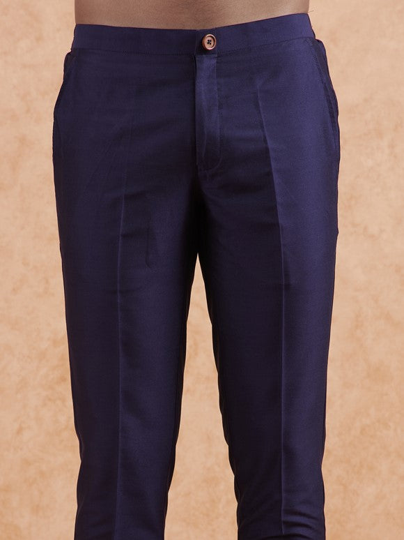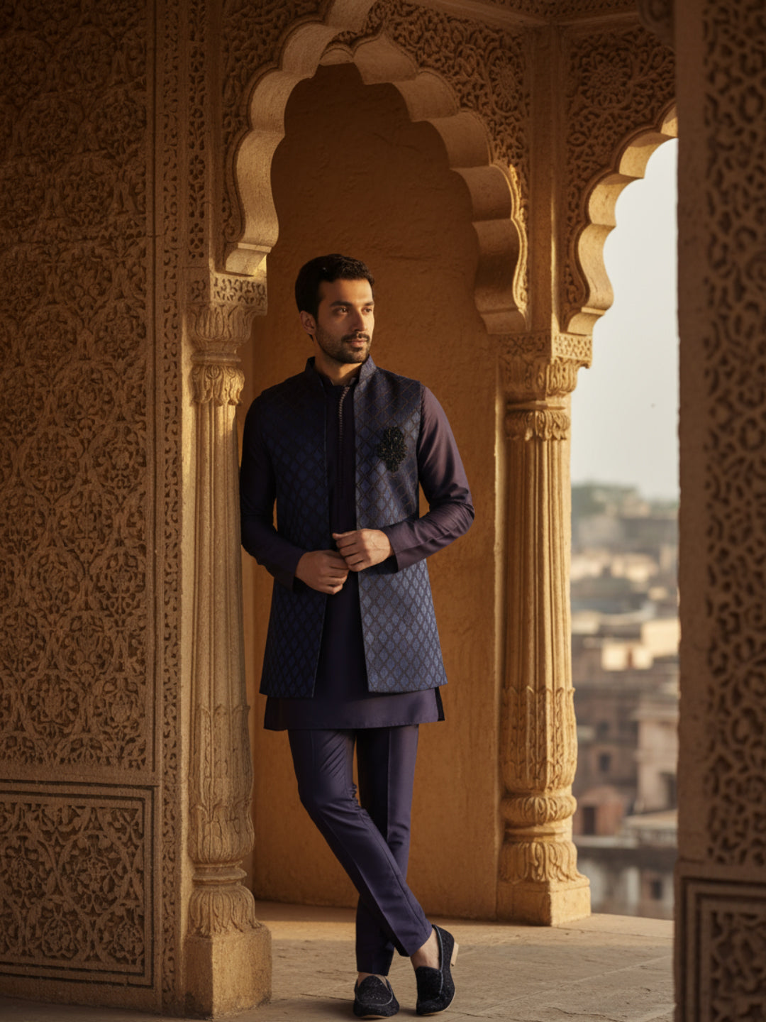 Blue Silk Blend Ethnic Motifs Mid Kurta Front Open Jacket Trouser Set, Perfect festive ethnic wear for men, ideal festive and casual occasions.