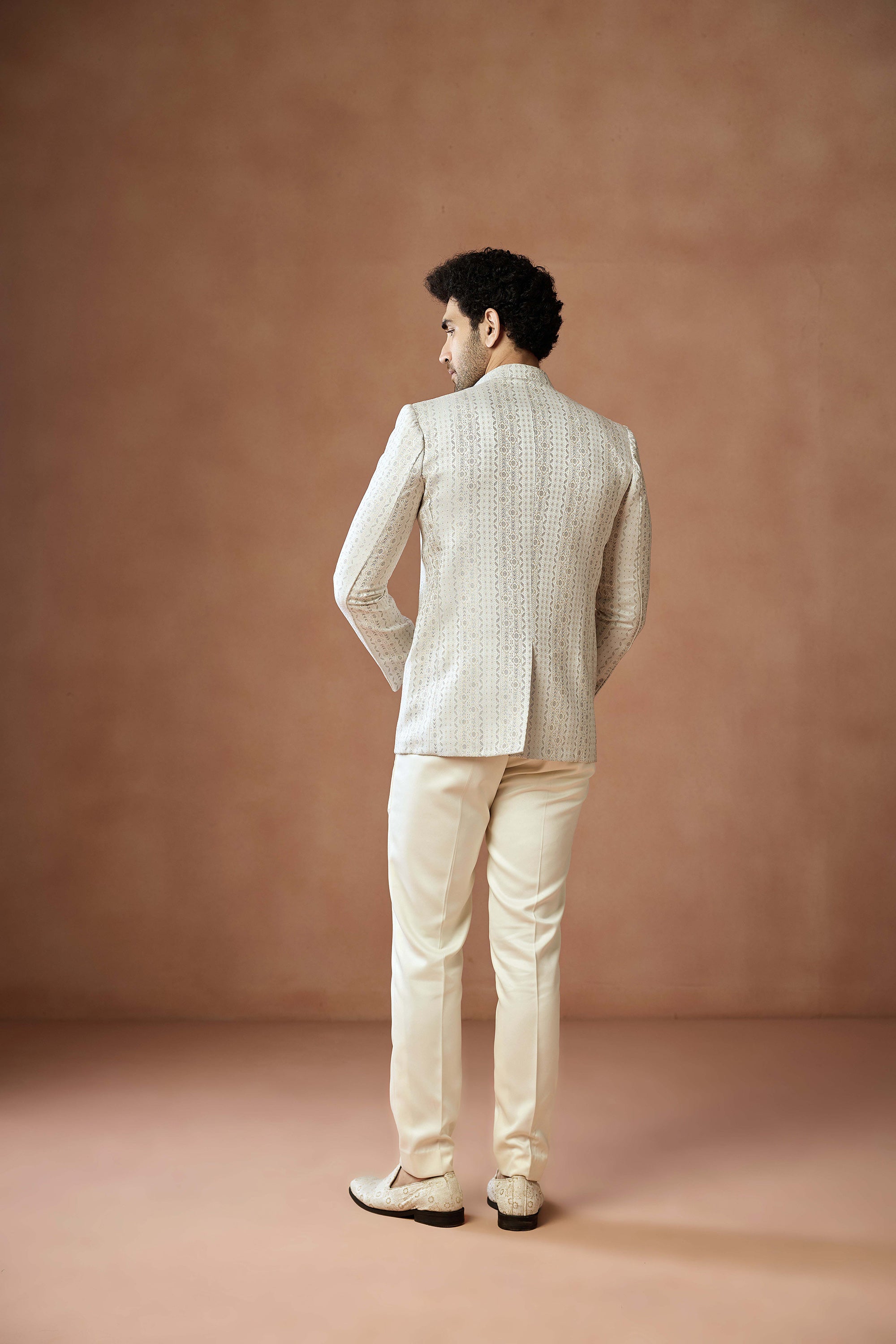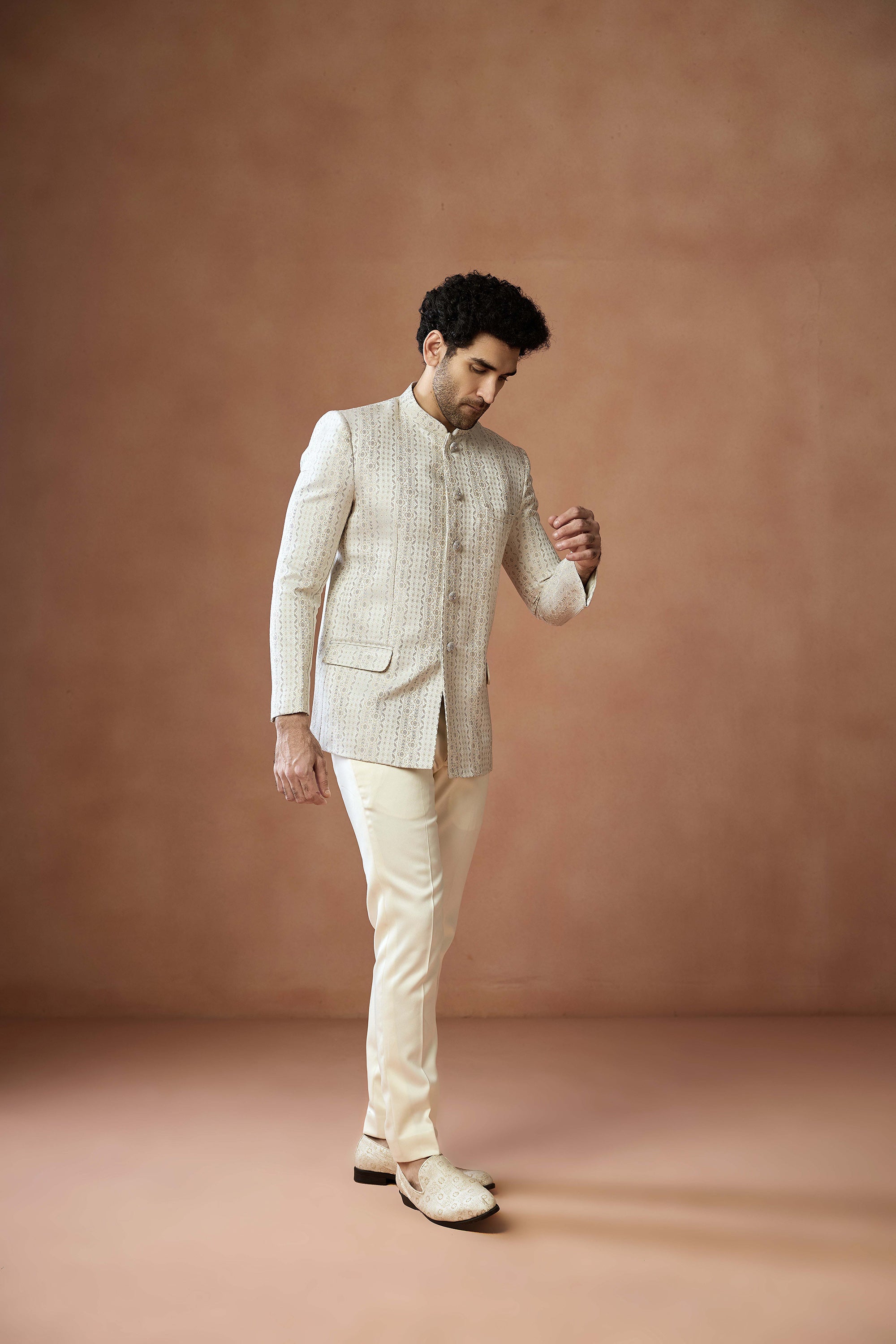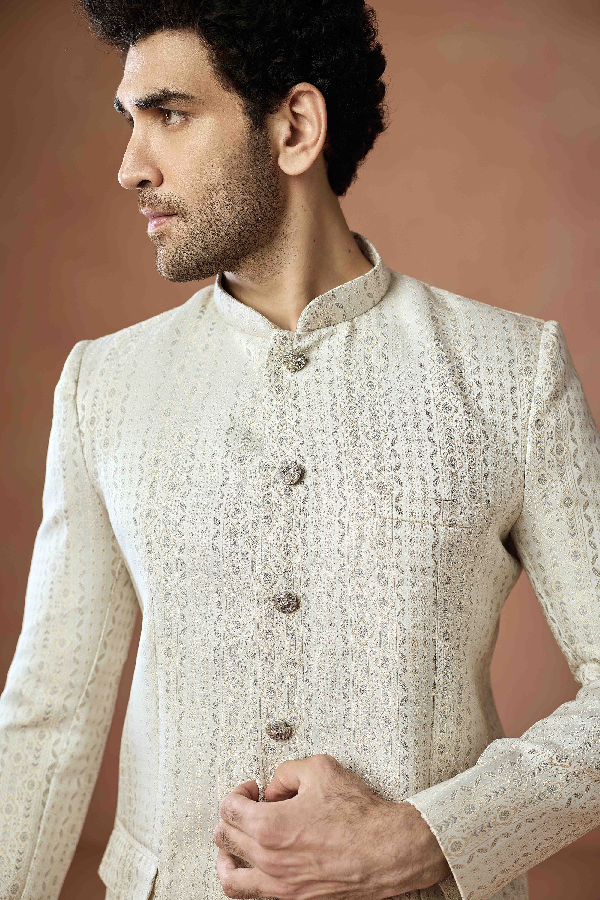 Cream silk blend jacquard bandhgala jacket for men. Jodhpuri style with silver buttons, perfect for weddings, receptions & festive occasions.