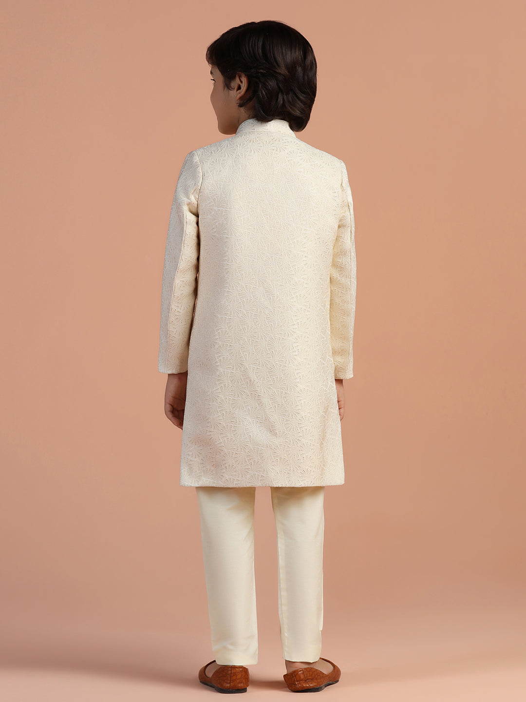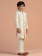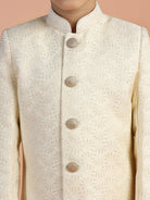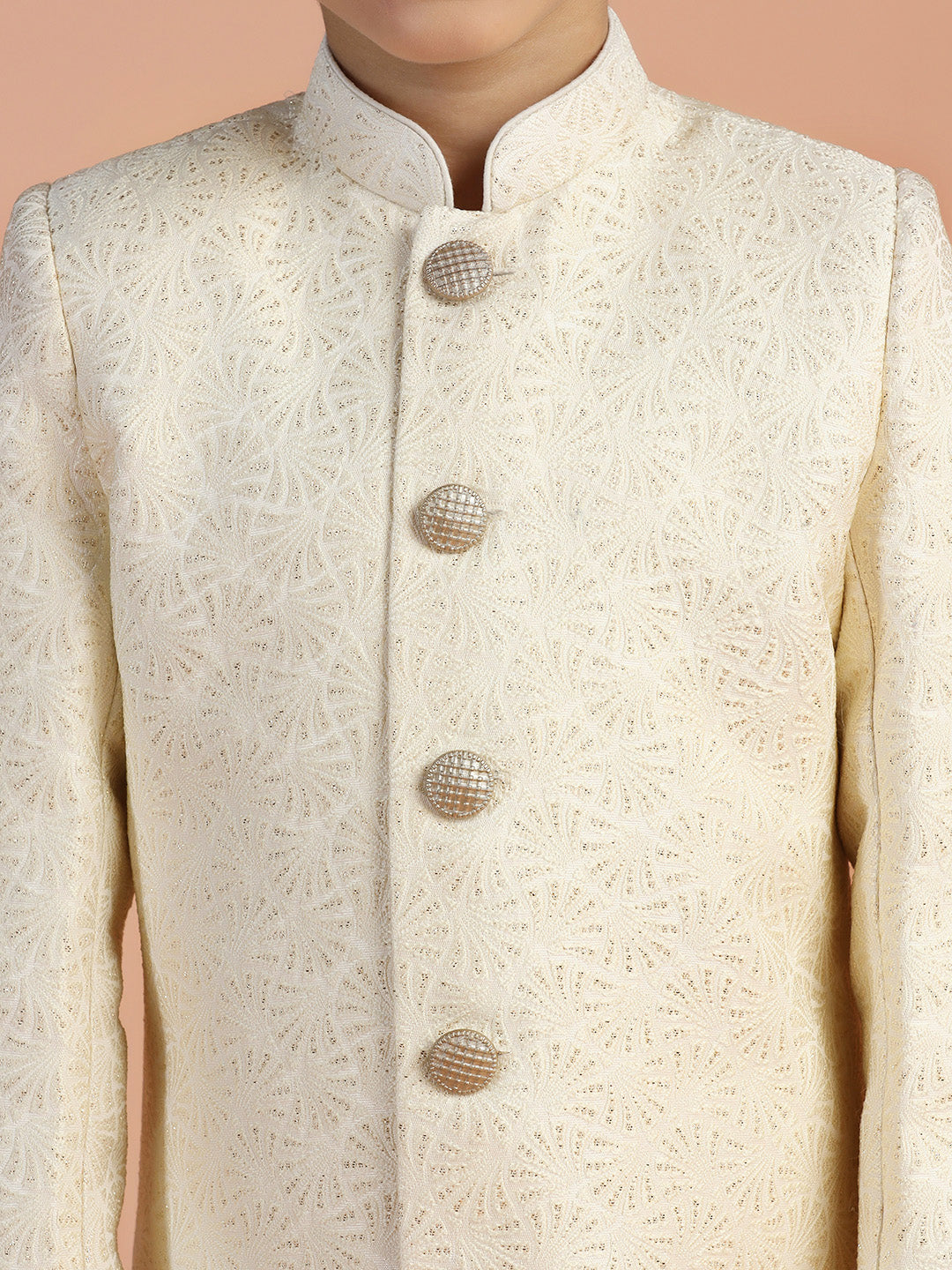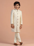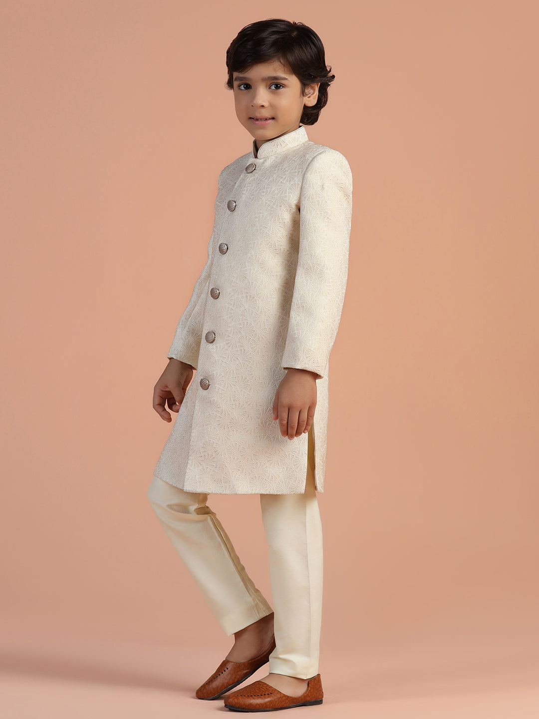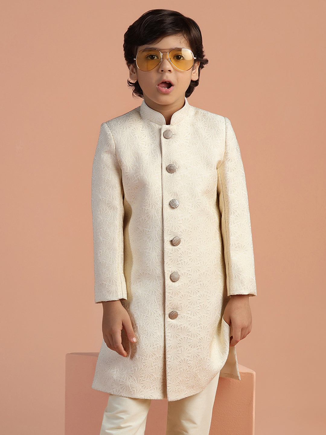 Ivory jacquard sherwani pyjama set for boys – perfect for weddings and festive occasions with a royal, elegant finish.