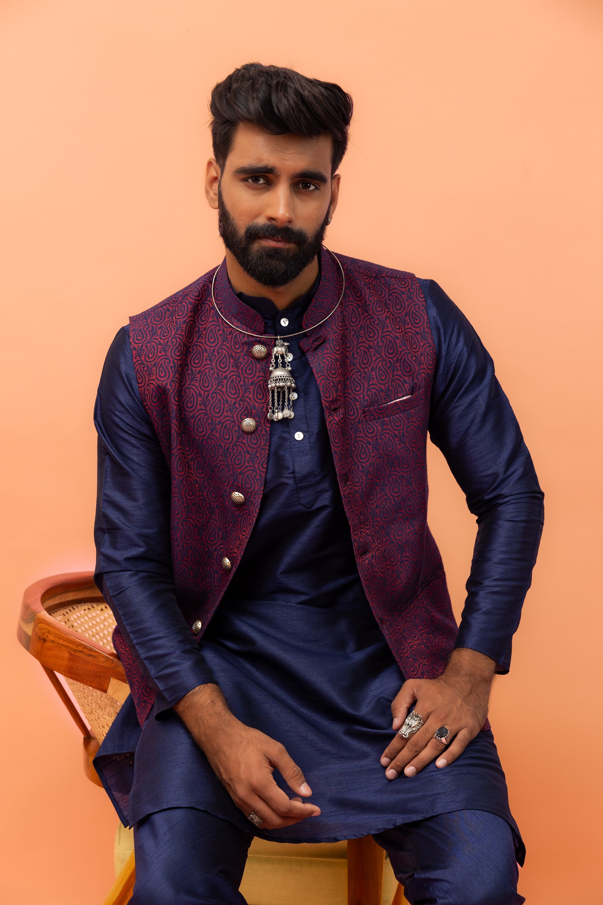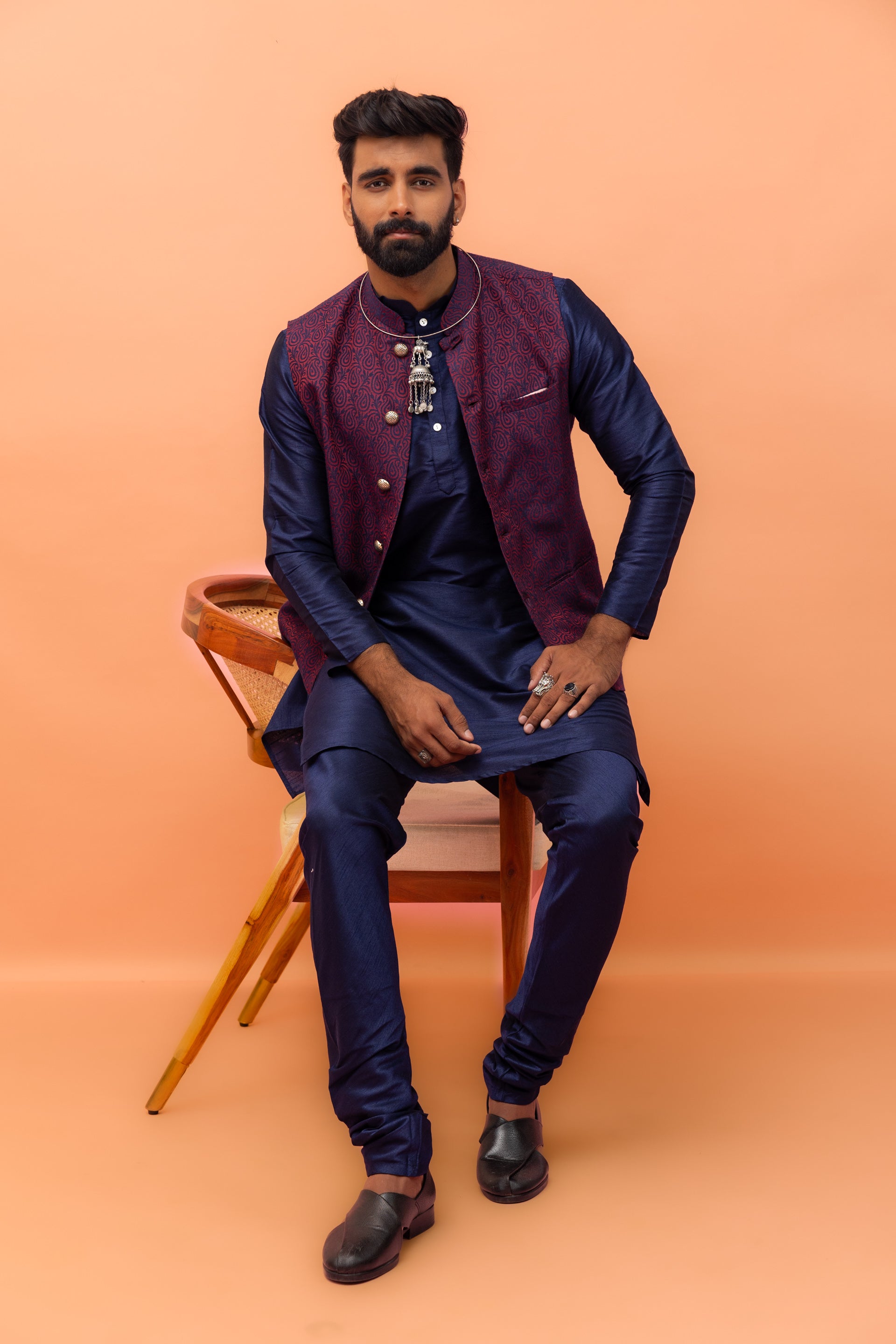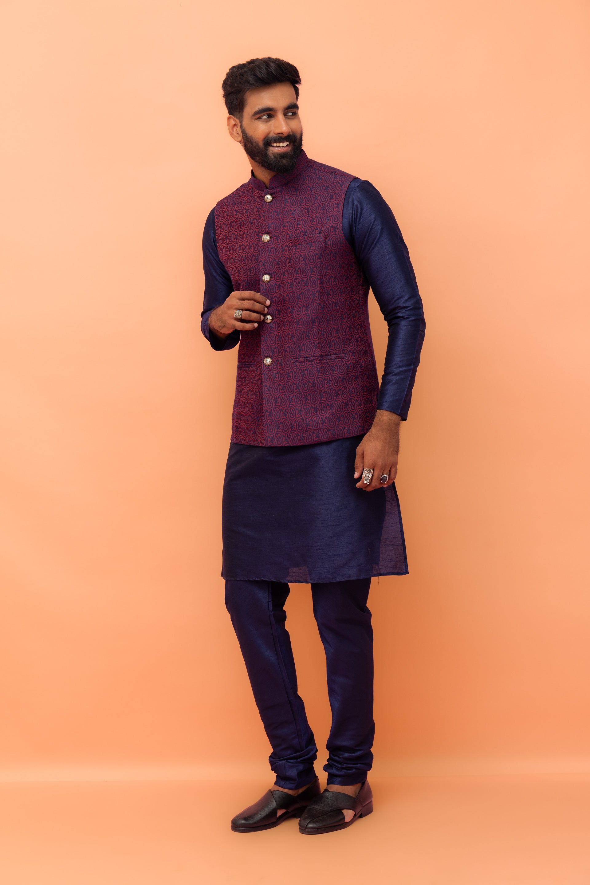 Add elegance with this maroon cotton blend kurta, jacket, and churidar set. Featuring a textured design and regular fit, it’s perfect for festive occasions or traditional gatherings.