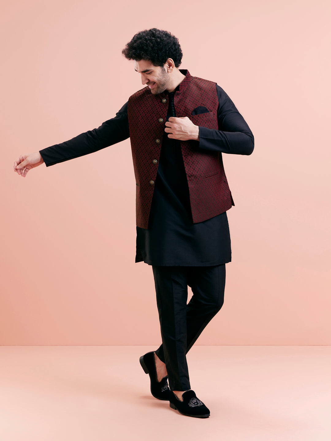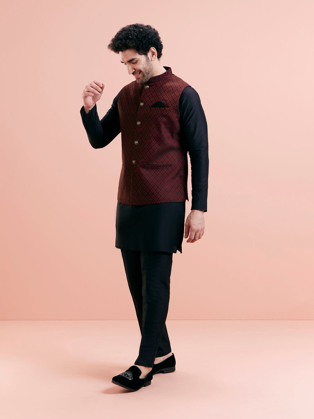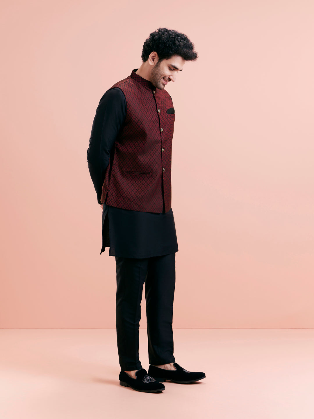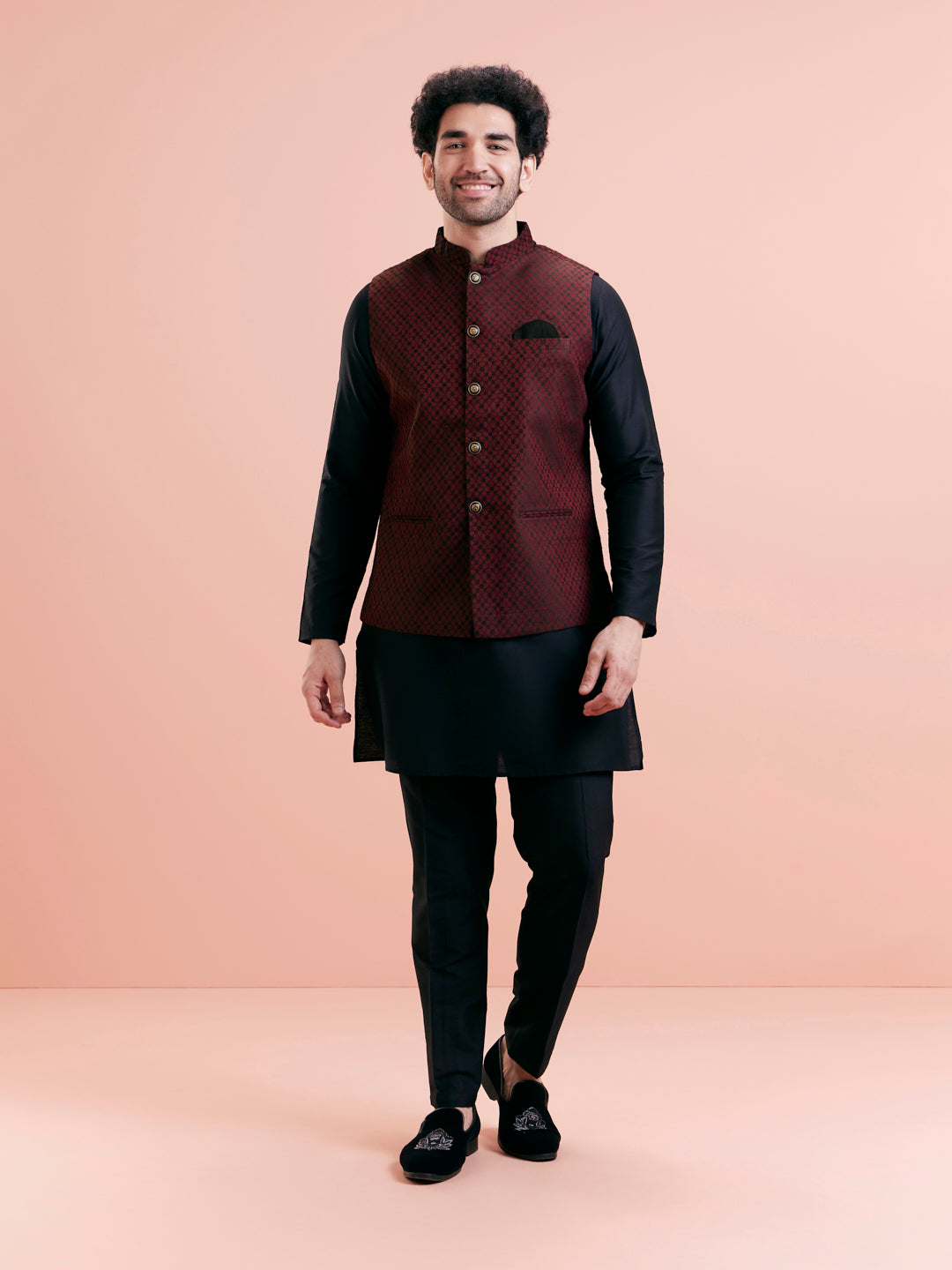 This Maroon Silk Blend Kurta Jacket Trouser Set features a geometric Nehru Jacket (also called Bundi Jacket), black mid kurta and trousers. A standout option for weddings and evening events.