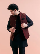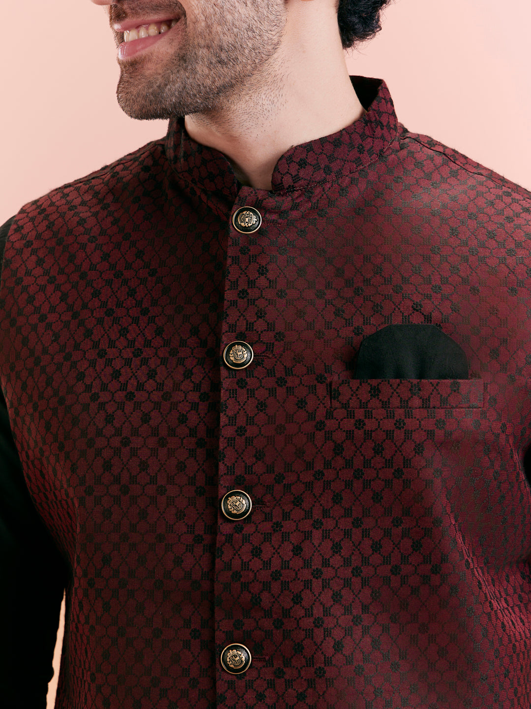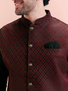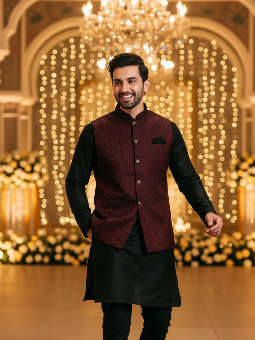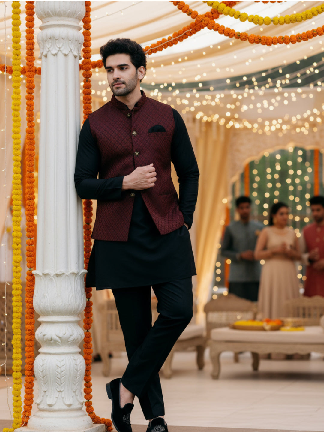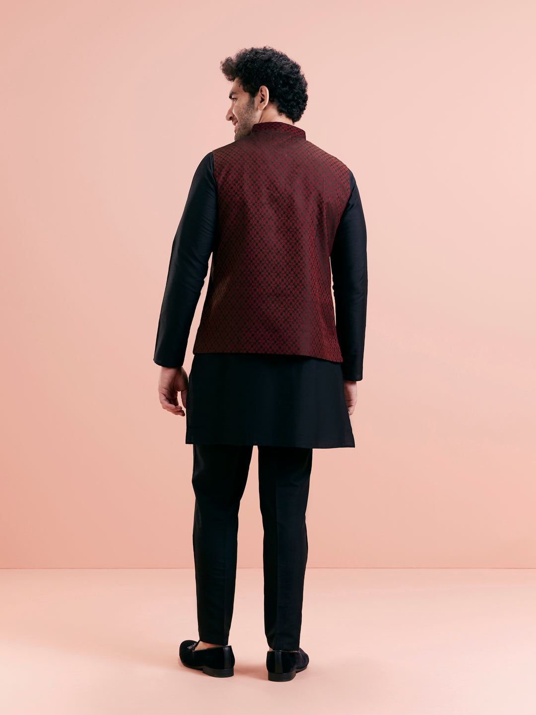 This Maroon Silk Blend Kurta Jacket Trouser Set features a geometric Nehru Jacket (also called Bundi Jacket), black mid kurta and trousers. A standout option for weddings and evening events.