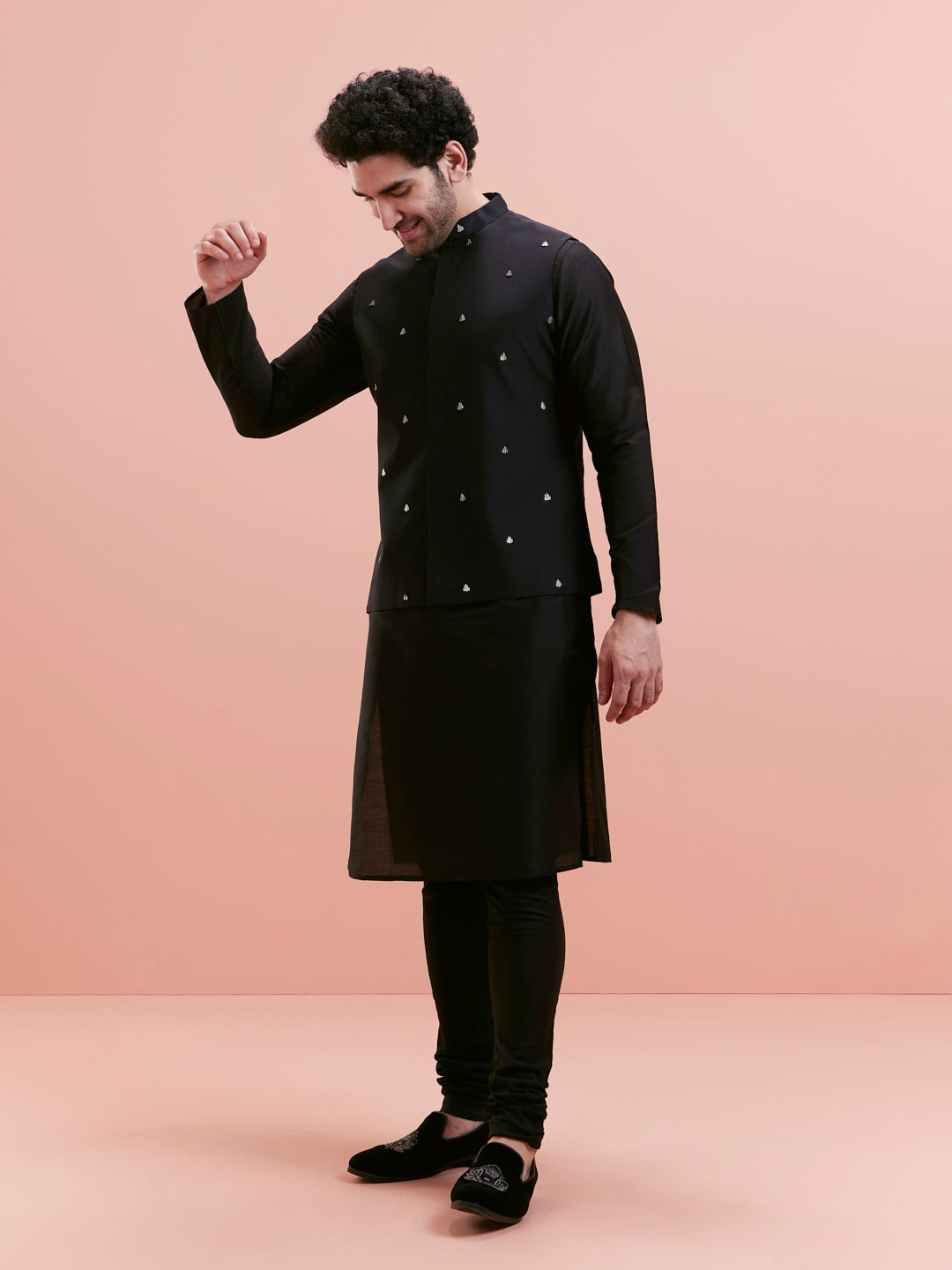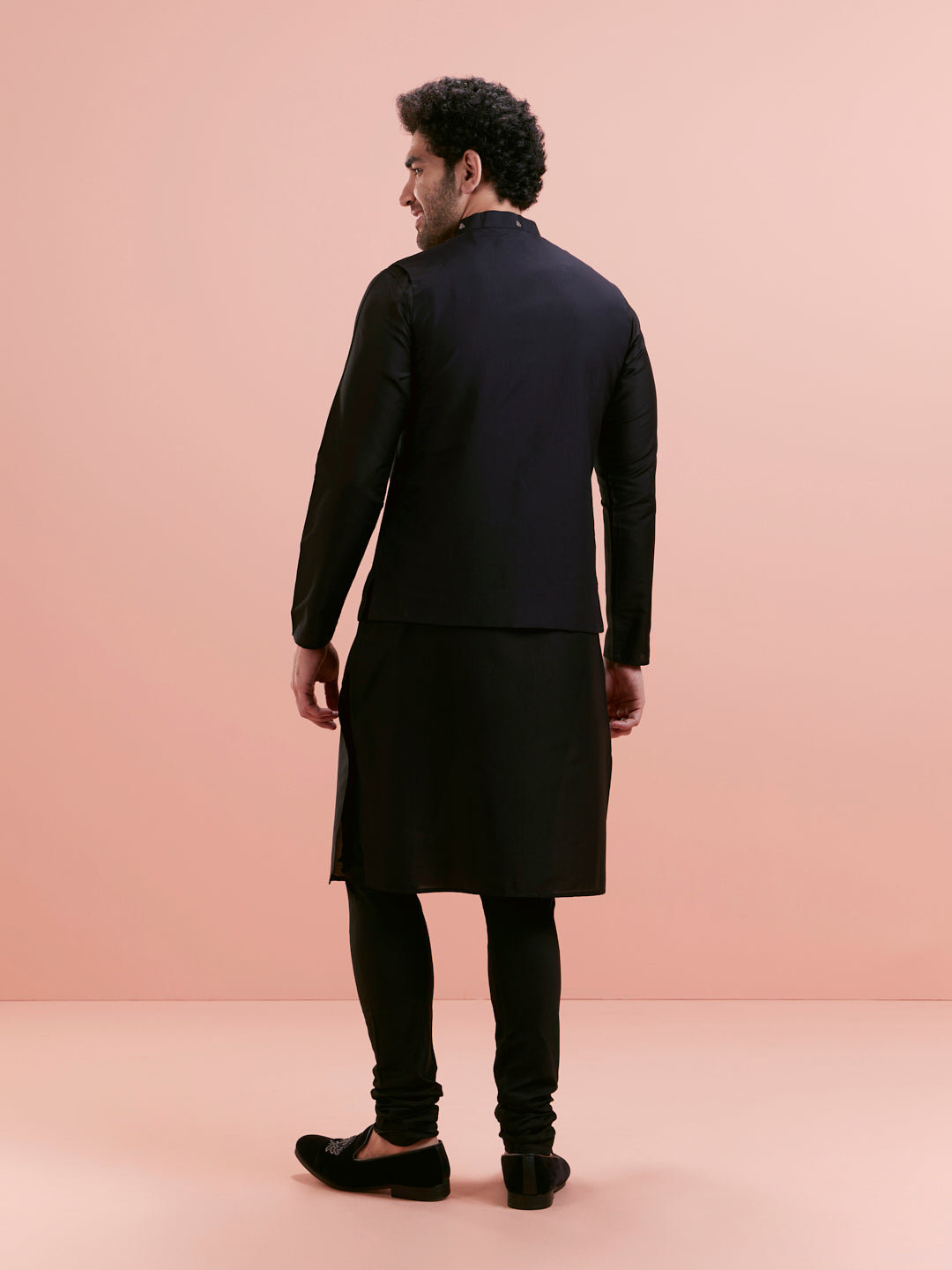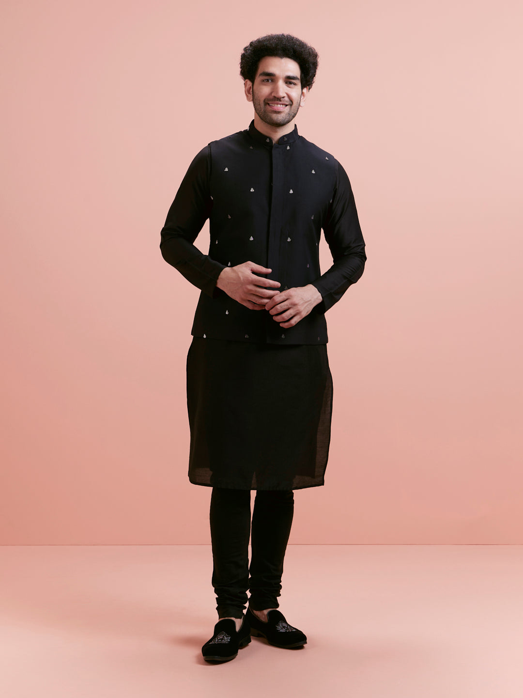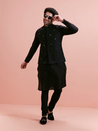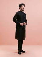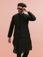 This Black Cotton Blend Kurta Jacket Churidar Set includes a tone-on-tone embroidered Nehru Jacket (aka Bundi), a long kurta, and churidar. Perfect for weddings and festive evenings.