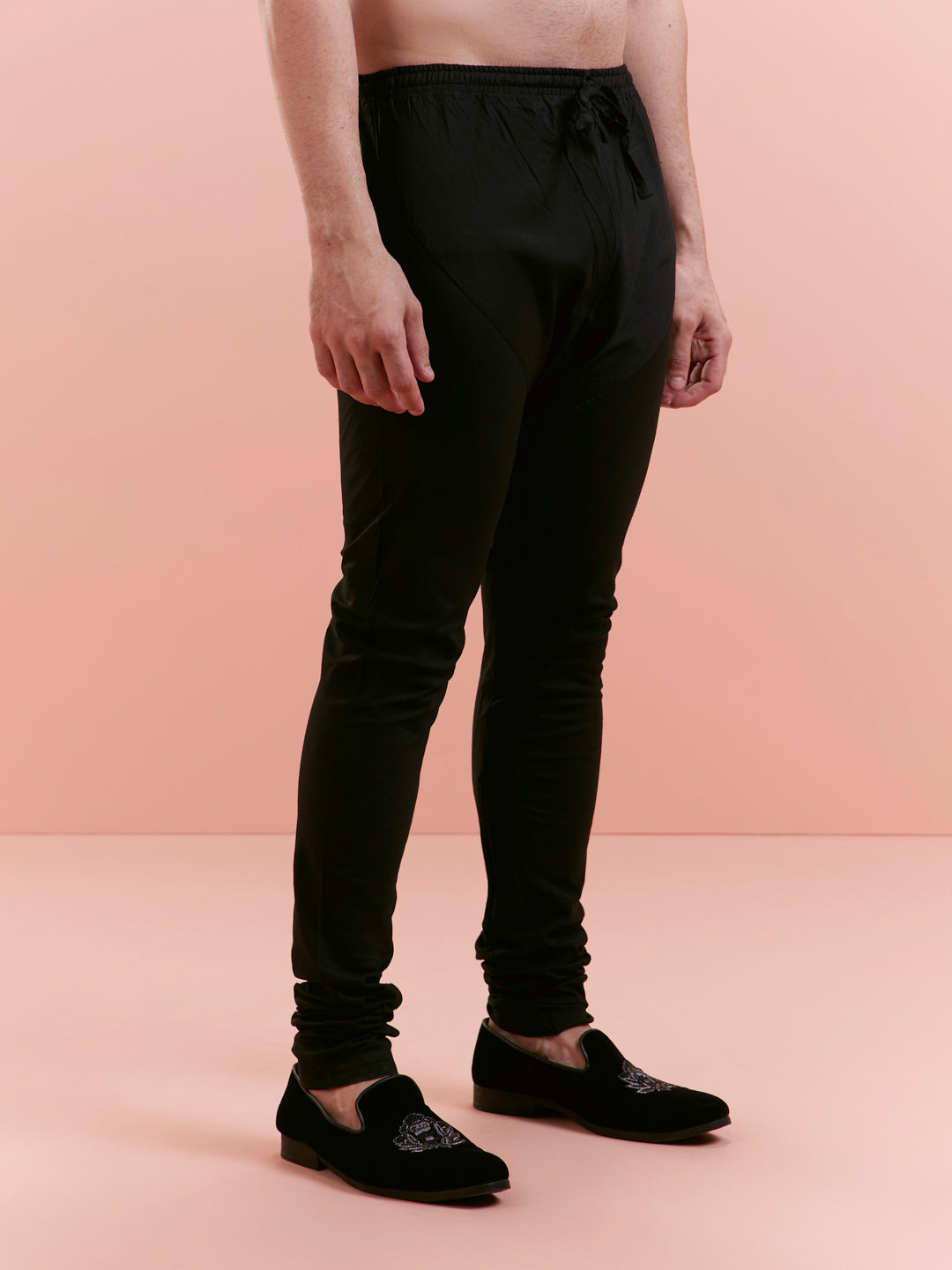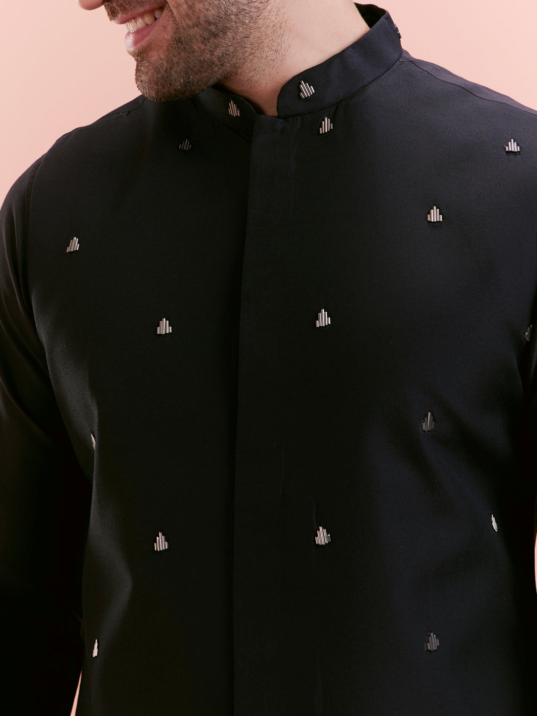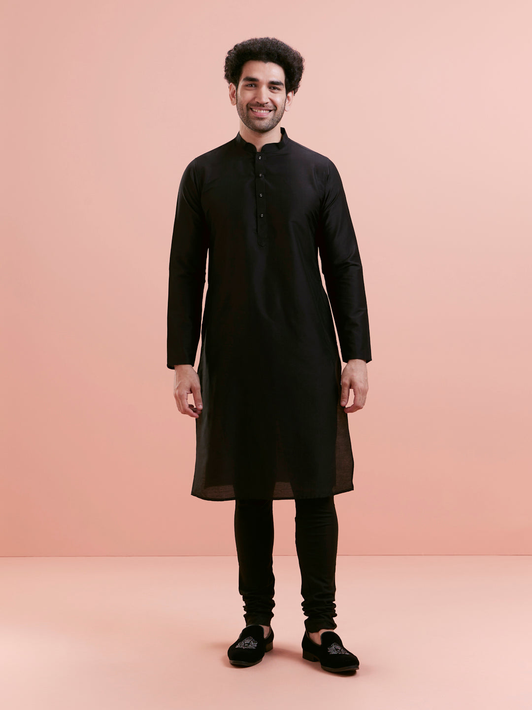 This Black Cotton Blend Kurta Jacket Churidar Set includes a tone-on-tone embroidered Nehru Jacket (aka Bundi), a long kurta, and churidar. Perfect for weddings and festive evenings.