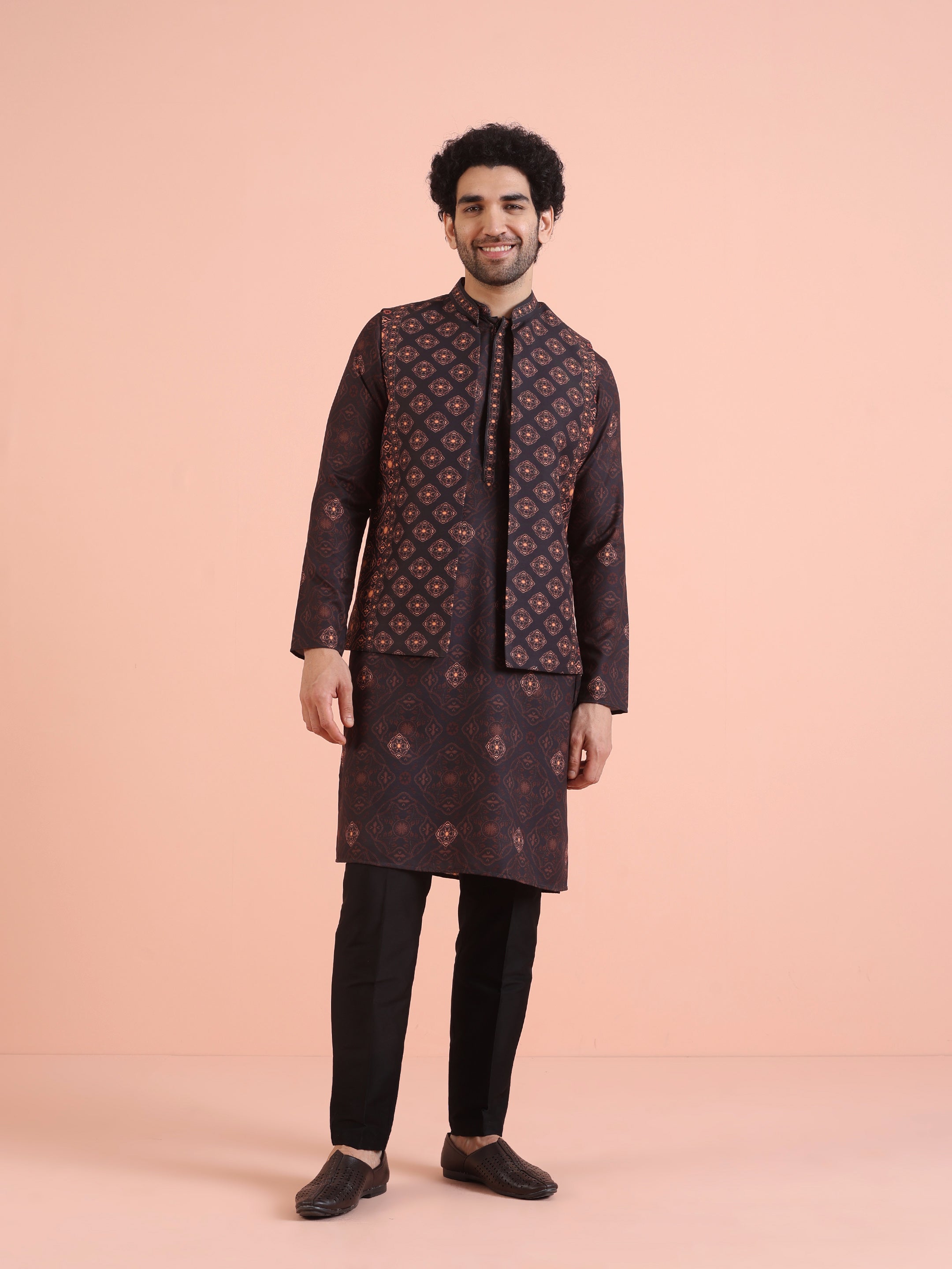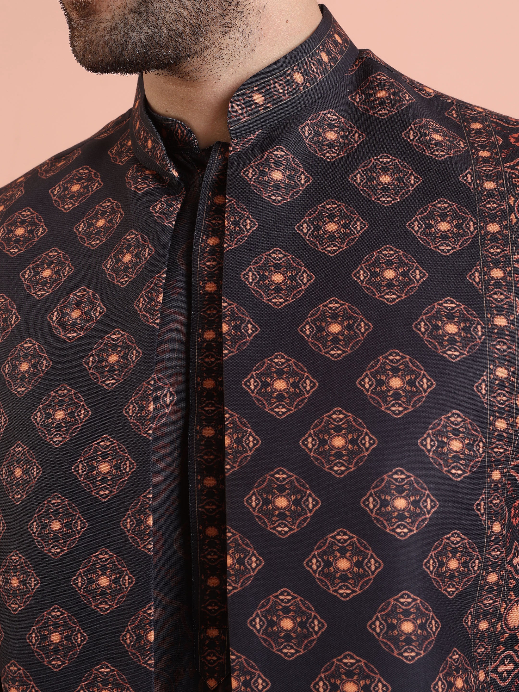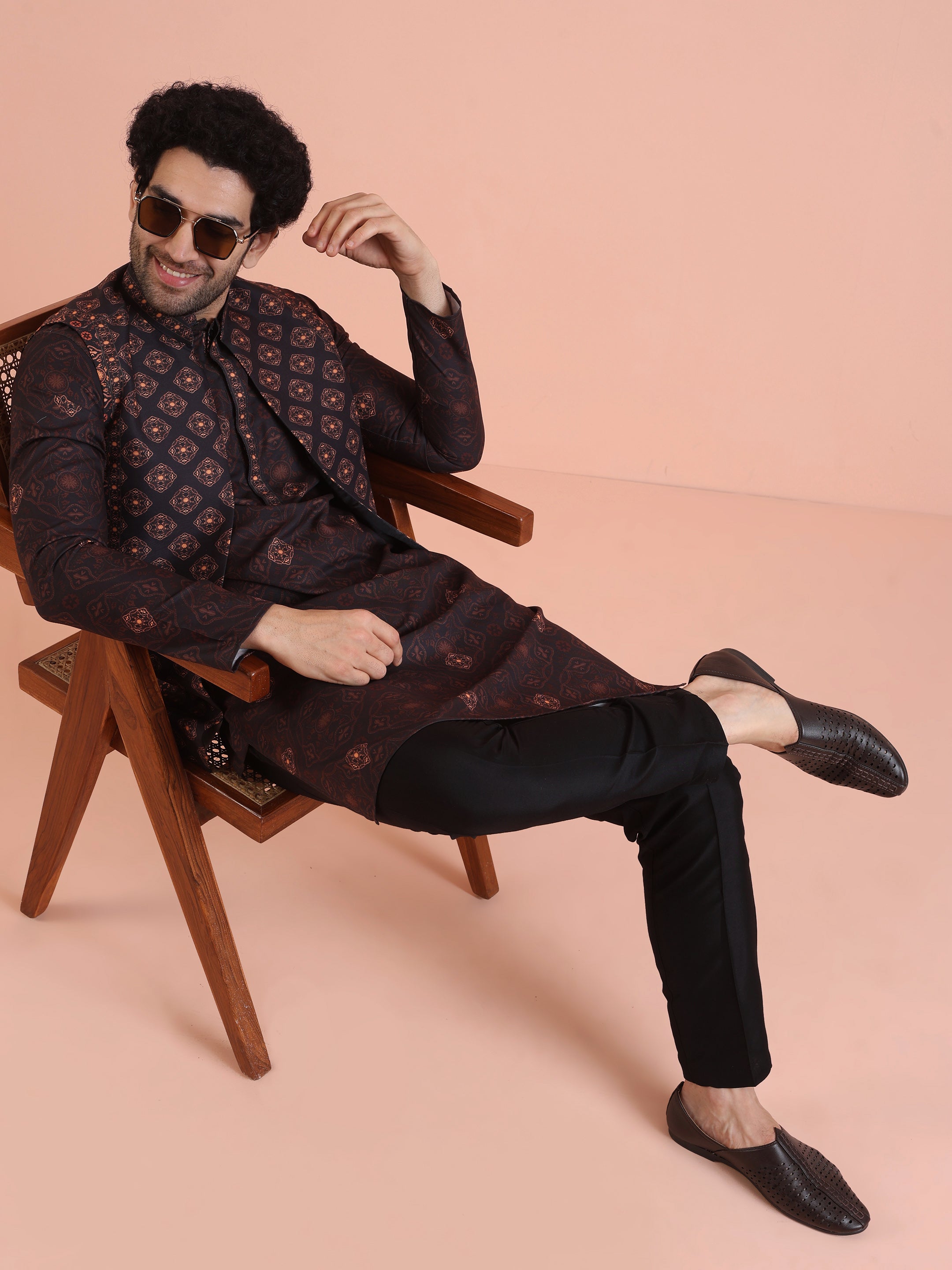 Experience classic elegance with this Men Black Printed Kurta Jacket Trouser Set. The Printed Pattern adds a refined touch, while the breathable fabric ensures comfort throughout the day. Ideal for festive events or casual wear.