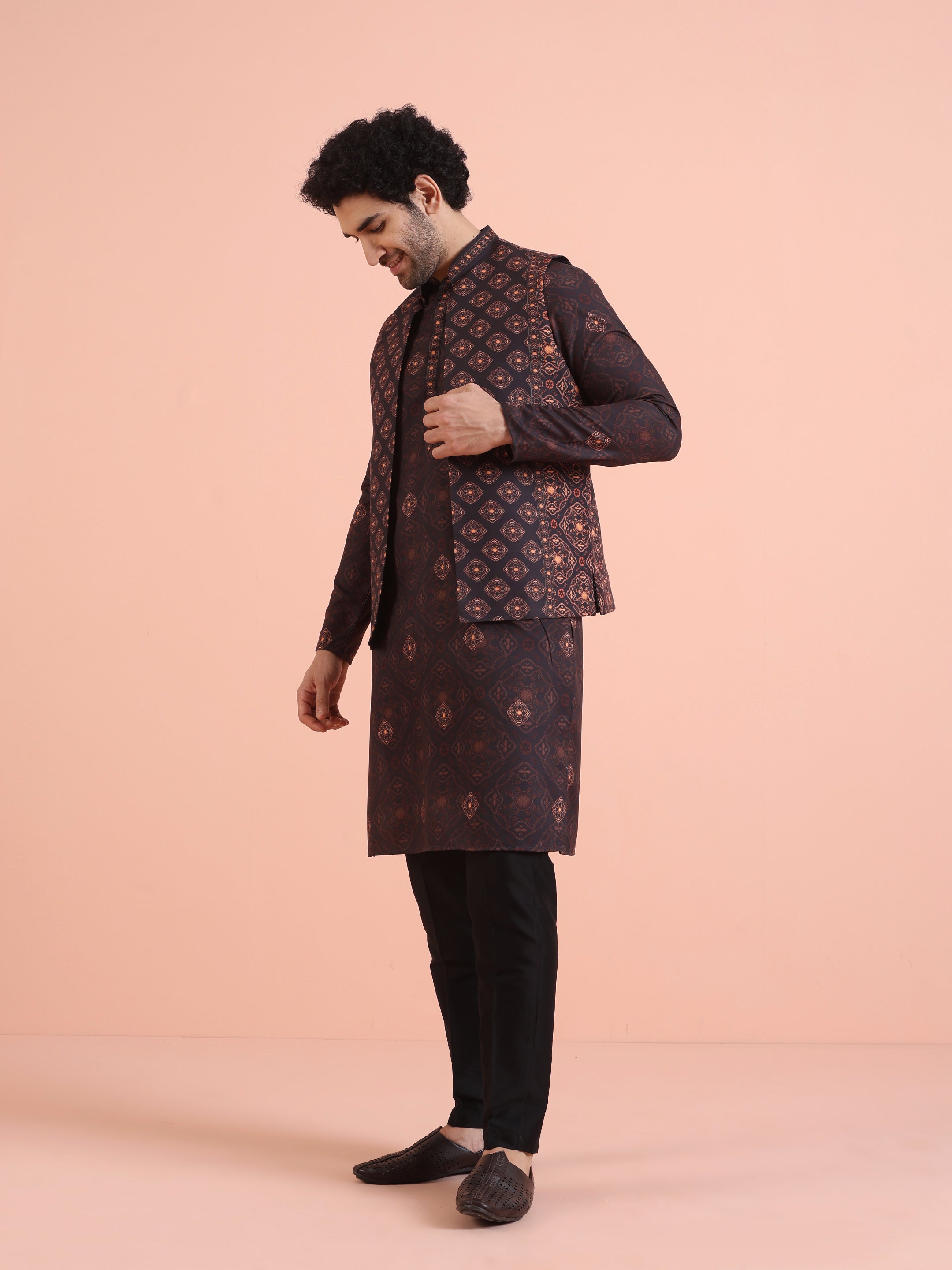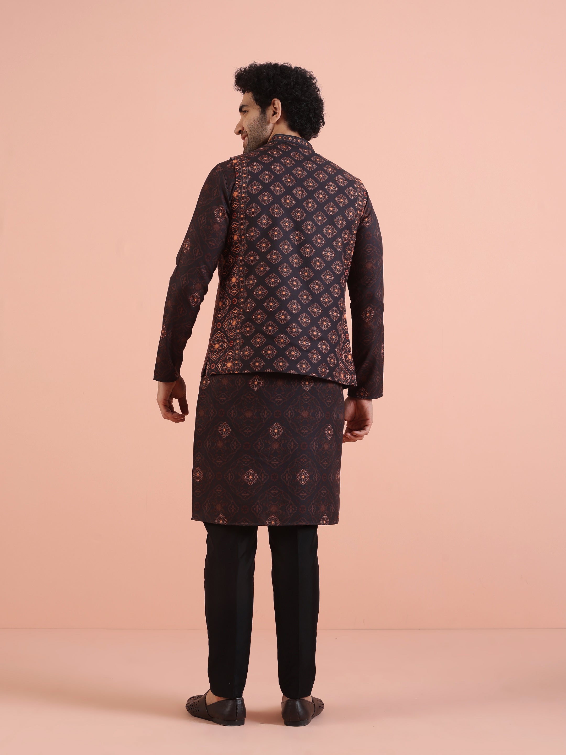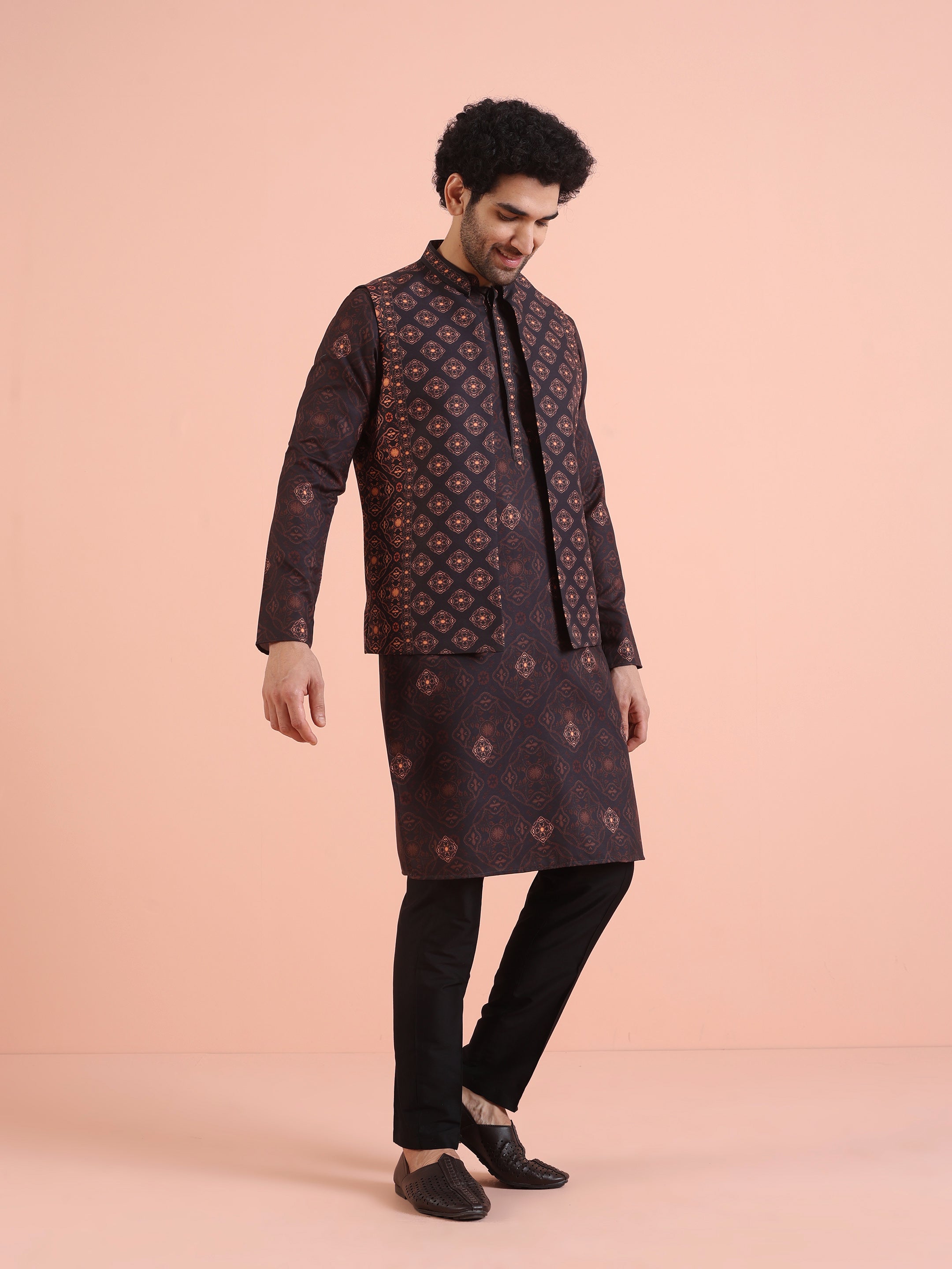 Experience classic elegance with this Men Black Printed Kurta Jacket Trouser Set. The Printed Pattern adds a refined touch, while the breathable fabric ensures comfort throughout the day. Ideal for festive events or casual wear.