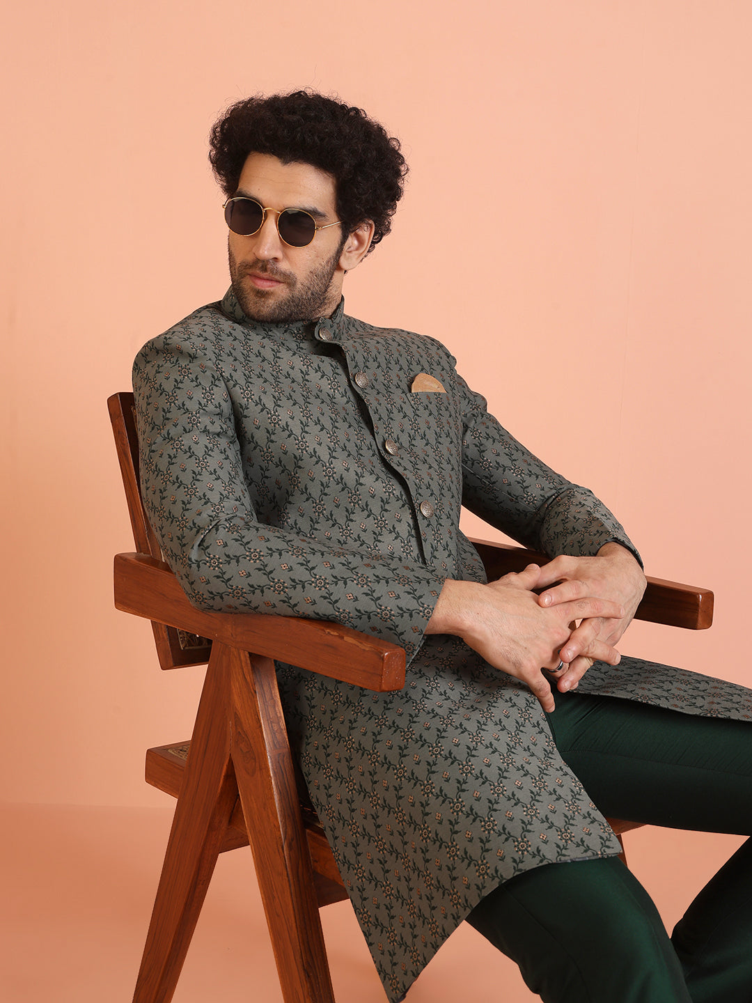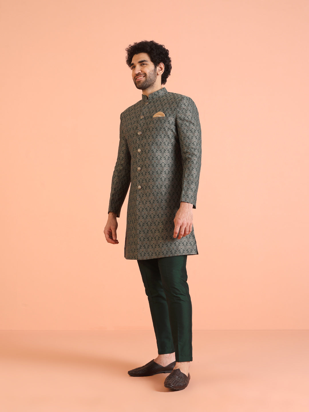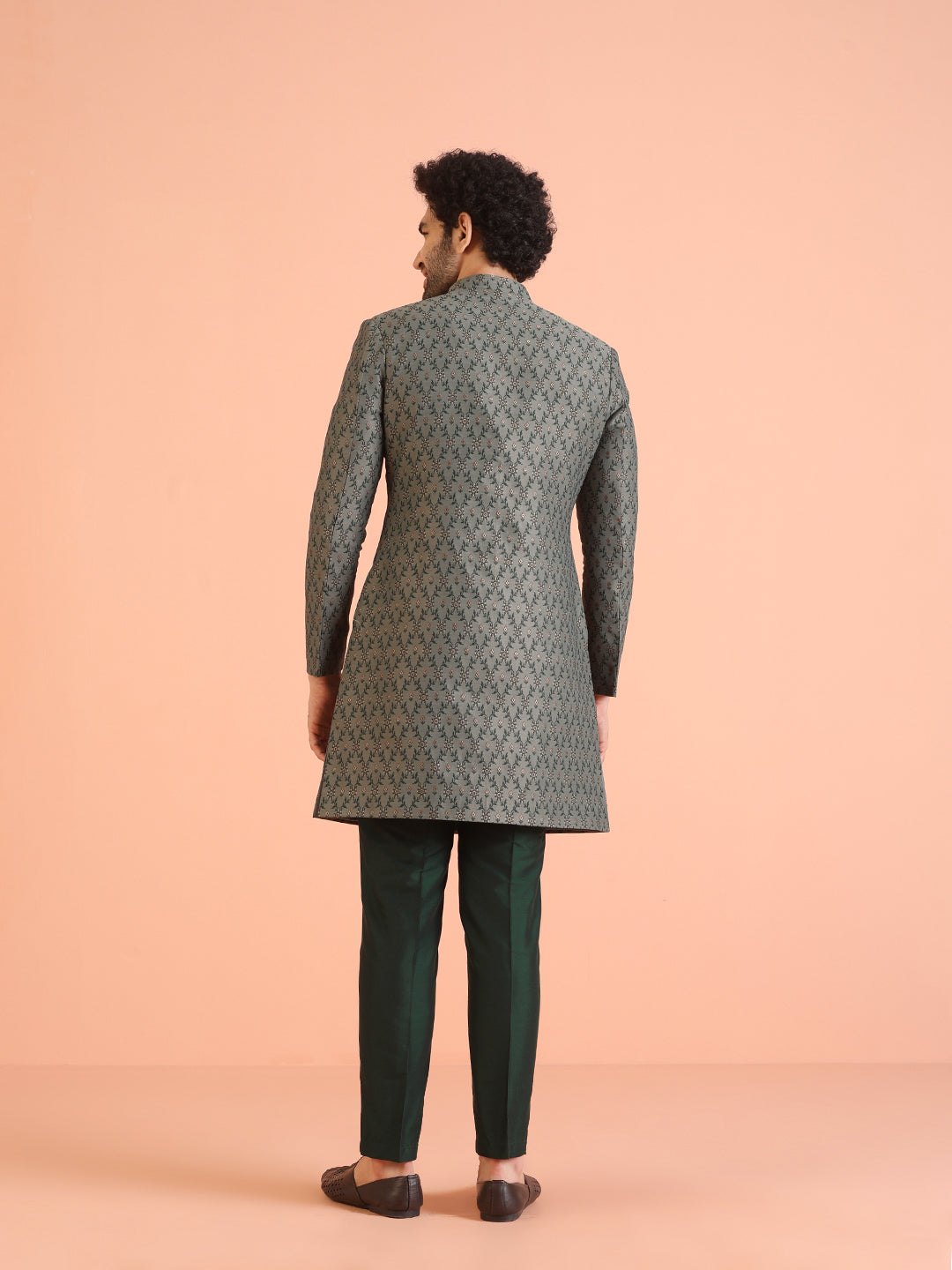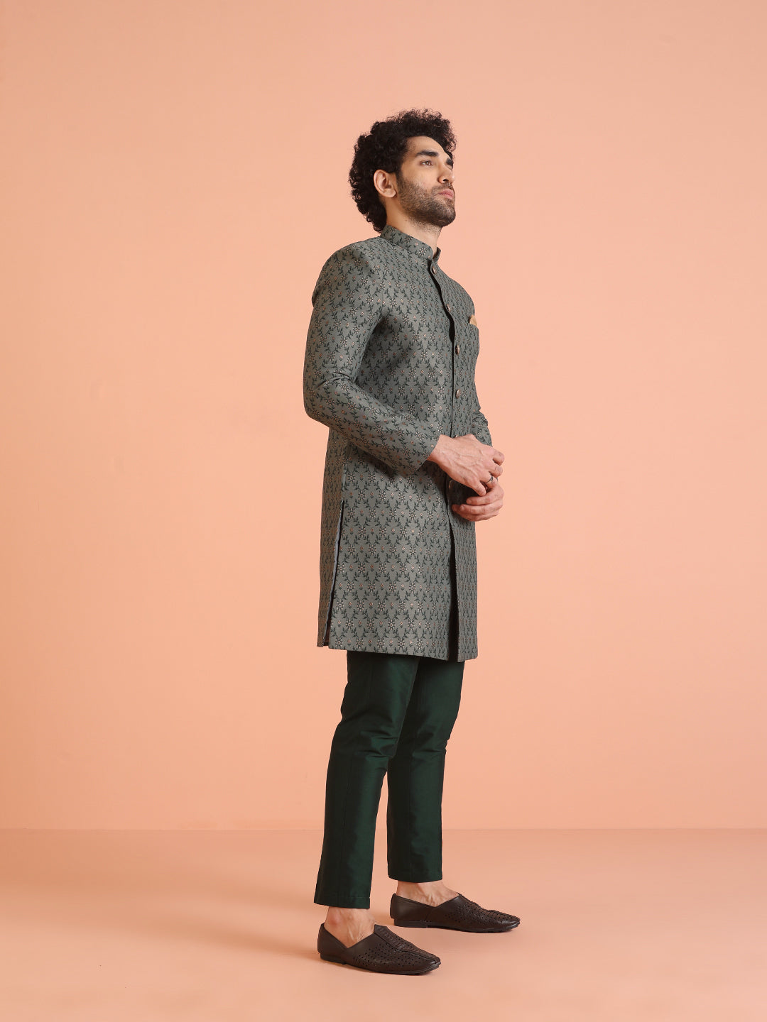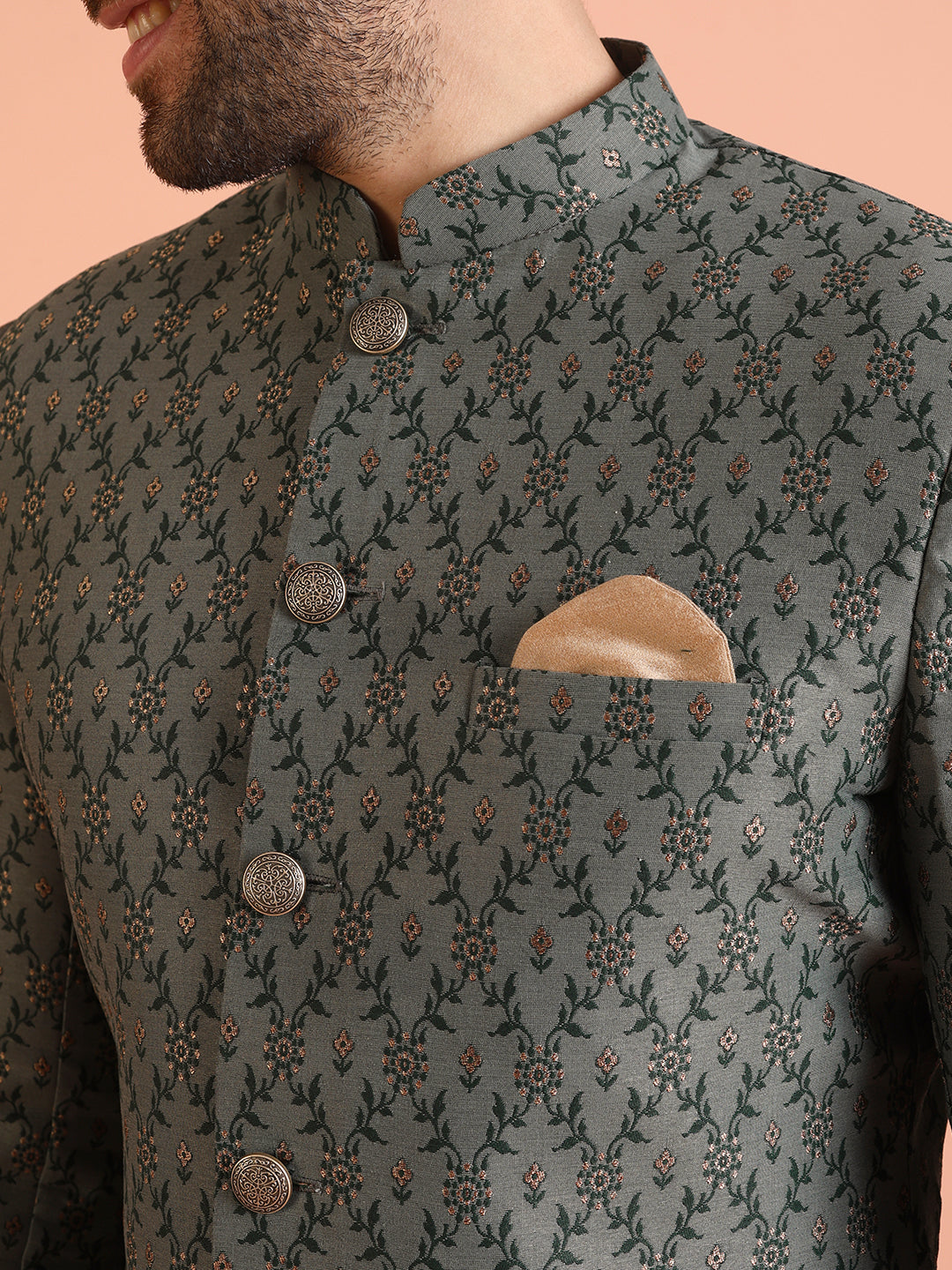 Experience classic elegance with this Men Grey Jacquard Floral Indowestern Trouser Set. The Jacquard Pattern adds a refined touch, while the breathable Silk Blend fabric ensures comfort throughout the day. Ideal for festive events or casual wear, this Indowestern Trouser Set is a wardrobe essential..