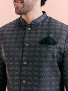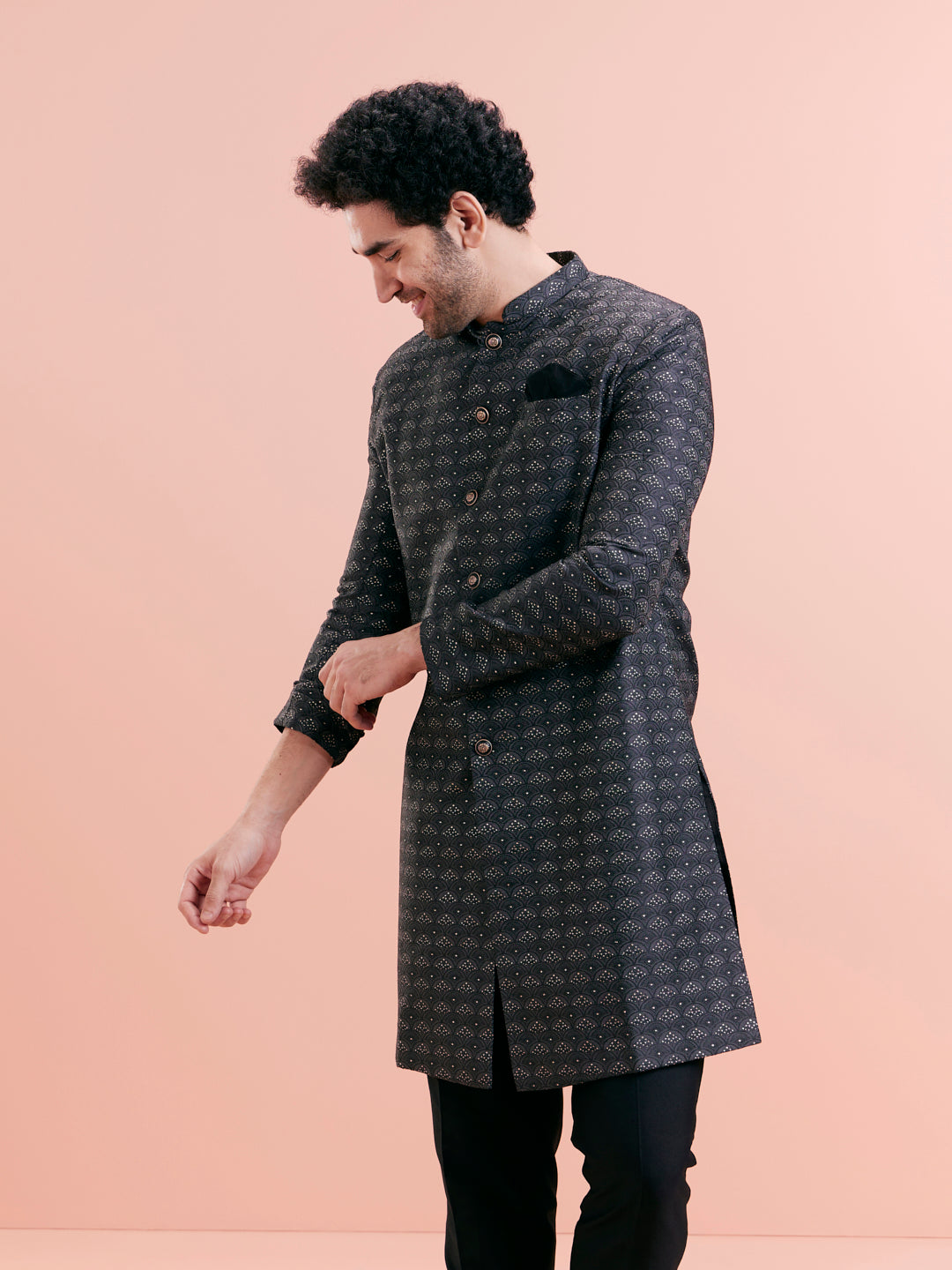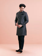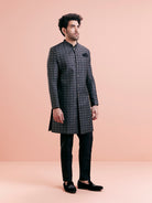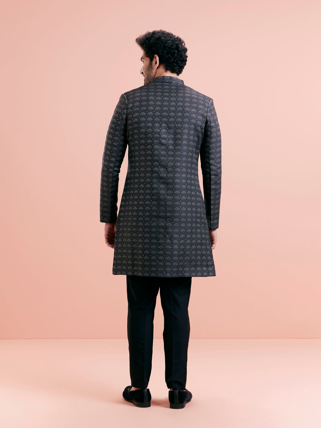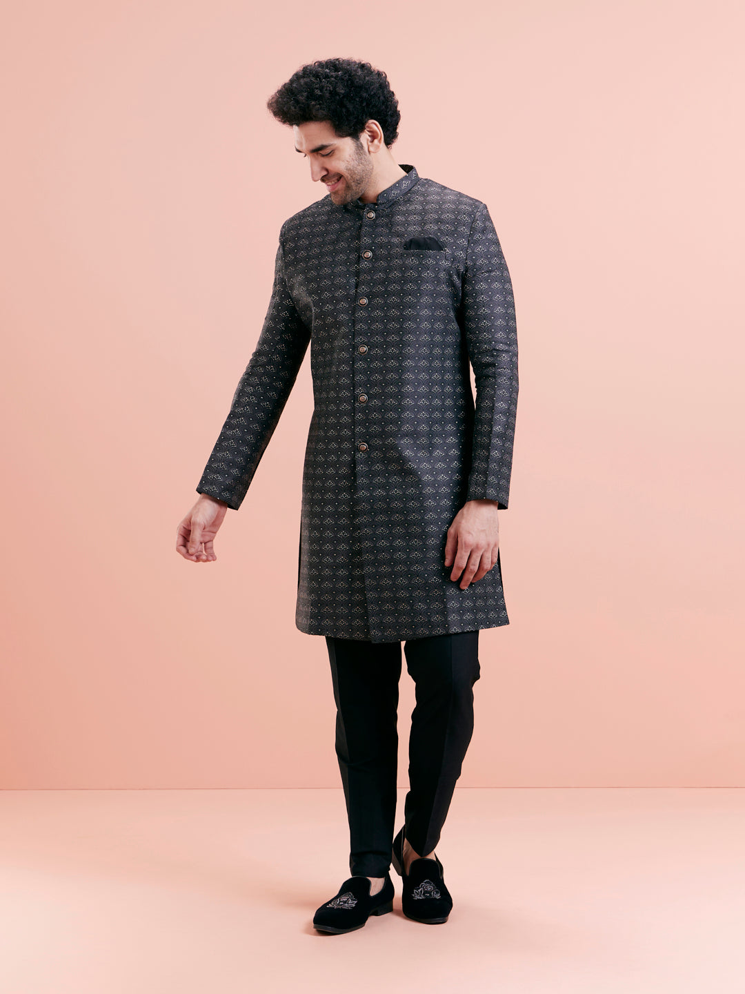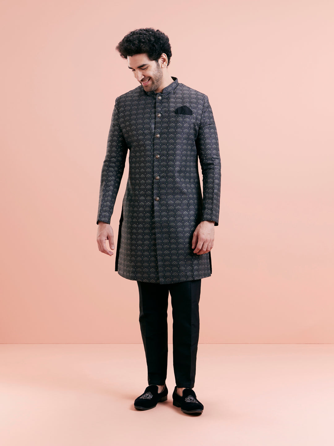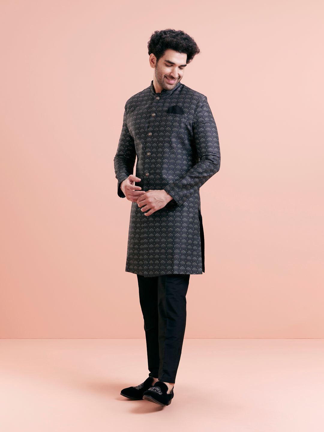 This Black Silk Blend Sherwani Trouser Set features a modern geometric texture crafted on a classic silhouette. The sherwani has side slits, mandarin collar, and elegant buttons. It comes with matching straight trousers, making it a refined ensemble for receptions, engagements or festive nights.