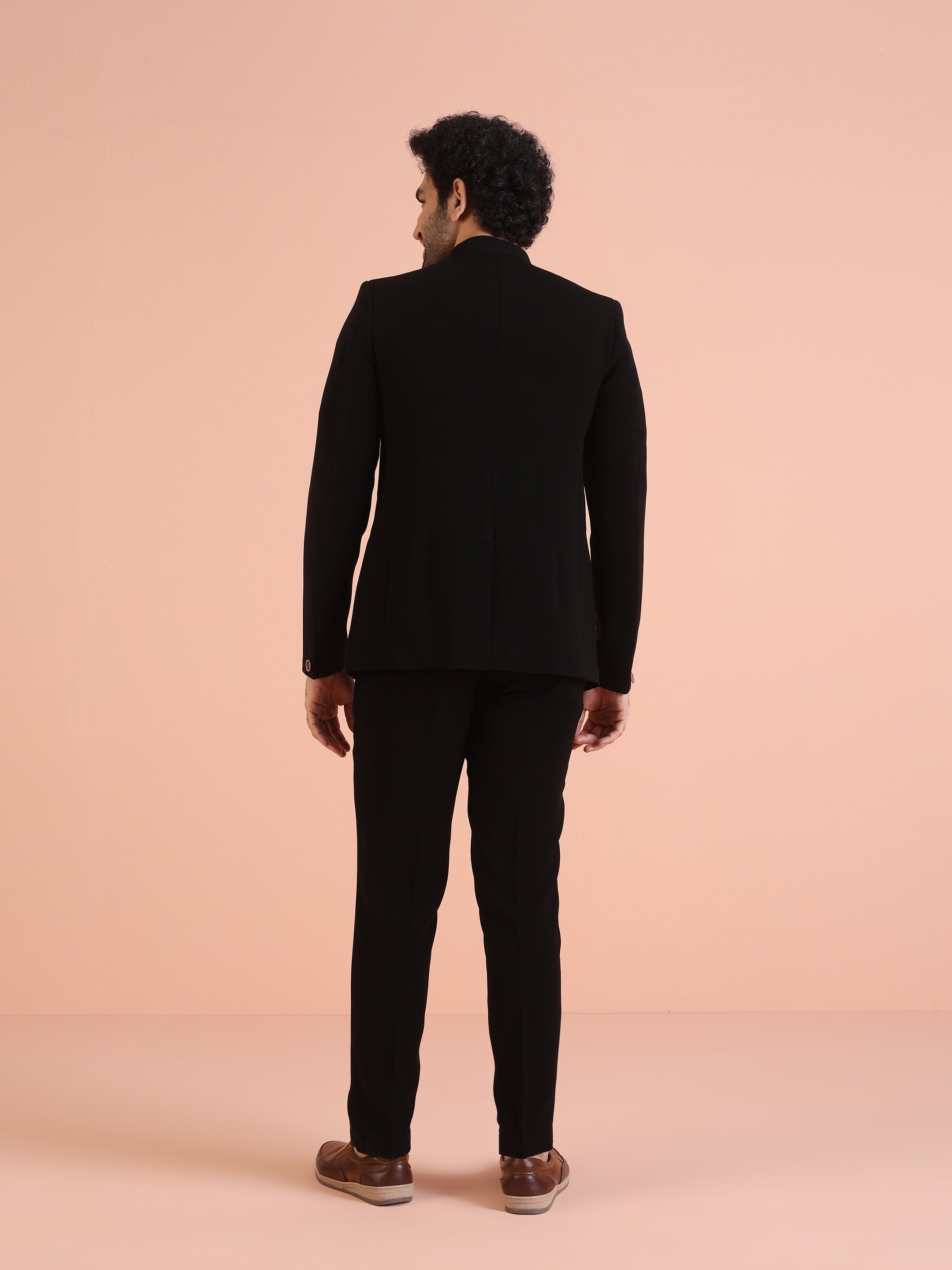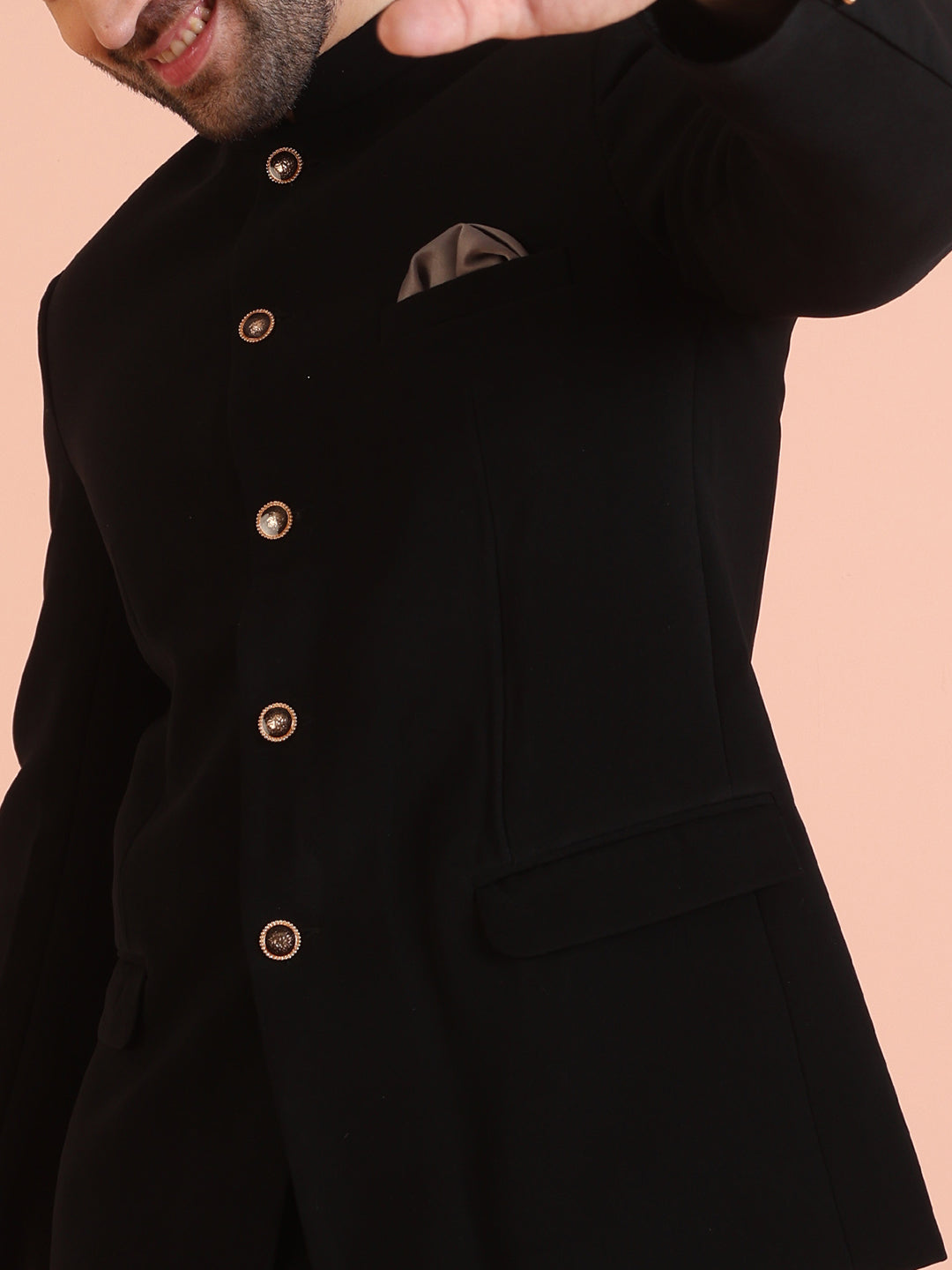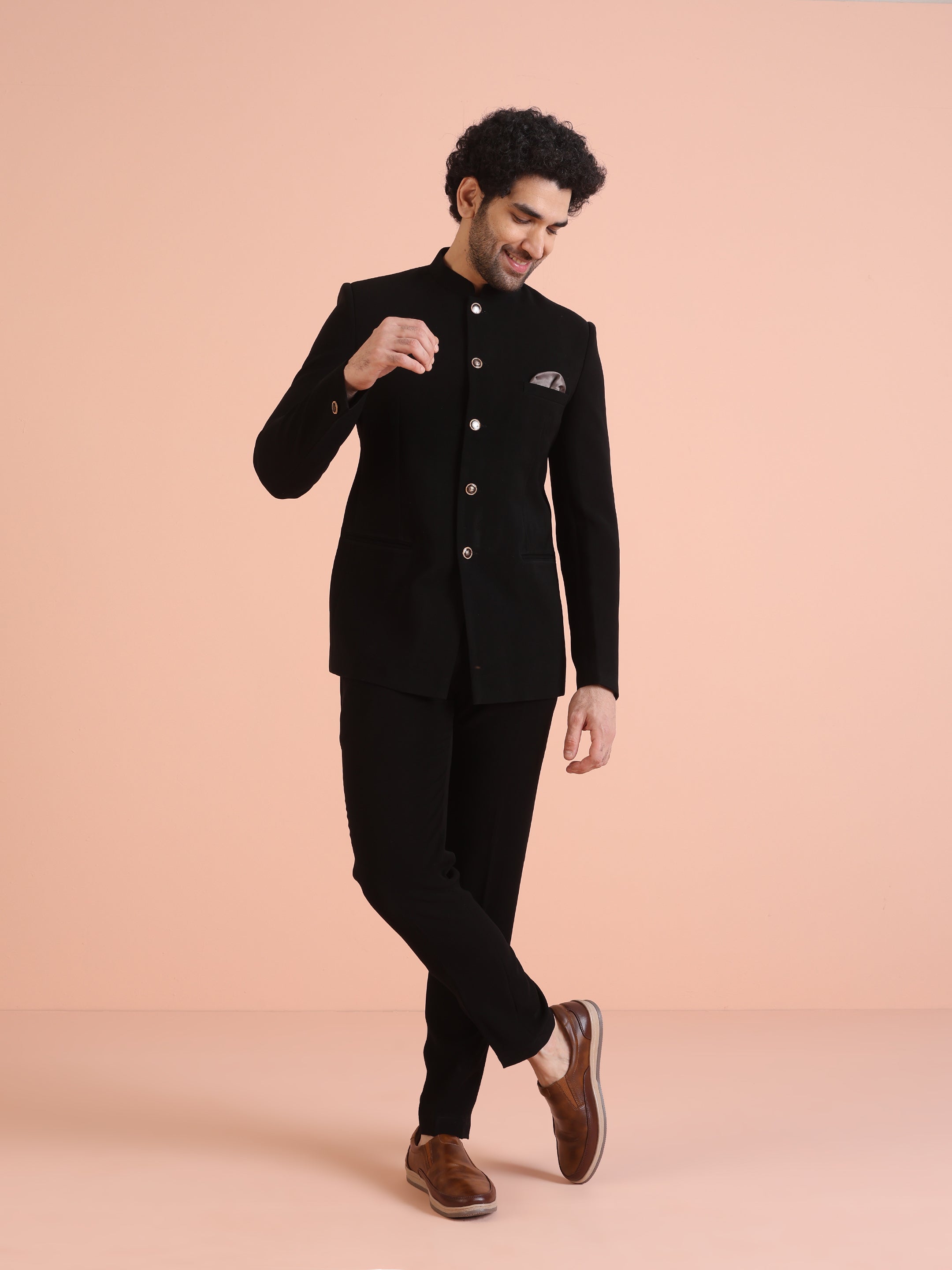 Experience classic elegance with this Men Black Solid Jodhpuri Bandhgala Trouser Set. The Solid Pattern adds a refined touch, while the breathable fabric ensures comfort throughout the day. Ideal for festive events or casual wear.