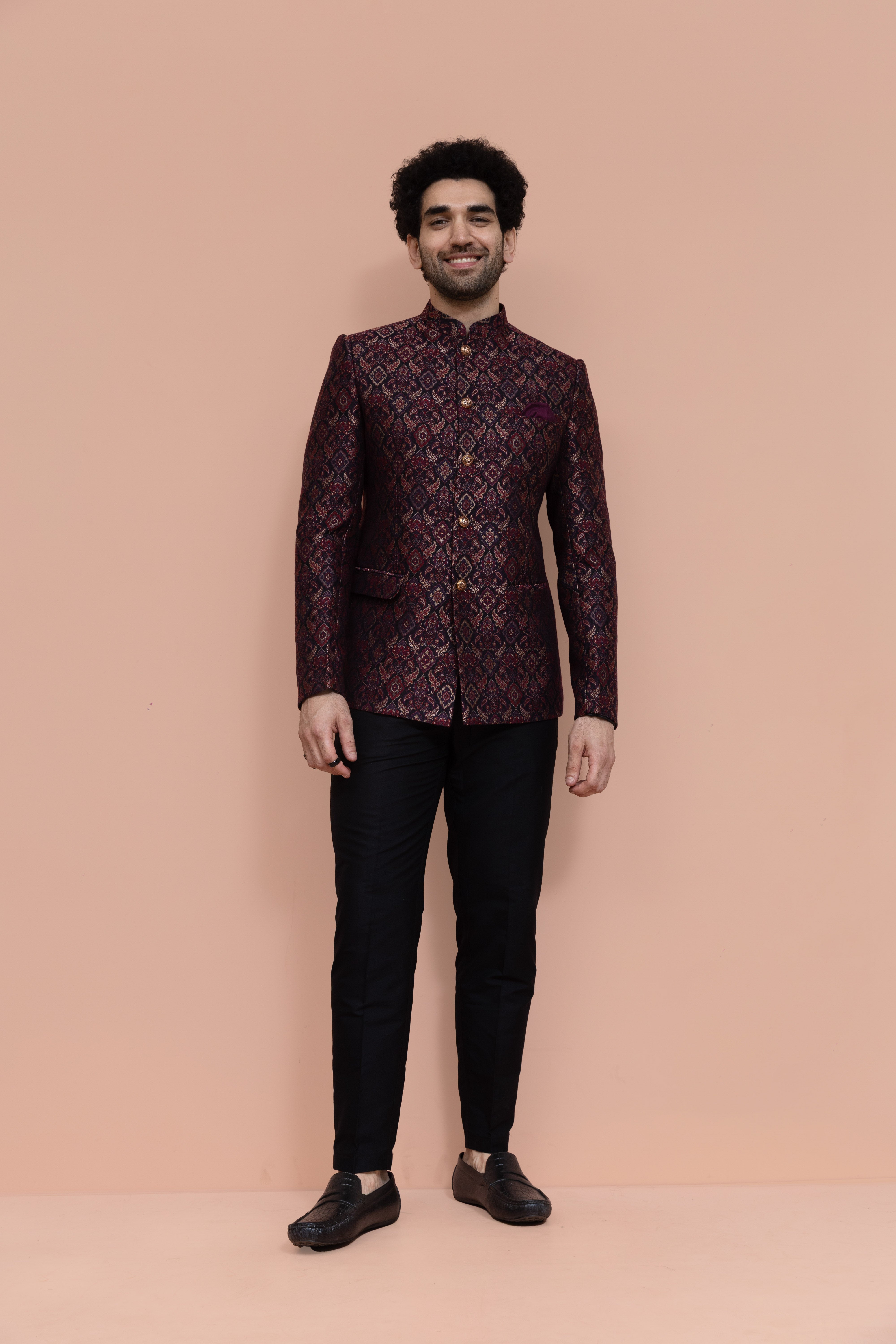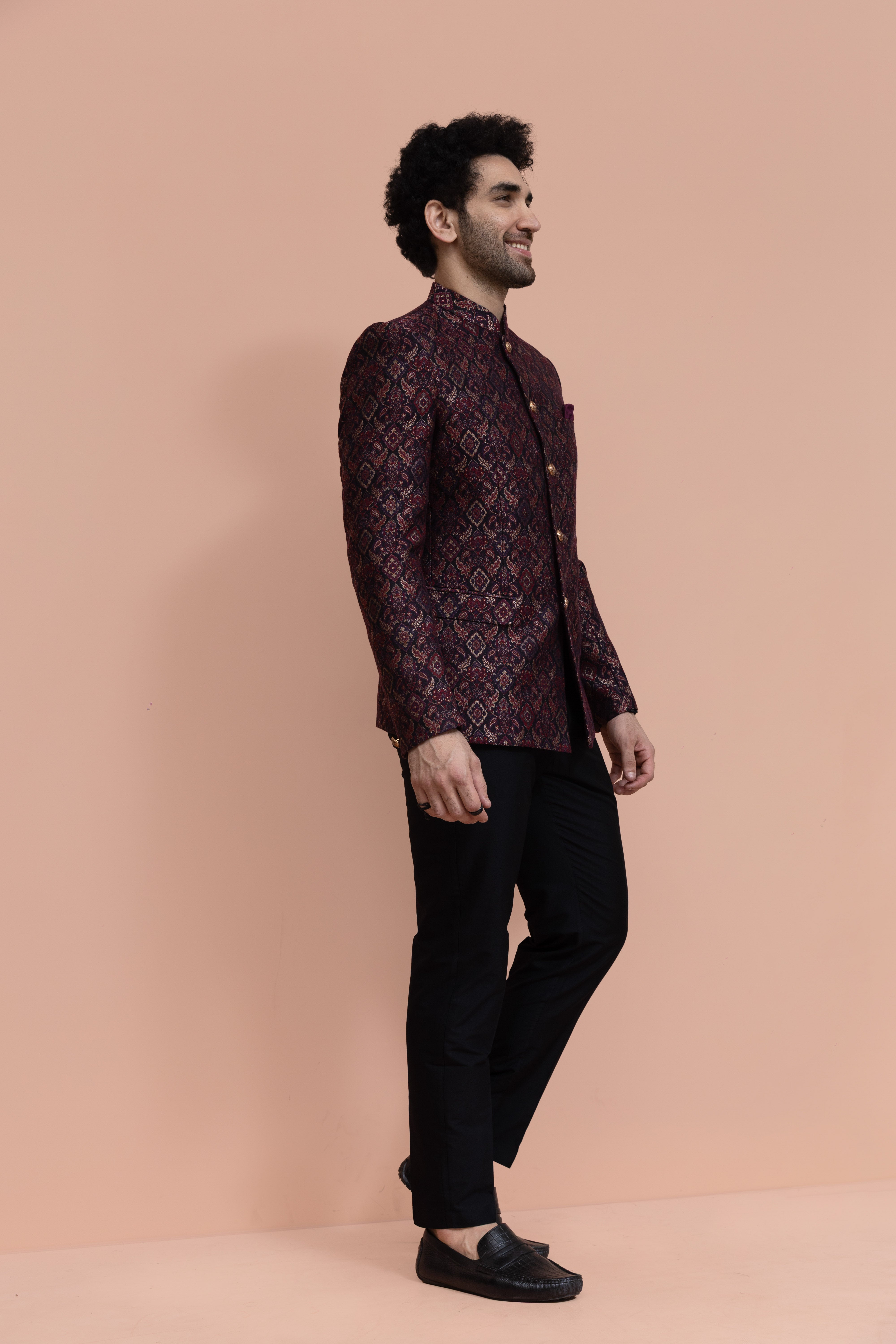 Make an unforgettable moment with this Maroon Woven Design Jodhpuri Bandhgala Trouser Set, designed to bring elegance and charm to every celebration. The rich Jacquard fabric adds Ethnic Motifs and depth, while the expertly tailored fit ensures a sharp, comfortable look. Whether it’s a wedding, festive gathering, or cultural event, this ensemble blends tradition with a modern edge, refined yet effortlessly stylish.