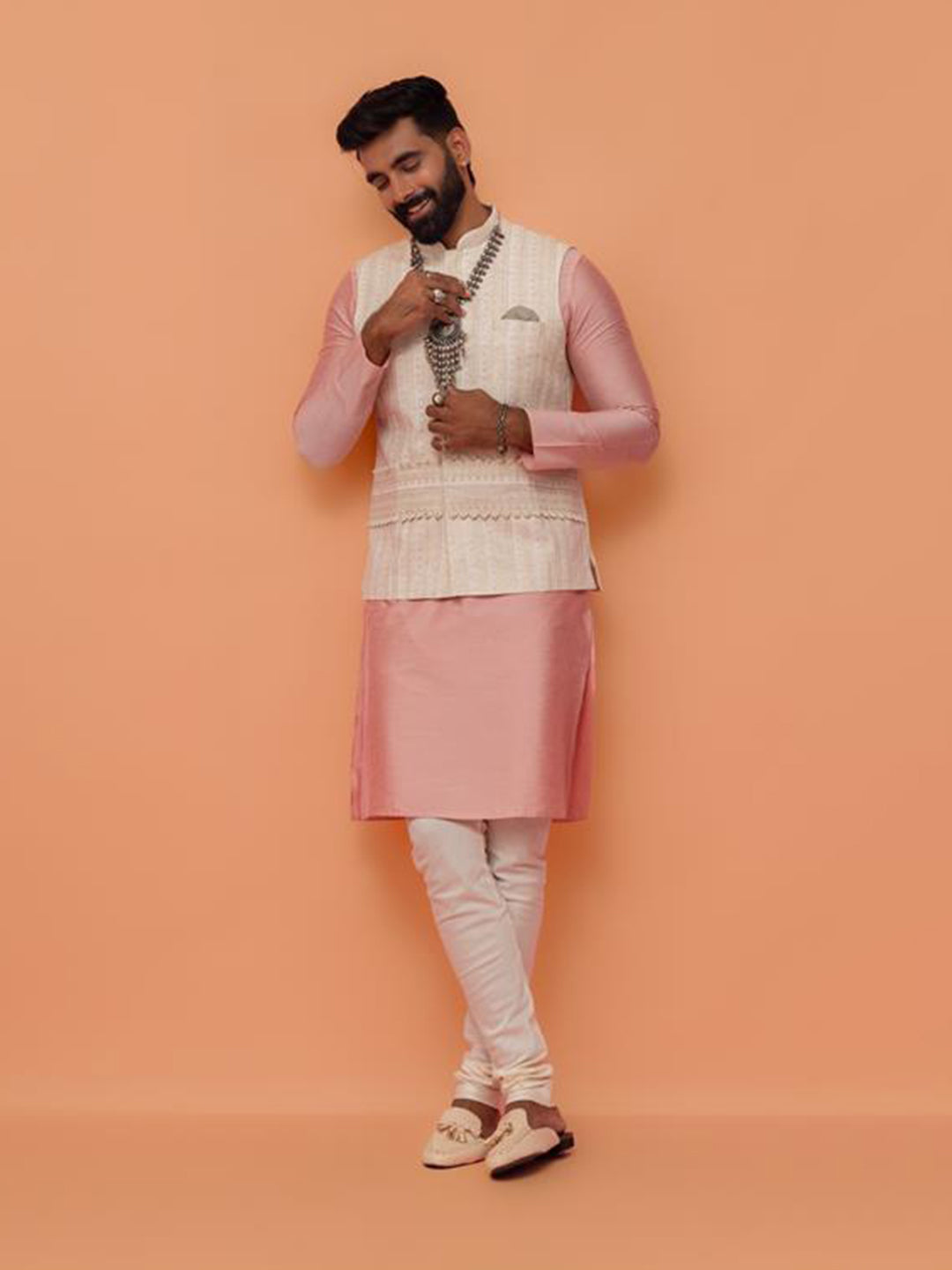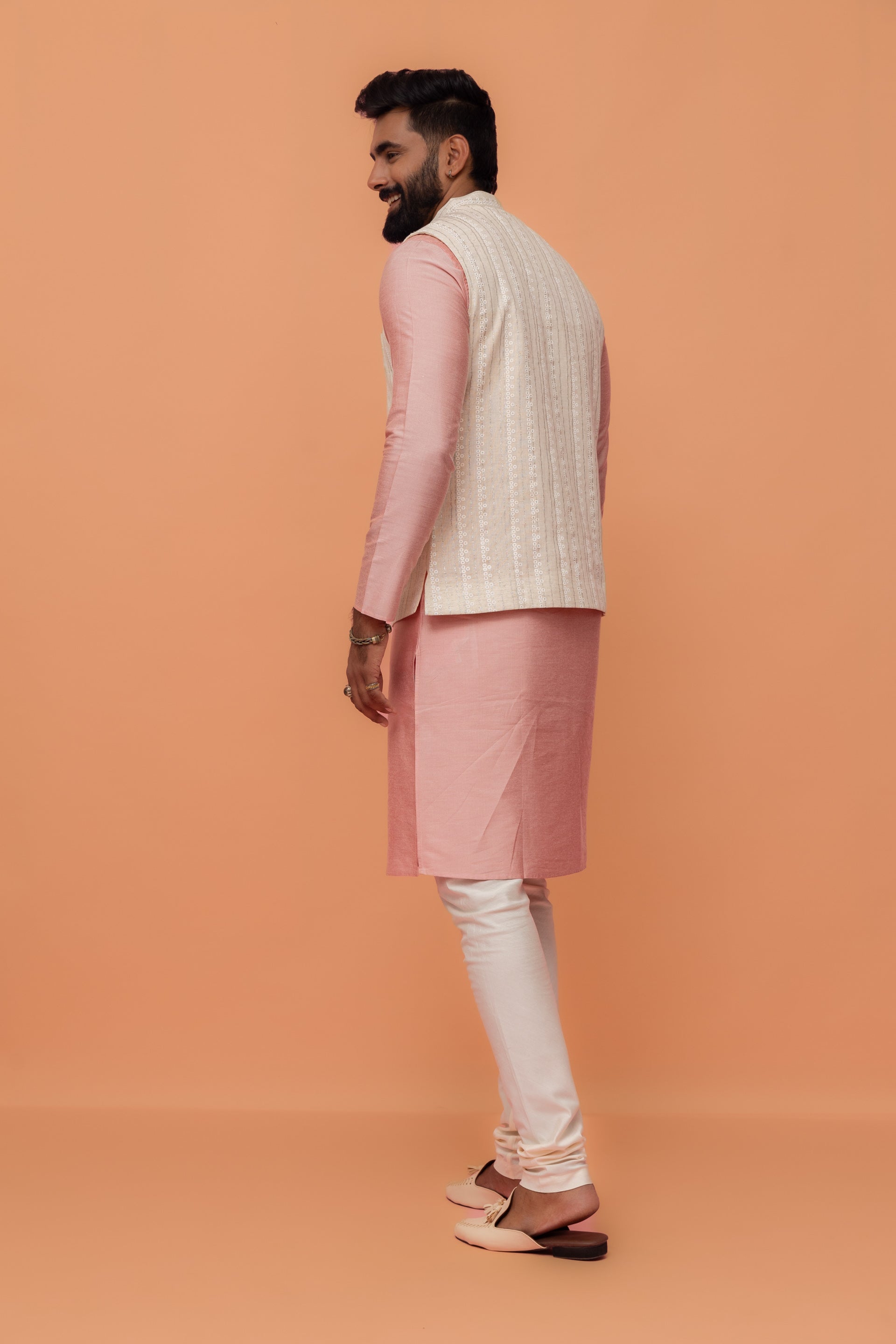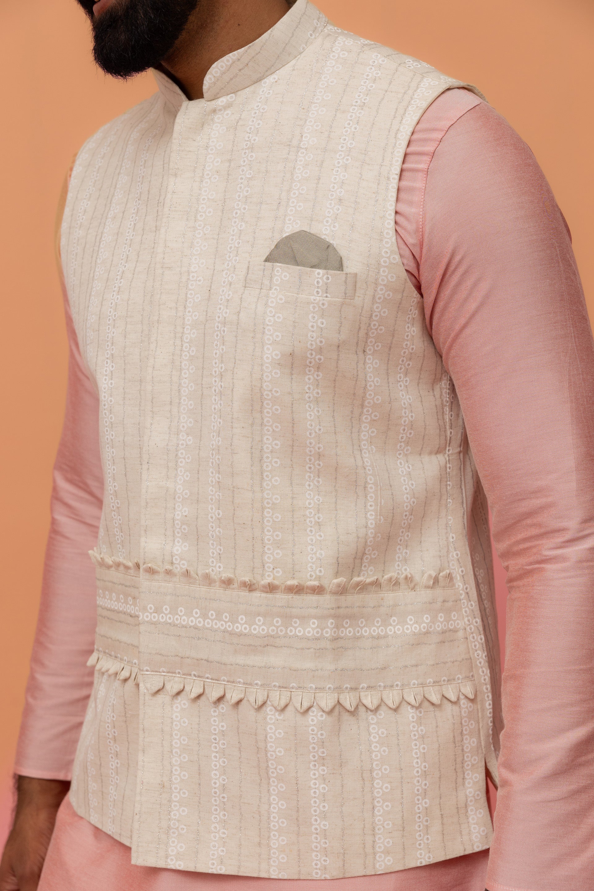 Experience classic elegance with this Kisah Men Beige Cotton Blend Geometric Pattern, Kurta Jacket Churidar Set. The breathable fabric ensures comfort throughout the day. Ideal for festive events or casual wear.