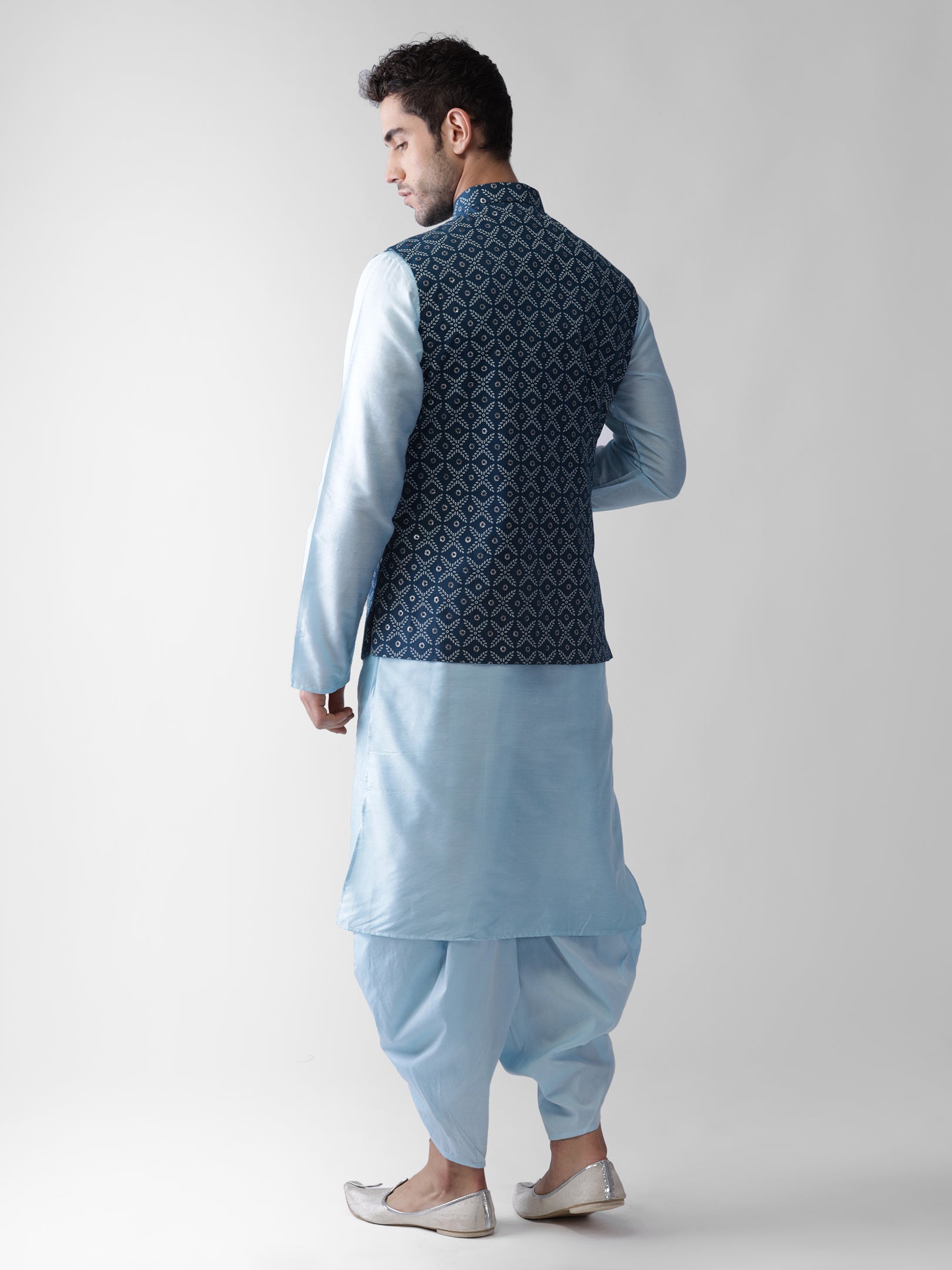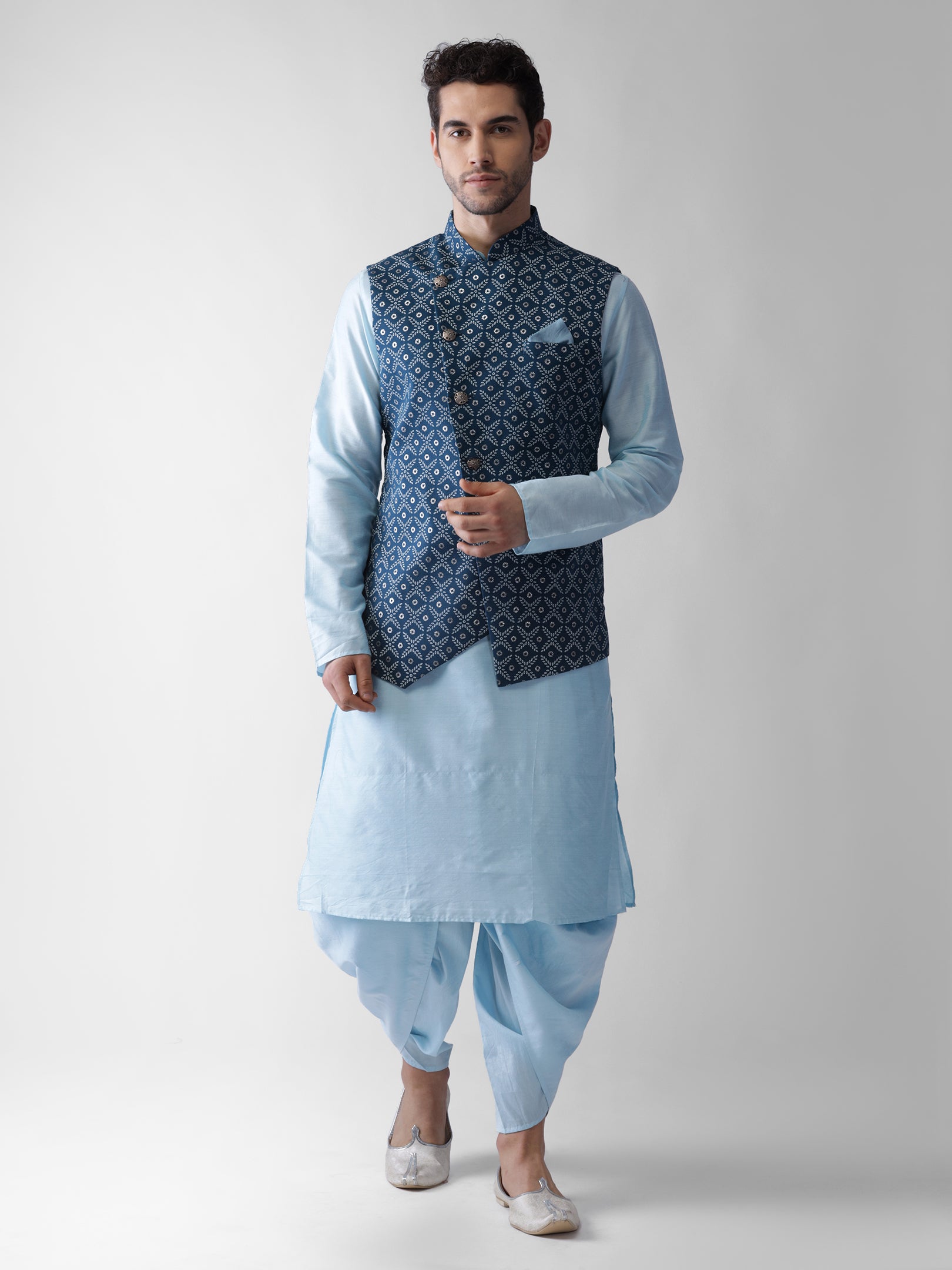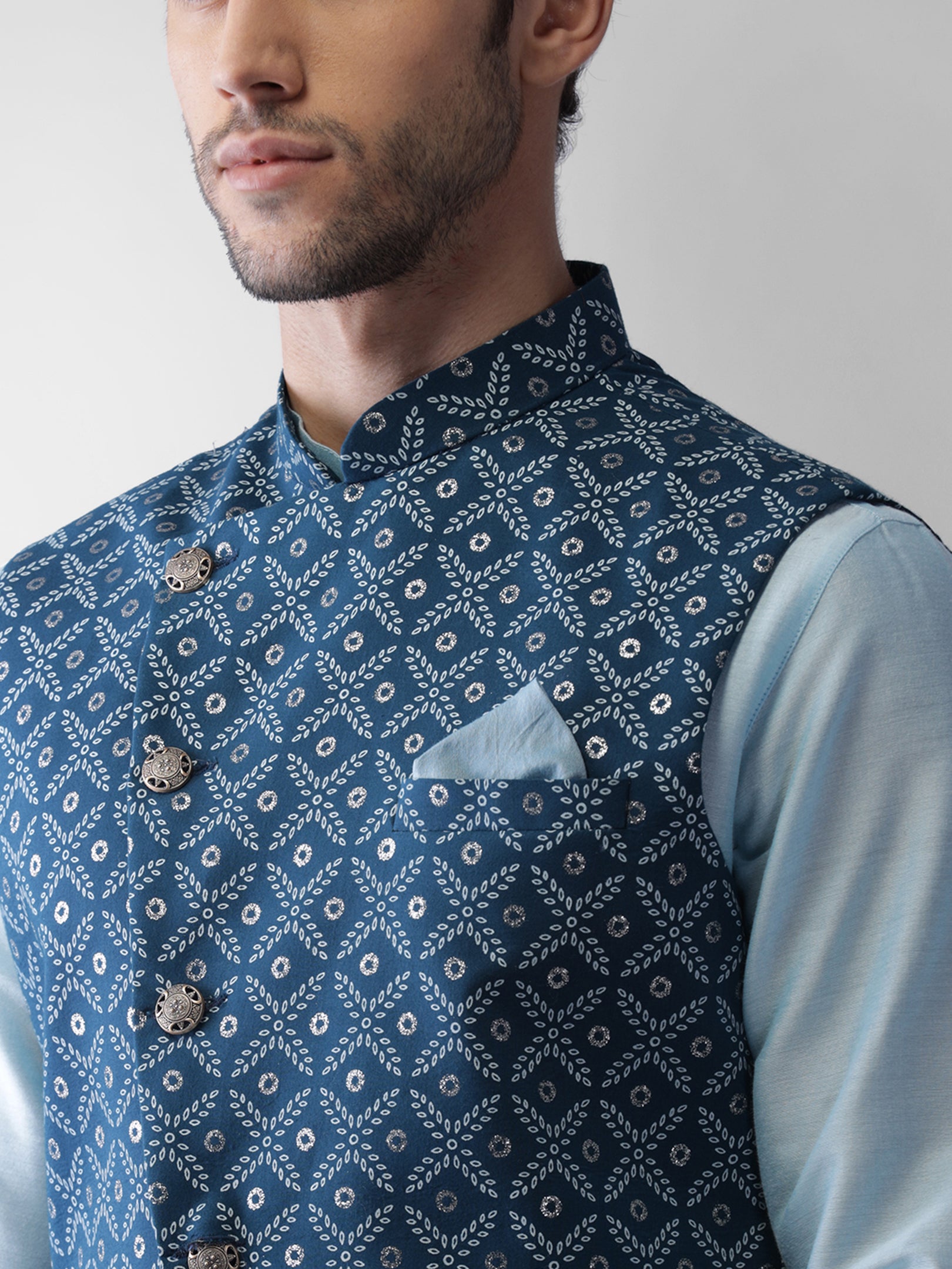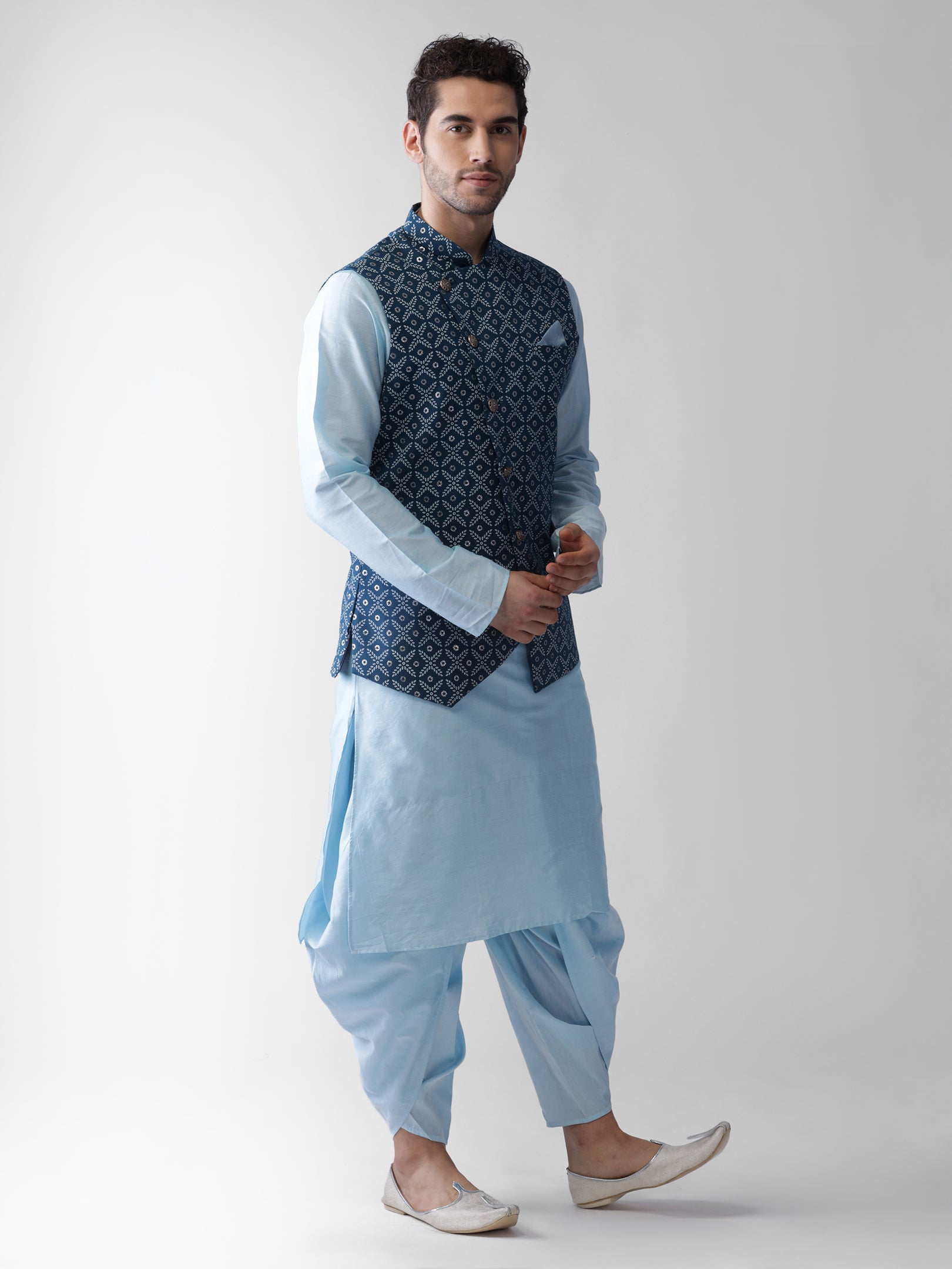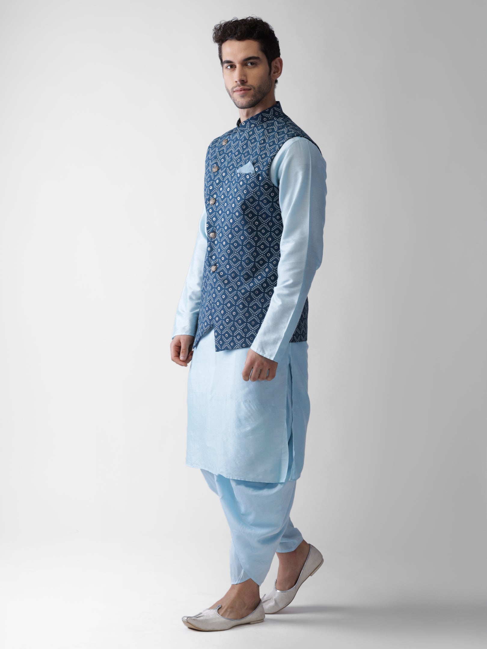 This Kurta Jacket Set with Blue Color is an elegant mandarin collar style that is perfect for occasional wear. With a full sleeve Stylish design and comfortable fabric, it will make you look stylish.