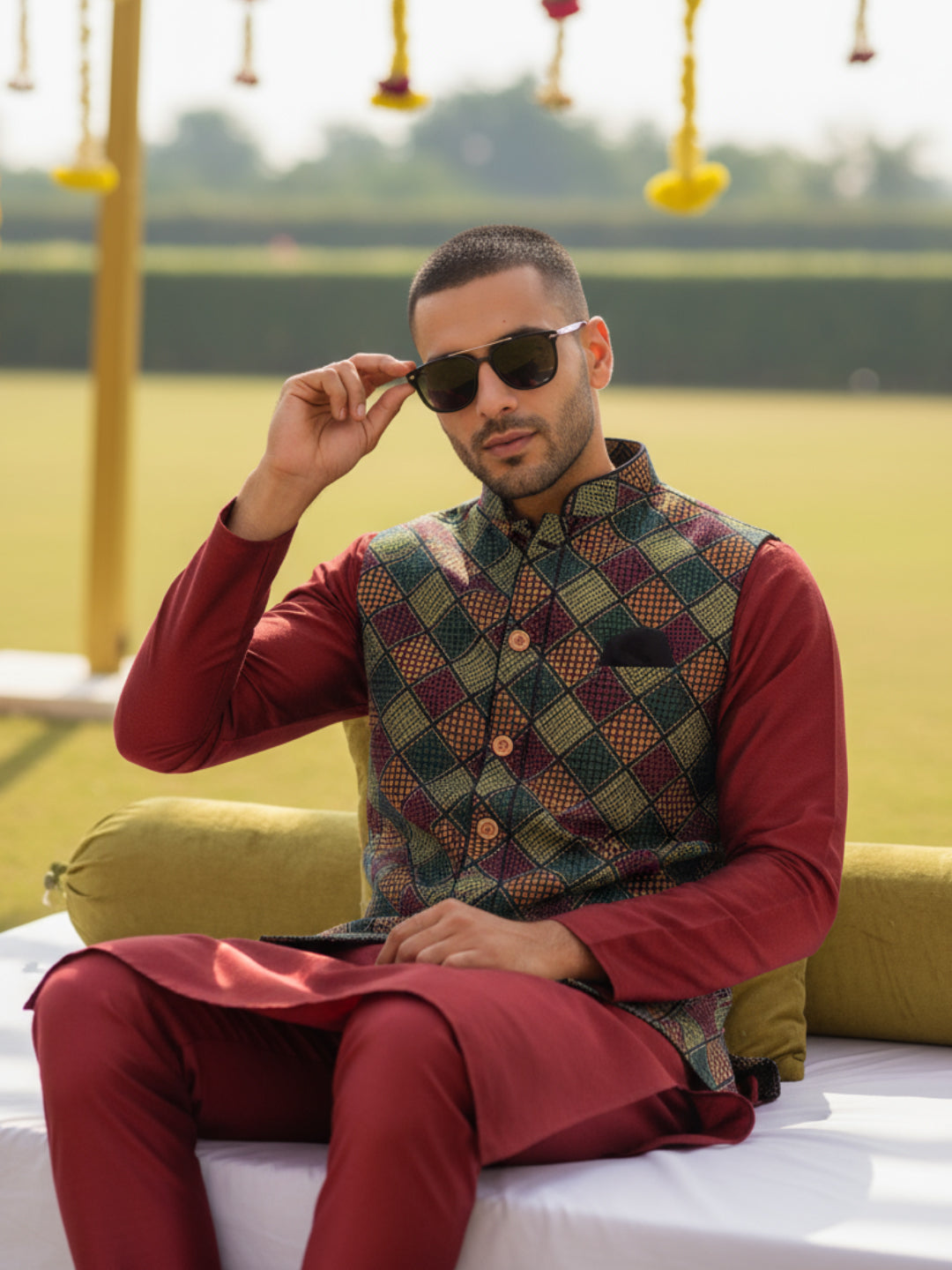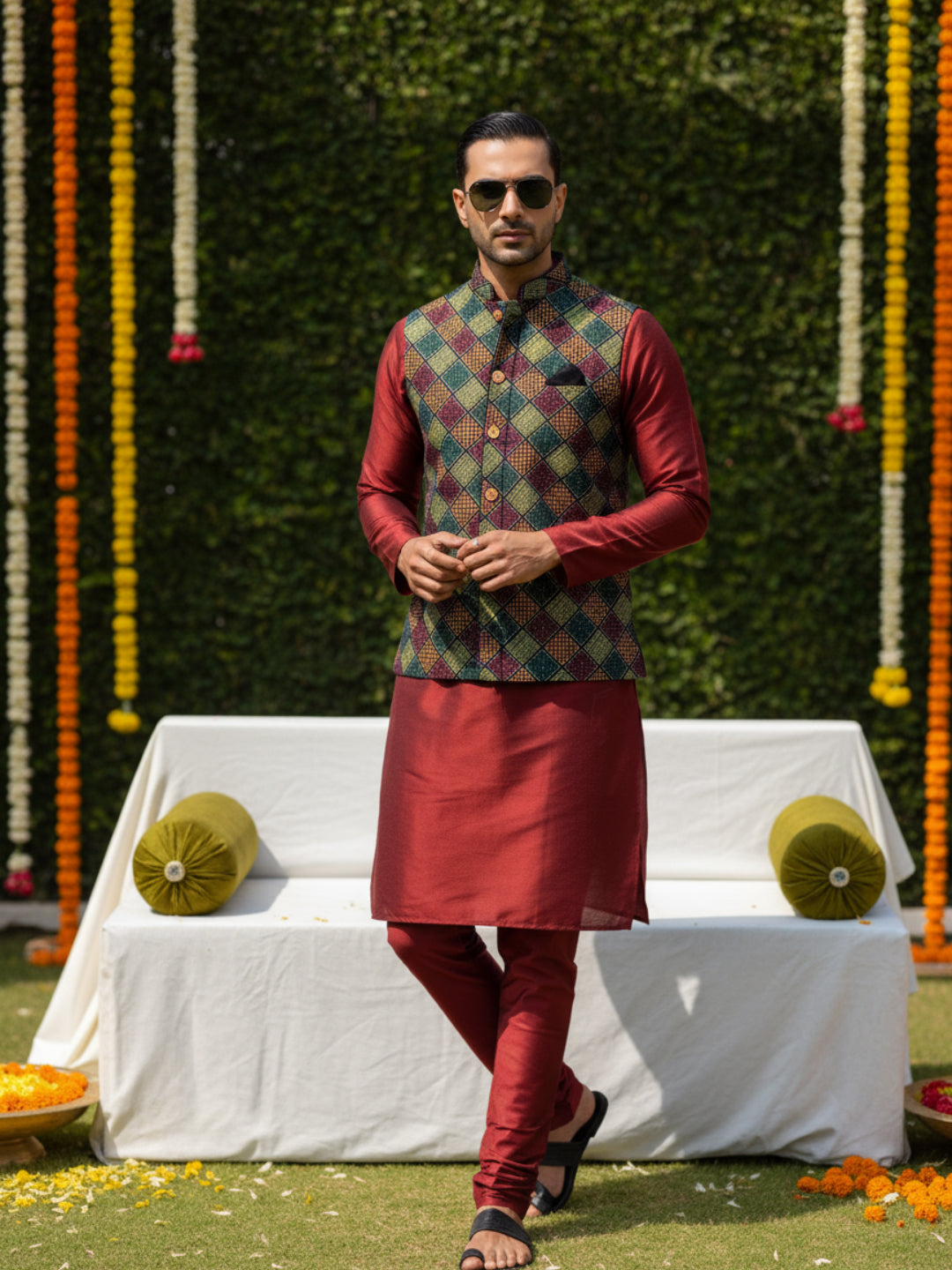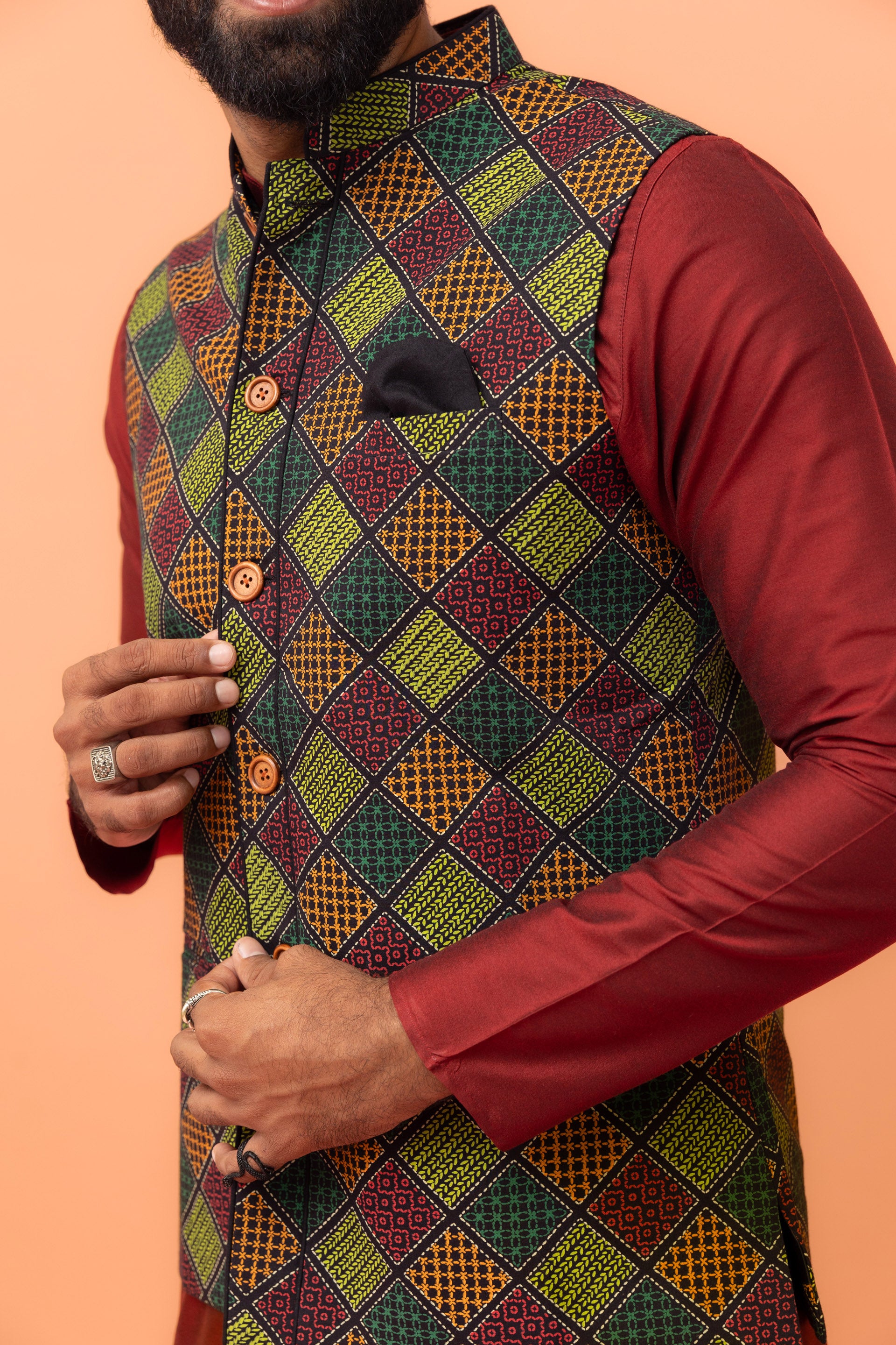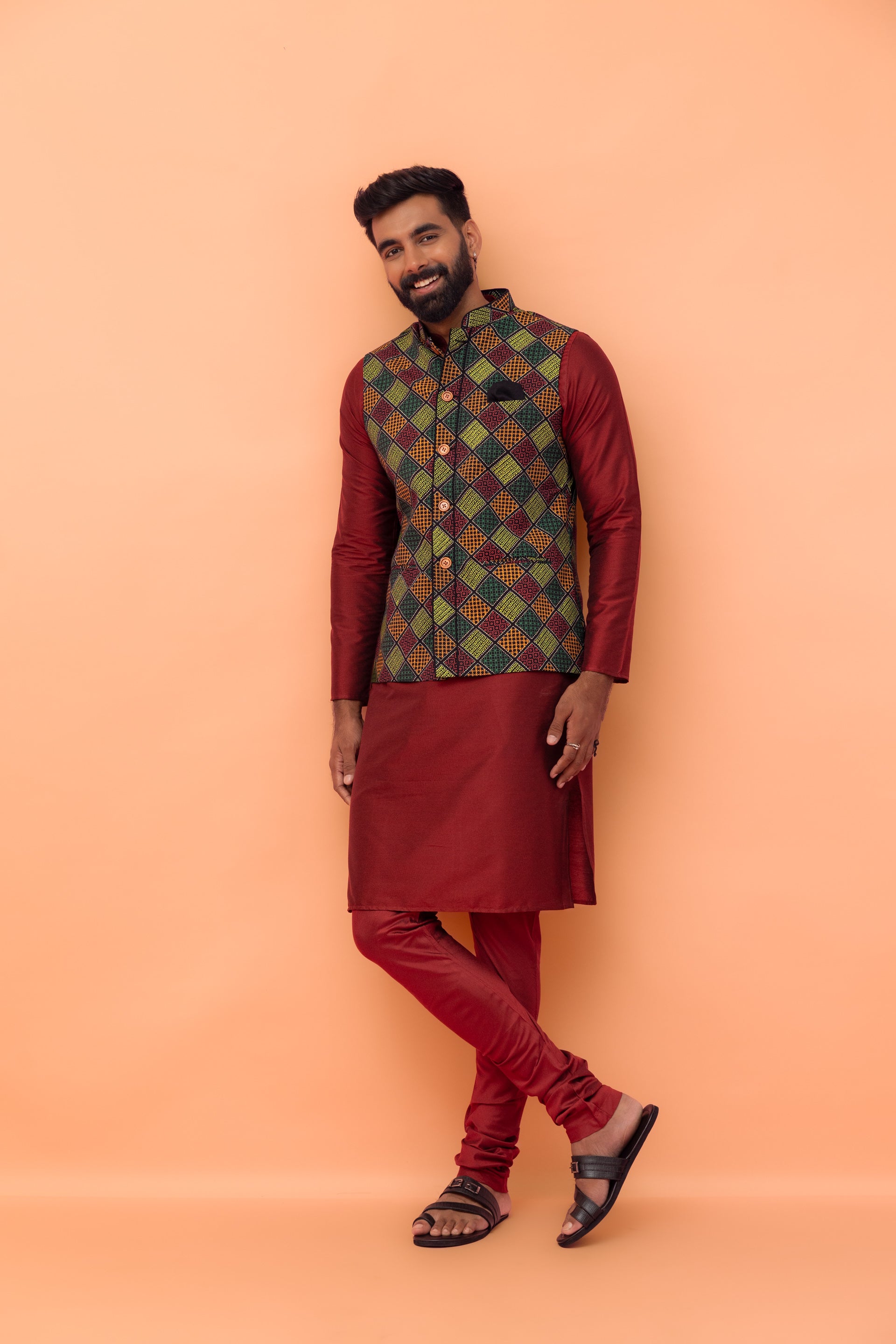 Experience classic elegance with this Kisah Men Multi Cotton Blend Geometric Pattern, Kurta Jacket Churidar Set. The breathable fabric ensures comfort throughout the day. Ideal for festive events or casual wear.