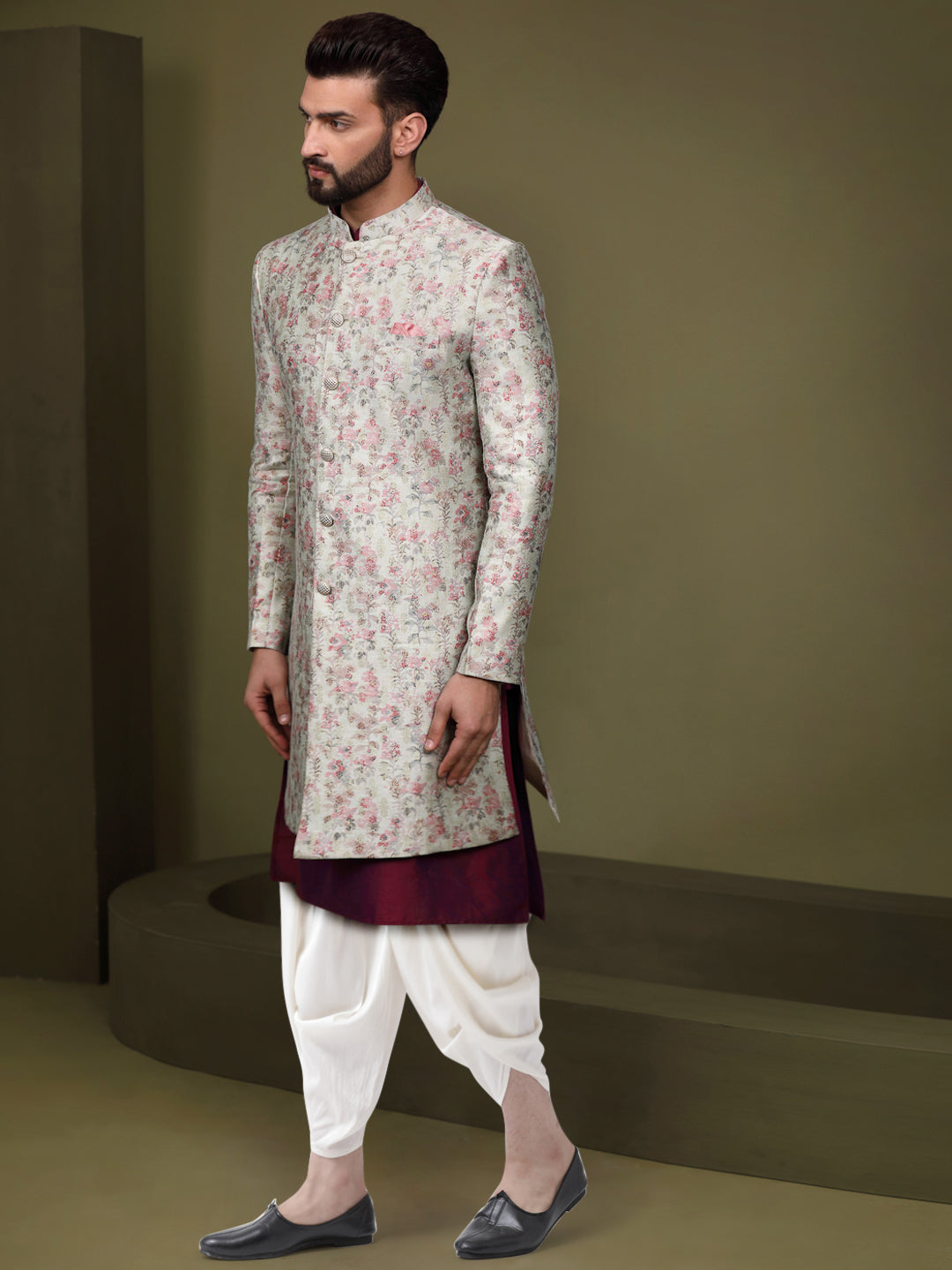 Cream Floral Silk Blend Sherwani Dhoti Set
