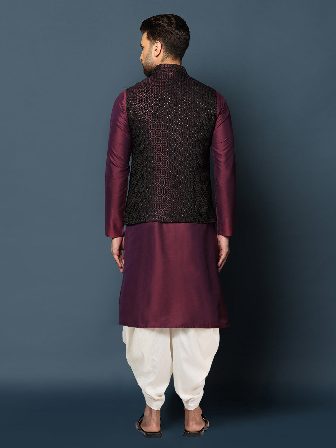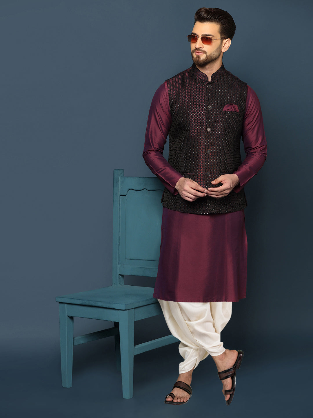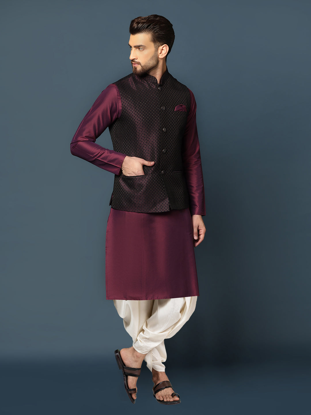 This Kurta Jacket Set with Wine Color is an elegant mandarin collar style that is perfect for occasional wear. With a full sleeve Woven Design design and comfortable fabric, it will make you look stylish.